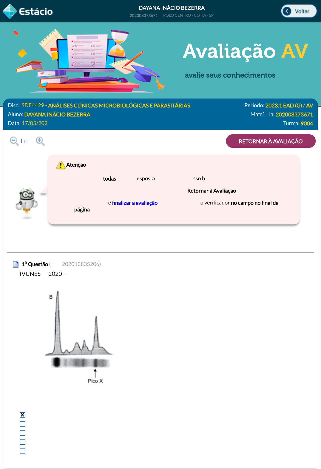 DAYANA INÁCIO BEZERRA Avaliação AV 202008373671 POLO CENTRO - COTIA - SP avalie seus conhecimentos Disc.: SDE4429 - ANÁLISES CLÍNICAS MICROBIOLÓGICAS E PARASITÁRIAS Período: 2023.1 EAD (G) / AV Aluno: DAYANA INÁCIO BEZERRA Matrícula: 202008373671 Data: 17/05/2023 17:24:03 Turma: 9004 Lupa RETORNAR À AVALIAÇÃO 1a Questão (Ref.: 202013835206) (VUNESP - 2020 - EBSERH) Observe a �gura. A �gura refere-se a uma eletroforese sérica em gel de agarose clássica de um paciente portador de uma determinada patologia. Respectivamente, qual é a fração proteica comtemplada no pico X e a patologia citada? Gama; mieloma múltiplo. Beta; paracoccidioidomicose. Alfa-2; leucemia. Alfa-1; dengue. Albumina; esclerose múltipla. Atenção 1. Veja abaixo, todas as suas respostas gravadas no nosso banco de dados. 2. Caso você queira voltar à prova clique no botão "Retornar à Avaliação". 3. Não esqueça de �nalizar a avaliação colocando o código veri�cador no campo no �nal da página. javascript:voltar_avaliacoes() javascript:diminui(); javascript:aumenta(); javascript:alert('C%C3%B3digo da quest%C3%A3o: 5424168\n\nStatus da quest%C3%A3o: Liberada para Uso.'); javascript:ir_finalizar(); 2a Questão (Ref.: 202013835113) (Prefeitura Municipal de Ji-Paraná IBADE - 2018) O grá�co de Levey-Jennings é a representação mais comum para �ns de avaliação dos resultados de controle de qualidade de um laboratório. Com base na interpretação desta ferramenta de análise, é correto a�rmar que: o grá�co é incapaz de representar distorções sistemáticas de um método. a visualização de duas observações sequenciais, ou observações para duas amostras de Controle de Qualidade na mesma análise, que excedem 2,5 desvios padrões do valor-alvo, na mesma direção mostra distorções aleatórias. a visualização de dez observações analíticas para o mesmo lado do valor-alvo (média) mostra apenas a deterioração dos reagentes utilizados. uma observação analítica que excede mais de três desvios padrões da média mostra apenas a distorção aleatória dos dados. a faixa entre duas observações na mesma análise que excede 4 desvios padrões (R4s) mostra imprecisão analítica. 3a Questão (Ref.: 202014476982) No exame de urina, precisamos nos importar com a forma correta de coletar, transportar e armazenar esse material clínico, pois ele é muito instável e pode sofrer transformações de seus elementos a todo tempo. A primeira urina da manhã coletada em frascos é usada, por exemplo, para checar ¿Elementos Anormais e Sedimentos¿, exame conhecido como EAS. Quando o objetivo é realizar uma urinocultura, a urina pode ser coletada por jato médio. Acerca dos cuidados a serem tomados para realizar a coleta de urina em frascos para realização de exames que con�rmem infecção urinária, assinale a alternativa correta. O paciente deve coletar a primeira urina da manhã, desprezando o primeiro jato. O paciente deve, preferencialmente, coletar a urina no dia anterior ao exame. O paciente pode utilizar qualquer pote de plástica que tenha em casa para coleta da urina. O paciente deve estar de jejum para coletar a urina. O paciente não deve fazer higiene íntima antes de coletar a amostra. 4a Questão (Ref.: 202016216281) Sobre o tempo de crescimento das bactérias de acordo com os meios de cultura, analise as assertivas abaixo e assinale a alternativa CORRETA: Quando se tem uma suspeita de infecção por Mycobacterium, a incubação para cultivo precisa �car por mais 10 dias. PORQUE São considerados bactérias de espécies fastidiosas e precisam de mais tempo para crescer em meios de culturas. As duas assertivas estão corretas, e a segunda é uma justi�cativa correta da primeira. As duas assertivas estão corretas, mas a segunda não é uma justi�cativa correta da primeira. A primeira assertiva está errada, mas a segunda está correta. Nenhuma das assertivas estão corretas. A primeira assertiva está correta, mas a segunda está errada. 5a Questão (Ref.: 202012404097) javascript:alert('C%C3%B3digo da quest%C3%A3o: 5424075\n\nStatus da quest%C3%A3o: Liberada para Uso.'); javascript:alert('C%C3%B3digo da quest%C3%A3o: 6065944\n\nStatus da quest%C3%A3o: Liberada para Uso.'); javascript:alert('C%C3%B3digo da quest%C3%A3o: 7805243\n\nStatus da quest%C3%A3o: Liberada para Uso.'); javascript:alert('C%C3%B3digo da quest%C3%A3o: 3993059\n\nStatus da quest%C3%A3o: Liberada para Uso.'); Entre as diferentes provas bioquímicas utilizadas para identi�cação de bactérias, qual destas tem como objetivo observar a fermentação de açúcares? Descarboxilação de aminoácidos. Teste da oxidase. Ágar TSI. Prova VP. Degradação da ureia. 6a Questão (Ref.: 202012515320) O protozoário Trichomonas vaginalis é causador de uma DST conhecida por tricomoníase. A respeito dessa patologia, marque a alternativa incorreta. Nas mulheres, a tricomoníase é responsável por provocar corrimentos abundantes de odor fétido. A tricomoníase tem sido frequentemente associada à transmissão do HIV. A tricomoníase, além de ser transmitida por via sexual, pode ser contraída pelo compartilhamento de objetos pessoais e pela ingestão de água contaminada. O Trichomonas vaginalis é um protozoário �agelado. A tricomoníase é uma doença que ataca principalmente o colo do útero, a vagina e a uretra feminina. 7a Questão (Ref.: 202012455361) Uma determinada moléstia que pode causar lesões nas mucosas, pele e cartilagens é transmitida por um artrópode e causada por um protozoário �agelado. Os nomes da doença, do artrópode transmissor e agente causador são, respectivamente: Doença do Gato, Toxoplasma gondii. Doença de Chagas, barbeiro e Trypanosoma cruzi; Malária, mosquito culex e Plasmodium vivax. Doença-do-sono, mosca tse-tsé e Trypanosoma cruzi; Úlcera de Bauru, mosquito �ebótomo e Leishmaniaspp; 8a Questão (Ref.: 202012403624) O Schistosoma mansoni é o