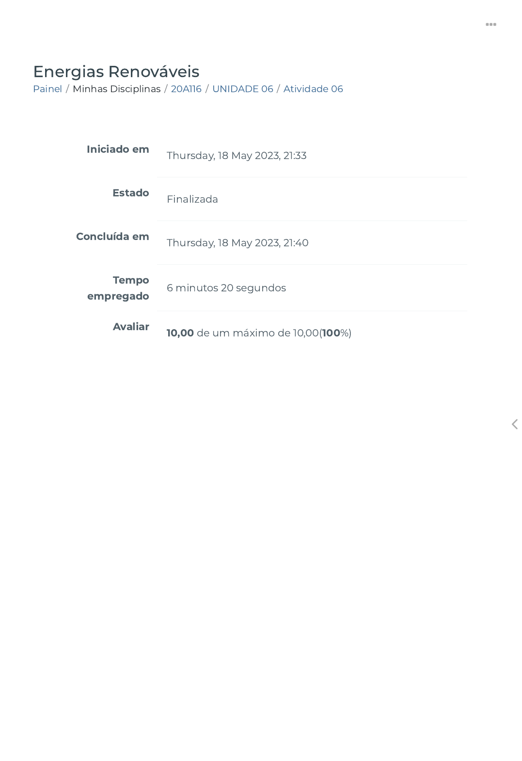 18/05/2023, 21:40 Atividade 06 https://ava.politecnicabr.com.br/mod/quiz/review.php?attempt=4905246 1/6 Painel / Minhas Disciplinas / 20A116 / UNIDADE 06 / Atividade 06 Energias Renováveis Iniciado em Thursday, 18 May 2023, 21:33 Estado Finalizada Concluída em Thursday, 18 May 2023, 21:40 Tempo empregado 6 minutos 20 segundos Avaliar 10,00 de um máximo de 10,00(100%) https://ava.politecnicabr.com.br/my/ https://ava.politecnicabr.com.br/course/view.php?id=952 https://ava.politecnicabr.com.br/course/view.php?id=952#section-7 https://ava.politecnicabr.com.br/mod/quiz/view.php?id=34756 https://ava.politecnicabr.com.br/ 18/05/2023, 21:40 Atividade 06 https://ava.politecnicabr.com.br/mod/quiz/review.php?attempt=4905246 2/6 Questão 1 Correto Atingiu 2,00 de 2,00 Relacione os impactos ambientais com a energia. Desmatamento e deserti�cação Poluição urbana do ar Chuva ácida Degradação marinha e de áreas costeiras Produção de lenha Uso de energia na indústria e no transp Queima de combustíveis fósseis na pro Produção de petróleo, navegação, mine https://ava.politecnicabr.com.br/ 18/05/2023, 21:40 Atividade 06 https://ava.politecnicabr.com.br/mod/quiz/review.php?attempt=4905246 3/6 Questão 2 Correto Atingiu 2,00 de 2,00 Podemos a�rmar que o Ibama é uma autarquia federal de direito público com autonomia administrativa e �nanceira, cuja missão é “proteger o meio ambiente e assegurar a sustentabilidade no uso dos recursos naturais, visando a promover a qualidade ambiental propícia à vida”. Escolha uma opção: Questão 3 Correto Atingiu 2,00 de 2,00 Podemos a�rmar que a usina hidrelétrica oferece inúmeras vantagens sobre os outros tipos de fonte de geração de energia elétrica. Entretanto, é a de maior custo de produção, seu despacho (acionamento) não é �exível, podendo, em curtíssimo espaço de tempo, disponibilizar uma quantidade substancial de energia elétrica. Escolha uma opção: Verdadeiro Falso Verdadeiro Falso https://ava.politecnicabr.com.br/ 18/05/2023, 21:40 Atividade 06 https://ava.politecnicabr.com.br/mod/quiz/review.php?attempt=4905246 4/6 Questão 4 Correto Atingiu 2,00 de 2,00 Podemos a�rmar que o nível de lucro de uma empresa está associado ao uso e�ciente de seus recursos. As decisões de investimento ou de investimento de capital dizem respeito a inúmeros projetos que podem e devem ser examinados com antecedência antes de serem aceitos ou descartados. Escolha uma opção: Verdadeiro Falso https://ava.politecnicabr.com.br/ 18/05/2023, 21:40 Atividade 06 https://ava.politecnicabr.com.br/mod/quiz/review.php?attempt=4905246 5/6 Questão 5 Correto Atingiu 2,00 de 2,00 É o prazo de retorno dos recursos investidos em um projeto e corresponde, dessa forma, ao período de recuperação do investimento. Sua medida é em tempo, pois responde pelo tempo necessário para a recuperação do investimento inicial do projeto, computando as entradas líquidas de caixa que virão no período subsequente à realização do investimento inicial. Escolha uma opção: a. VPL - Valor Presente Líquido b. Payback c. Present Value d. Sunk Costs Entre em Contato https://www.politecnicabr.com.br 0800 084 2627 0800 084 2627 Links Úteis Dicas da nossa Diretora Acadêmica Planner de Estudos Declaração de Matrícula Orientações do AVA Abertura de Ticket Fale com o Tutor Cronograma de Estudos Manual de Estágio Manual de Competência https://www.politecnicabr.com.br/ https://soundcloud.com/user-501638417/sets/escola-politecnica-brasileira https://storage.googleapis.com/sirius-pubstore/semestre_plannerdeestudo%20poli.pdf https://storage.googleapis.com/sirius-pubstore/declaracao_matricula.pdf https://storage.googleapis.com/sirius-pubstore/orientacoes_ava.pdf https://storage.googleapis.com/sirius-pubstore/abertura_ticket.pdf https://storage.googleapis.com/sirius-pubstore/fale_com_tutor.pdf https://storage.googleapis.com/sirius-pubstore/cronograma_estudos.pdf https://storage.googleapis.com/sirius-pubstore/manual_estagio.pdf https://storage.googleapis.com/sirius-pubstore/manual_competencia.pdf https://ava.politecnicabr.com.br/ 18/05/2023, 21:40 Atividade 06 https://ava.politecnicabr.com.br/mod/quiz/review.php?attempt=4905246 6/6 © 2022 - Escola Politécnica Brasileira Siga-nos nas redes sociais https://ava.politecnicabr.com.br/mod/quiz/0 https://www.facebook.com/politecnicabr https://www.instagram.com/politecnicabr_oficial https://ava.politecnicabr.com.br/