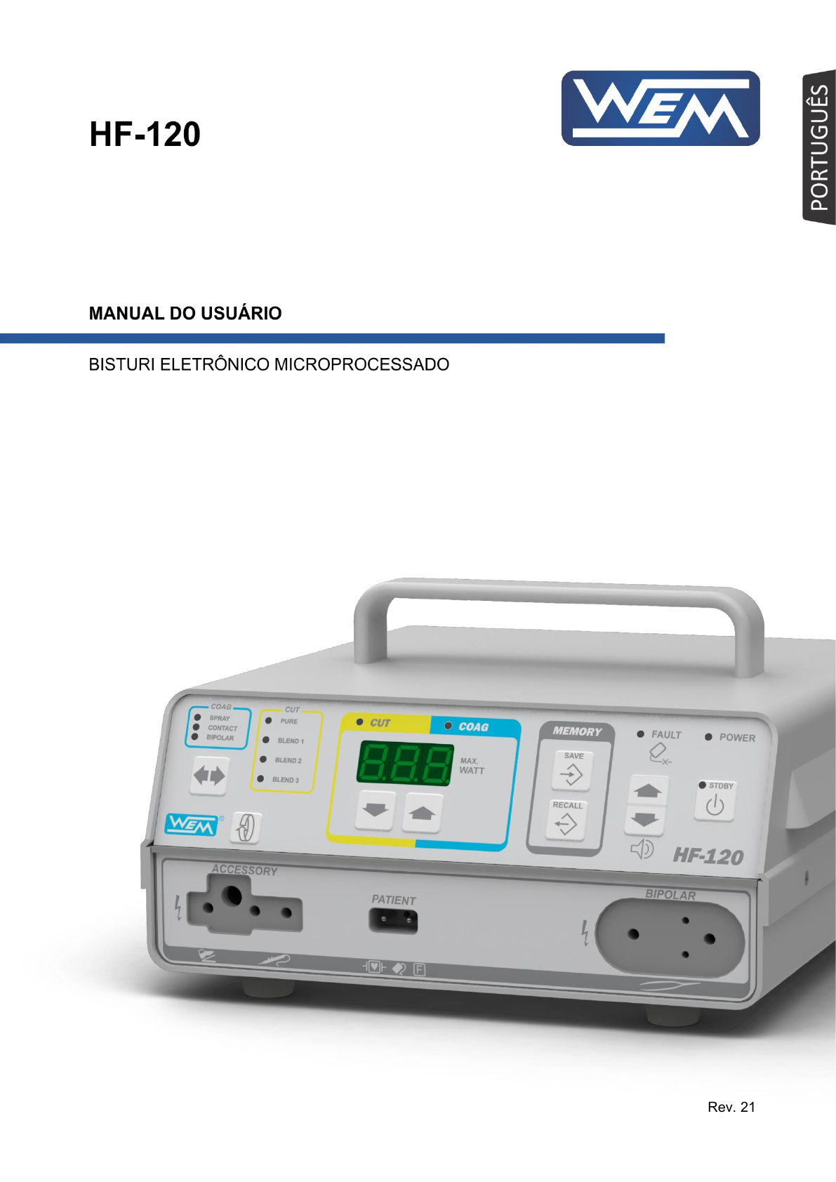 Rev. 21 WEM / Manual de Utilização HF-120 Rev. 21 1 MANUAL DE UTILIZAÇÃO BISTURI ELETRÔNICO MICROPROCESSADO MODELO HF-120 O Bisturi Eletrônico Microprocessado modelo HF-120 foi especialmente projetado para os mais variados tipos de cirurgia. Este equipamento trabalha com potências de até 100 Watts, oferecendo ao cirurgião e a equipe cirúrgica uma maior potência de trabalho. Apresentação O presente manual foi elaborado de forma a fornecer as informações necessárias ao usuário sobre o Bisturi Eletrônico Microprocessado modelo HF-120, quanto à sua operação, manutenção, conservação, transporte, características técnicas, seus cuidados gerais, informações gráficas, tais como desenhos, figuras e fotos, que possibilitem visualizar o produto na forma em que será entregue ao consumo e outras informações necessárias para o uso correto do equipamento. Marca: WEM Equipamentos Eletrônicos Ltda. Fabricante do equipamento e detentor do registro: WEM Equipamentos Eletrônicos Ltda. Rua Marechal Mascarenhas de Moraes, 550 - Lagoinha. CEP 14095-120 - Ribeirão Preto - São Paulo - Brasil Fone: (16) 3512-4600 Site: http://www.wem.com.br E-mail: wem@wem.com.br CNPJ: 54.611.678/0001-30 Inscrição Estadual: 582.181.462.110 Responsável Técnico: Engº Thiago Soares da Silva Fernandes – CREA-SP nº 5063009837 Nome técnico: Equipamento Cirúrgico de Alta Frequência Nome comercial: Bisturi Eletrônico Microprocessado Modelo comercial: HF-120 Registro na ANVISA nº: 10247670035 Covidien Ireland Limited IDA Business & Technology Park, Tullamore, Ireland. Telephone: + 353 (0) 57 93 27269 Genova.Silveira Highlight WEM / Manual de Utilização HF-120 Rev. 21 2 A T E N Ç Ã O Para maior segurança: a) Leia e entenda todas as instruções contidas neste Manual de Utilização antes de instalar ou operar este equipamento. b) Certifique-se de que todas as instruções estejam informadas no conteúdo deste manual. Este manual deve ser lido por todos os operadores deste equipamento. Este manual é fornecido somente na versão impressa. Este manual foi redigido originalmente no idioma Português. “A WEM Equipamentos Eletrônicos Ltda. se reserva o direito de efetuar qualquer alteração nos dados fornecidos neste manual bem como nas características do equipamento, sem prévio aviso”. MU_HF120 1ª Edição 04/05/18 WEM / Manual de Utilização HF-120 Rev. 21 3 Conteúdo 1 – Identificação 1.1 – Nome e modelo 1.2 – Descrição do equipamento 1.3 – Partes e peças 1.4 – Princípio físico e fundamentos da tecnologia do equipamento, aplicados para seu funcionamento e sua ação 1.5 – Acessórios acompanhantes 1.6 – Opcionais, materiais de apoio e materiais de consumo 1.6.1 – Opcionais 1.6.2 – Tensão de saída máxima 1.6.3 – Materiais de apoio 1.6.4 – Materiais de consumo 1.7 – Especificações e características técnicas 2 – Condições especiais de armazenamento, conservação e/ou manipulação do equipamento 3 – Instruções para uso do equipamento 3.1 – Condições de operação 3.2 – Conhecendo o painel dianteiro do equipamento 3.3 – Conhecendo o painel traseiro do equipamento 3.4 – Outros símbolos utilizados no equipamento 3.5 – Operando o equipamento 3.6 – Procedimento de finalização 4 – Advertências e/ou precauções a serem adotadas 4.1 – Advertências e/ou precauções durante o transporte e armazenamento 4.2 – Advertências e/ou precauções durante a instalação 4.3 – Advertências e/ou precauções durante a utilização 4.4 – Uso adequado da placa (eletrodo de retorno do paciente) 4.5 – Recomendações importantes para aplicação da placa 4.6 – Advertências, recomendações e cuidados em cirurgias 4.6.1 – Advertências em cirurgias 4.6.2 – Recomendações e cuidados em cirurgias 4.6.3 – Ajustes de potência 4.7 – Faiscamento em pinça hemostática não isolada para produzir coagulação 4.8 – Cuidados com acessórios 4.9 – Cuidados em cirurgias endoscópicas e laparoscópicas 4.10 – Advertências e/ou precauções durante a desinfecção e limpeza 5 – Desempenho do equipamento sobre requisitos essenciais de segurança e eficácia do equipamento médico, e eventuais efeitos secundários indesejáveis 5.1 – Indicação, finalidade ou uso a que se destina o equipamento 5.2 – Efeitos secundários ou colaterais indesejáveis e contra-indicações 5.3 – Segurança e eficácia do equipamento 6 – Instalação ou conexão a outros equipamentos 7 – Instalação, manutenção corretiva e preventiva 7.1 – Instalação do equipamento 7.2 – Uso com a unidade de transporte 7.3 – Plugue de força 7.4 – Aterramento Genova.Silveira Highlight WEM / Manual de Utilização HF-120 Rev. 21 4 7.5 – Tensão da rede elétrica 7.6 – Manutenção corretiva 7.7 – Manutenção preventiva e conservação 8 – Procedimentos adicionais para reutilização 9 – Procedimentos adicionais antes da utilização do equipamento 10 – Precauções em caso de alteração do funcionamento do equipamento 11 – Compatibilidade eletromagnética 12 – Sensibilidade a condições ambientais previsíveis nas situações normais de uso 13 – Precauções em caso de inutilização do equipamento 14 – Termo de responsabilidade Genova.Silveira Highlight Genova.Silveira Highlight WEM / Manual de Utilização HF-120 Rev. 21 5 1 – Identificação 1.1 – Nome e modelo Nome técnico: Equipamento Cirúrgico de Alta Frequência Nome comercial: Bisturi Eletrônico Microprocessado Modelo comercial: HF-120 1.2 – Descrição do equipamento O HF-120 é um equipamento cirúrgico de alta-frequência, totalmente microprocessado. Testado em um grande número de cirurgias, inclusive nos procedimentos laparoscópicos, o HF-120 demonstrou ser um equipamento eficiente, seguro e de manuseio extremamente simplificado. Possui formas de onda e níveis de potência de saída adequados a cada procedimento cirúrgico, produzindo cor