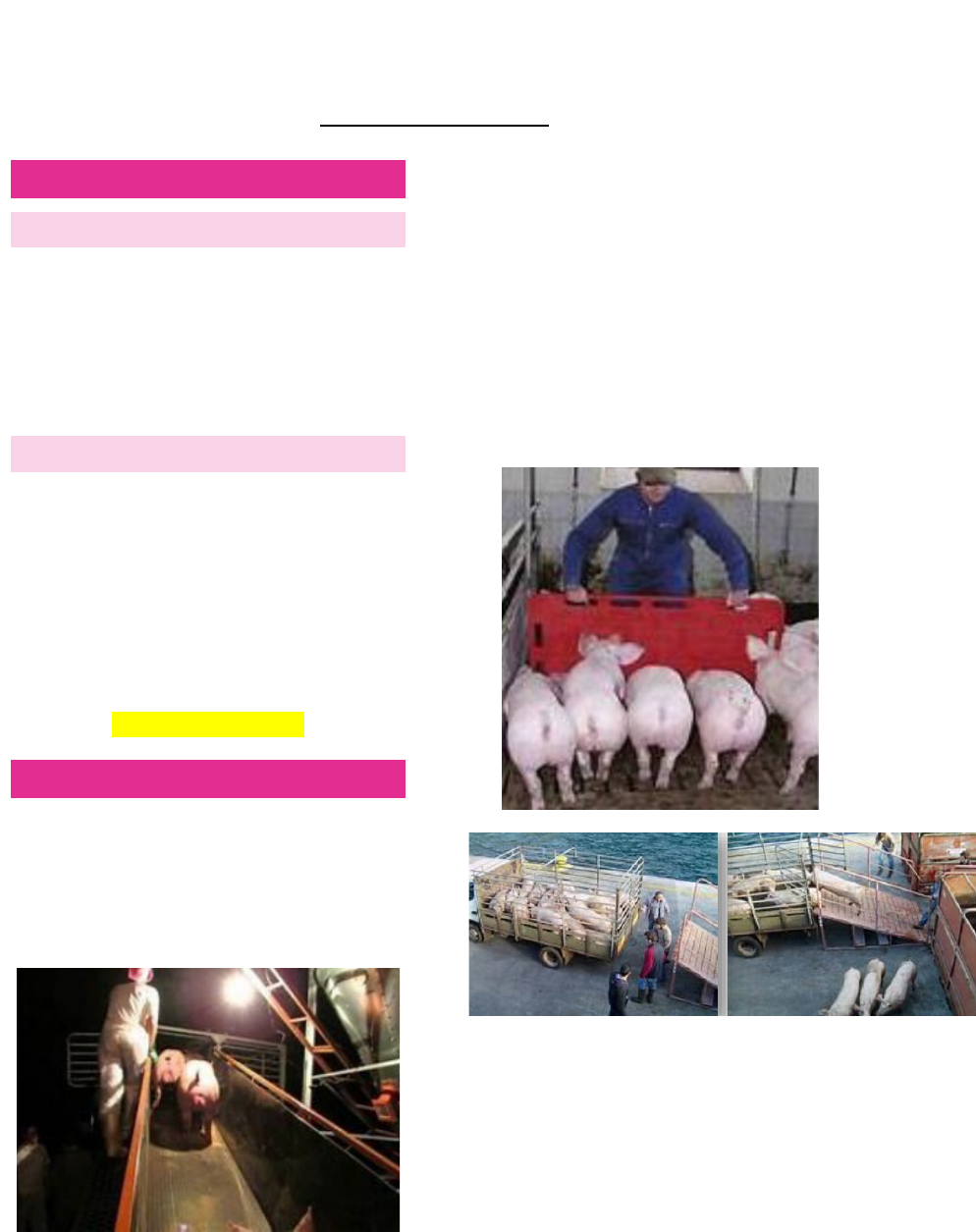 Aula 6: 03/04/2023Manejo ante mortem e abate de suínos Fluxograma Pré-abate 1. Manejo na propriedade rural 2. Embarque 3. Transporte 4. Desembarque 5. Manejo no frigorífico 6. Abate Abate 1. Insensibilização 2. Sangria 3. Escaldagem (PCC) 4. Depilação 5. Evisceração (PCC) 6. Resfriamento 7. Desossa 8. Cortes comerciais NÃO TEM ESFOLA Embarque · São necessários três elementos · Prevenção de acidentes, contusões · Cuidados apropriados · Ação imediata · Deve ser realizado cuidadosamente e por pessoas treinadas e capacitadas para faze-lo · Usar métodos alternativos de controle dos suínos em vez do que possam feri-los (bastões elétricos e uso de força), devem ser priorizados as lonas, pranchas, chocalhos · Pega-se uma prancha de plástico da altura do corredor e vai empurrando os suínos para não machucar eles · Embarque após 10 horas de jejum (retira a comida e deixa a água a vontade) · Acontece antes de ir para o frigorífico · Grupos de 10 a 15 animais · Transporte: 250 kg/m² Transporte · Transportadores treinados e capacitados sobre os cuidados no transporte e no bem-estar dos animais · Manter velocidade moderada e constante, realizar as curvas suavemente, evitando reduções e paradas bruscas · Evitar paradas durante o percurso, por aumentar o tempo de transporte e dificultar a ventilação · Cuidado: exposição dos suínos ao sol – ganho de calor por radiação agrava o estrese térmico · Para evitar o estresse térmico, deve-se molhar os animais em dias muito quentes Recepção · Verificar a documentação (GTA e nota fiscal) · Desembarque · Manejo calma e tranquilo · Pouco estresse (menor incidência de lesões) · Desembarque por compartimentos · Dar tempo necessário para que o primeiro suíno reconheça o ambiente e os demais sigam · Deve iniciar-se logo após a chegada do caminhão ao frigorífico · Usa-se o carrinho para a realização do processo, sendo importante que ele esteja sempre em bom estado de uso · Animais que não conseguirem ser removidos do caminhão devem ser abatidos com o abate emergencial Pocilgas – divisão dos animais · Pocilgas de chegada e seleção · Recebimento, pesagem e classificação dos suínos pra a formação de lotes de acordo com o tipo de procedência · Pocilgas de matança – animais que não apresentaram nenhuma emergência (tanto mediata quanto imediata) · Cobertas e arejadas · Temperatura amena – entre 15 e 18ºC · Baixa umidade relativa ao ar – entre 59 e 65% · Pocilgas de sequestro · Recebe suínos que na inspeção “ante-mortem” foram excluídos da matança normal por necessitarem de exame clínico e observação mais acurada antes do abate Pocilgas · Corredor central · Porteiras · Bebedouros: aéreos – 15% animais bebam água simultaneamente · Estrutura: · Declividade 2% · Superfície plana · Canaleta de desague · Divisões com altura 1,10 metros · Obrigatoriamente cobertas, com pé-direito de no mínimo 4 metros · Matança de emergência imediata · Animais fraturados ou que o exame clínico recomende abate imediato · X no centro da testa · Matança mediata (abate sanitário) · Abatidos após matança normal ou abatidos na sala de necropsia · Animais que podem esperar a matança normal Área de descanso · Jejum alimentar · Dieta hídrica · Separação de lotes · Redução do estresse térmico pelo calor -> ventiladores e aspersores · Piso antiderrapante e uniforme · Jejum alimentar de 8 a 24 horas (12 a 18 horas é o ideal) -> portaria 62 de 2018 · Geralmente o jejum alimentar inicia-se na granja e os animais permanecem de 2 a 4 horas no frigorífico · Bem estar animal · Evitar a má qualidade da carne (queda do ph) · Descanso >24h = alimentação Procedimentos do abate SUÍNO NÃO TEM ESFOLA · Insensibilização -> fazer o abate sanitário · Sangria · Retirada dos pelos: · Escaldagem -> mergulha a carcaça em banho de água quente (abrir os poros, facilitar a remoção dos pelos e dos cascos) · Depilação -> mecanizada · Chamuscagem -> a carcaça recebe um equipamento que tem chamas e durante alguns segundos a carcaça passa por la para remover o restante dos pelos · Toalete final · Procedimento de abertura da carcaça (inspeção pós-mortem) · Evisceração -> retirada as vísceras · Não é retirada a cabeça do porco · Toda carcaça consumida é inspecionada · Resfriamento -> nesse momento transforma o músculo em carne · Desossa / cortes comerciais Banho de aspersão Antes de começar o procedimento do abate Remover as sujidades e detritos · Anterior a insensibilização – aspersão de água sob pressão · Realizada com água potável hiperclorada – mínimo 1,5 atm de pressão por 3min (15 mg/L) · Capacidade para 20% da velocidade horária de matança · 2 suínos por m² · Seringa · Mais curta possível para permitir a passagem de um suíno por vez · Com iluminação adequada e sem projeção de sombras · Largura de 25-40 cm e paredes sólidas de, pelo menos, 1,2 m de altura Insensibilização Método de atordoamento para garantir que o animal não sentirá dor De acordo com a portaria 365 de 16 de julho de 2021 · Métodos mecânicos · Pistola de dardo cativo penetrante · Pistola de dardo cativo não penetrante · Métodos elétricos · Insensibilização elétrica com aplicação da corrente apenas na cabeça · Insensibilização elétrico com aplicação da corrente na cabeça e corpo · Métodos de atmosfera controlada · Dióxido de carbono associado a gazes inertes · Gazes inertes: argônio e nitrogênio · Dióxido de carbono em concentração elevada Insensibilização com aplicação da corrente apenas na cabeça (eletronarcose) · Alta voltagem (250-750V) · Baixa amperagem (0,5 a 2,0 amperes) · 6 a 10 segundos – aplicação do choque nas fossas temporais, ou seja, atrás das orelhas dos animais · Ideal: mínimo 1,3 a por pelo menos 3 segundos e no mínimo 240V · Alta frequência (500-1500 
