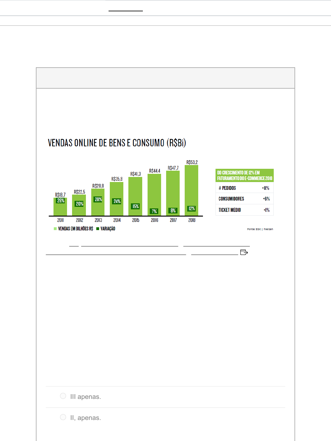 Histórico de tentativas Tentativa Tempo Pontuação MAIS RECENTE Tentativa 1 9 minutos 1 de 1 Pontuação desta tentativa: 1 de 1 Enviado 3 abr em 10:58 Esta tentativa levou 9 minutos. 0,2 / 0,2 ptsPergunta 1 Veja o gráfico abaixo: Fonte: https://www.climba.com.br/blog/faturamento-do-e- commerce-no-brasil-em-2019-deve-atingir-61-bilhoes/ Considere as afirmativas propostas e assinale a opção correta: I. O mercado de consumo por meio do e-commerce mostra um aumento de vendas em 2018, mas que ainda pode ser bem mais explorado pelas empresas. II. O crescimento do e-commerce no cenário brasileiro acompanha o crescimento de tal modelo em outros países. III. Parte do comércio não investe no e-commerce, pois os números do gráfico mostram uma vertiginosa queda no faturamento nesse modelo de venda. É correto o que se afirma em: III apenas. II, apenas. https://famonline.instructure.com/courses/27214/quizzes/141459/history?version=1 https://www.climba.com.br/blog/faturamento-do-e-commerce-no-brasil-em-2019-deve-atingir-61-bilhoes/ I e II apenas. Correto!Correto! I, apenas. II e III apenas. Estão corretas somente as afirmativas I e II. A afirmativa I está correta, pois que há um crescimento nas vendas, porém, há uma boa fatia de mercado a ser conquistada por tal modelo. A afirmativa II está correta, pois diversos números e dados mostram o crescimento do e-commerce no Brasil e em outros países. A afirmativa III está incorreta, pois o gráfico mostra um crescimento e não a queda no faturamento em tal modelo. 0,2 / 0,2 ptsPergunta 2 Vamos à leitura de uma definição sobre m-commerce: “M-Commerce é uma sigla para “mobile commerce”, ou seja, comércio via dispositivos móveis. Hoje, os celulares passaram a ser a porta de entrada dos consumidores para o mundo virtual e, por essa razão, é natural que boa parte das compras também ocorra por intermédio desses dispositivos. Assim, o comércio relacionado às compras feitas via celular é o que caracteriza o chamado m-commerce.” Fonte: https://blog.sage.com.br/o-que-e-mcommerce/ Avaliando o m-commerce, podemos afirmar que devido aos problemas de segurança pública - refletindo em furtos e roubos de dispositivos móveis -, nos grandes centros urbanos, o m- commerce tende decrescer. o m-commerce é um modelo de negócios passageiro porque ele cria dificuldades no processo comercial. https://blog.sage.com.br/o-que-e-mcommerce/ apenas transações realizadas exclusivamente por meio de smartphones que caracterizam o ambiente do m-commerce. as vendas de smartphones e outros dispositivos não impactam o alcance do m-commerce. o uso de dispositivos móveis tem crescido nas transações comerciais. Correto!Correto! Há um crescimento constante do uso de aparelhos móveis para aquisição de outros produtos e serviços. As diversas pesquisas mostram como houve no Brasil um crescimento das vendas pelo m-commerce. 0,2 / 0,2 ptsPergunta 3 Leia o texto a seguir: Houve um tempo em que somente o produto importava. Com o passar dos tempos, o marketing se reorientou para o cliente e, qualquer vendedor que tente empurrar uma venda de qualquer forma para o cliente, além de ser grosseiro, as chances de crescer são mínimas, senão nulas. Se você é vendedor, precisa olhar para o seu cliente de forma humanizada. Entender o valor do seu produto e como ele pode ajudar o seu cliente é extremamente importante para gerar um relacionamento. Assim, você não estará ali somente para vender algo, mas para solucionar um problema que seu cliente tenha, e gerar valor é a única forma de alcançar este objetivo. Além de oferecer uma solução – que é o primordial –, utilizar brindes ou serviços complementares e gratuitos é um ponto importantíssimo para estabelecer este relacionamento. (Fonte: DIVERGENTE. Ofereça algo ao seu cliente. Disponível em: < https://sejadivergente.com>Acesso em 13 de nov de 2019) (adaptado). Considerando o texto acima, e com base nos princípios da reciprocidade, assinale a alternativa correta: O princípio da autoridade é pouco recomendado para estratégias de persuasão no ambiente digital. https://sejadivergente.com%3Eacesso/ O princípio da reciprocidade apoia-se na expectativa de que haverá retribuição de alguma forma. Correto!Correto! O individualismo e a necessidade de afirmação pessoal são fatores essenciais ao consenso. Os consumidores atuais são imprevisíveis, por isso a eles não se aplica a lógica de mercado com paridade na reciprocidade O princípio da restrição foca na eliminação de barreiras na aquisição de produtos, facilitando um up grade em sua categoria. O princípio da reciprocidade apoia-se na expectativa de que haverá retribuição de alguma forma. A regra da reciprocidade, de alguma forma, foi impressa em nós num processo evolutivo. Culturalmente e psicologicamente falando, sentimo-nos obrigados a retribuir com outro favor quando alguém faz algo ou oferece algo para nós. 0,2 / 0,2 ptsPergunta 4 A imagem abaixo remete a um exemplo de como a IoT (Internet das Coisas) pode ser observada: Fonte: https://www.mundodomarketing.com.br/inteligencia/estudos/512/como- a-internet-das-coisas-iot-vai-impactar-o-seu-negocio.html Considerando o tema da IoT, assinale a opção correta. https://www.mundodomarketing.com.br/inteligencia/estudos/512/como-a-internet-das-coisas-iot-vai-impactar-o-seu-negocio.html https://www.mundodomarketing.com.br/inteligencia/estudos/512/como-a-internet-das-coisas-iot-vai-impactar-o-seu-negocio.html A interação entre objetos ocorrerá somente no setor industrial e pouco afetará o setor de serviços. Uma área em que não será afetada com a IoT são os serviços públicos, pois constitui um atendimento personalizado. O mercado da IoT não trará uma revolução da informação e pouco afetará o mercado. A IoT mudará de forma drástica a relação das pessoas com os objetos e com a vida. Correto!Correto! A IoT tem uma perspectiva de crescimento somente em pa
