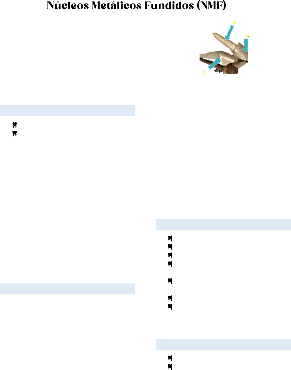 1. Descrever os princípios do preparo do canal para receber um núcleo metálico fundido (NMF). 2. Identificar requisitos determinantes para NMF. 3. Apresentar técnicas para obtenção do NMF: MODELAGEM – Técnica direta MOLDAGEM – Téc. indireta Tipos de Retentores Radiculares Núcleos metálicos fundidos (NMF) Pinos Metálicos pré-fabricados (núcleo preenchido) – com pinos de fibra de vidro, carbono, zircônia. Cimentado intra canal e completado com resina foto. Núcleos metálicos fundidos ou retentores intrarradiculares, são obtidos por fundição. São indicados para todos os dentes das arcadas, tendo parte coronária presente ou não, mas que tenham tratamento endodôntico realizado. Sua função é servir de base para coroas totais tipo Metalocerâmicas cujo copings são metálicos ou coroas totais livres de metal, cujo coping seja de Zircônia. Partes Componentes (1) Pino - parte do retentor que fica alojada dentro do canal radicular. (2) Núcleo - parte que substitui a porção coronária do dente. (3) Férula - porção do retentor que circunda a raiz. A férula pode não existir, pode ser parcial ou total. 1º Passo: Avaliar o grau de destruição coronária e verificar qual o melhor plano de tratamento: 1 - Dente com remanescente coronário (50% a 2 mm) Núcleos metálicos fundidos ou reconstituição coronária, ou núcleo de preenchimento com pinos de fibra de vidro, carbono etc. 2 -Estrutura coronária ausente - Retenção intra-radicular (NMF) . Vantagens do NMF 90 anos de história clínica de sucesso 87.2% a 88.1% Taxa de fracasso aceitável - 15% Permite paralelismo dos elementos dentários Relativa facilidade de confecção comparada com fibras Indicado para qualquer tipo de coroa Se necessário ajuda Tração ortodôntica radicular Desvantagens do NMF FRATURA - efeito de cunha (9%) ESTÉTICA - transmissão de luz (dente/raiz) metal pode oxidar e sofrer corrosão manchamento (halo cervical negro) DIFICULDADE DE REMOÇÃO - risco de fratura ou trepanação radicular BOM RECURSO para remoção de núcleo: ULTRA SOM Requisitos do NMF Requisitos fundamentais ao iniciar o procedimento para obtenção de retentores intrarradiculares. Raios-X periapical correto sem distorções (finalidades ?) Conferir qualidade do tratamento endodôntico Certificar-se do tamanho da porção radicular Certificar-se da direção da porção radicular Realizar as medições necessárias para desobturar Regras para a desobturação do elemento dental: 1. Após as medições em RX, colocar o cursor nas brocas Gates, realizar a desobturação até os 2/3 do canal. MOTIVO: (Teoria das alavancas – braço da potência não deve ser maior que o braço da resistência) (quem é potência e quem é resistência?) 2. comprimento aceitável do preparo intra radicular. (1 x1) – tamanho do pino = tamanho do dente. (braço da potência igual ao braço da resistência – resultante é zero. 3. não deve ser desobturado o último terço do canal. (3 a 5 mm) deve permanecer obturado. 4. Se necessário alargar o canal, dever ser na proporção de 1/3 da largura radicular. Utilizando brocas tipo largo, ou especiais que acompanham O kit dos pinos de fibra de vidro. (PFV) “Quanto mais longo o pino, maior a retenção e a resistência, reduzindo a possibilidade de fratura vertical.” Diâmetro do preparo De maneira geral, a porção cervical deve permanecer com 1/3 do diâmetro radiográfico da raiz. Contudo, o 1/3 apical deve-se manter no mínimo com 1,0 mm de estrutura dentinária em torno do Retentor Comprimento do pino e altura da crista óssea alveolar. O comprimento do pino deve atingir pelo menos a metade do comprimento da raiz inserida no osso para que as tensões transmitidas pelo retentor intra-radicular encontrem suporte ósseo para amortecê-las. Remoção da Obturação Radicular Instrumento Número Gattes 1 2 3 4 Largo - 1 2 3 Lima endodôntica 50 70 90 110 Gattes para desobturar (penetrar com a broca sem desvio e em baixa rotação) Largo para alargar o canal (depende da espessura radicular – avaliar por rx) Preparo do canal Até quanto desobturar (avaliar no RX): 1º Passo: Não esquecer de deixar 3 a 5mm de obturação 2º Passo: Penetrar mais da metade da raiz circundada por osso 3º Passo: checar se 2/3 da raiz foi desobturado Após finalizar com a broca LARGO, se verificar no Rx final, sobras de guta percha, utilizar uma lima tipo Hedstroem p/eliminar possíveis sobras. Modelagem / Moldagem do Canal Técnica Direta - MODELAGEM ₢om resina acrílica Duralay feita diretamente na boca Técnica Indireta - MOLDAGEM Com elastômero para confecção do NMF em laboratório Sequência Modelagem: Técnica Direta Vaselinar preparo e dentes adjacentes Colocar resina Duralay no canal c/auxílio de um pincel de ponta fina e, em seguida, adaptar o cone de resina preparado anteriormente. Aguardar o tempo de polimerização da resina. (2 minutos) Verificar se a modelagem do canal está sem bolhas ou falhas. Reposicionar o molde para confecção da parte coronária. Esculpir a parte coronária preenchida com duralay proporcionando forma semelhante a um dente preparado. Esculpido diretamente na boca, ao final verificar adaptação, e existência de espaços para a futura coroa, respeitando os princípios de oclusão. Inclusão E Fundição –/ Ligas Para Fundição Ouro (fora de uso atual) Cobre-Alumínio Prata-Paládio Níquel-Cromo Zircônia Sequência Moldagem: Técnica Indireta Conferindo previamente o preparo realizado – RX Primeira moldagem com silicona pesada. Confecção de um cone de resina que se adapte ao canal / ou Pin jet Alívio da região a ser moldado, para criar espaço ao pino externo com 3mm, para realizar a 2ª moldagem com silicone leve. Preparação do material leve, que será utilizado para a moldagem do canal preparado. Com a seringa injetar no canal preparado, a silicona leve, em seguida, adaptar o pino de resina. Recolocar a moldeira preparada e carregada com sili