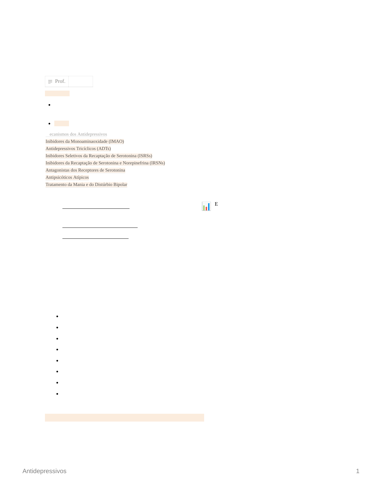 Antidepressivos 1 Antidepressivos Prof. Jucimara Depressão: Sensação de tristeza e desesperança, incapacidade de sentir prazer em atividades usuais, alteraçõs nos padrões do sono e apetite, perda de vigor e pensamento suicidas Mania: é o oposto, euforia, entusiasmo, raiva, pensamentos e fala rápidos, extrema autoconfiança e diminuição de autocrítica ➯ A depressão pode ser classificada em: a. Depressão maior ou Unipolar → independe de fatores externos (sendo a forma mais grave de depressão) b. Transtorno depressivo persistente c. Distúrbio Bipolar tipo I ou II → há episódios de euforia intercalados com depressão 📊 Epidemicamente o risco de haver na vida adulta é de 15% 1º lugar em tempo vivido com incapacitação ao longo da vida APS → 10% Frequentemente secundária a outras doenças Patologia subdiagnosticada e subtratada levando Risco de suicídio associado de 10-15% ➯ A forma mais grave, a depressão unipolar é caracterizado por humor deprimido e/ou perda de interesse em praticamente todas as atividades por PELO MENOS 2 SEMANAS, sendo acompanhado dos sintomas: Insônia ou hipersonia; Sentimentos de desvalorização (autodepreciação); Excesso de culpa; Fadiga ou falta de energia; Redução da capacidade de pensar ou concentrar-se; Alteração significativa no apetite ou peso; Retardo ou agitação psicomotora; Pensamentos recorrentes de morte ou suicídio. ➯ Pode estar presente simultaneamente com ansiedade, sendo alguns fármacos eficazes em ambas as doenças Tratamento ➯ Complexo e difícil, passa um ciclo de 3 a 4 semanas para começar a exercer uma resposta afetiva Mecanismos dos Antidepressivos Inibidores da Monoaminaoxidade (IMAO) Antidepressivos Tricíclicos (ADTs) Inibidores Seletivos da Recaptação de Serotonina (ISRSs) Inibidores da Recaptação de Serotonina e Norepinefrina (IRSNs) Antagonistas dos Receptores de Serotonina Antipsicóticos Atípicos Tratamento da Mania e do Distúrbio Bipolar Antidepressivos 2 Os sintomas respondem de formas diferentes ao tratamento Ocorre primeiro uma melhora nos distúrbios relacionados ao sono e após uma melhora no humor e déficits cognitivos ➯ A retirada do fármaco deve ser gradual Cerca de 1/3 dos paciente apresenta remissão completa após um ciclo de tratamento ➯ Para depressão crônica (>2anos) pode ser necessário um tratamento ao longo de toda vida Relação AD com suicídio Os fármacos antidepressivos apresentam uma possível relação com o suicídio, principalmente quando utilizados por crianças e adolescentes Mas naqueles que quando não utilizado os fármacos ocorreu uma diminuição no diagnóstico de depressão e na prescrição dos antidepressivos e isso levou ao aumento de suicídio nessa idade Logo além de se evidenciar que mesmo que os antidepressivos possuam um aumento na tendência ao suicídio, o risco de não usar o medicamento em pacientes com depressão grave supera o risco de usar Importante monitorar os pacientes, principalmente nas fases iniciais do tratamento Escolha do fármaco devemos considerar Resposta/tolerância prévia a um fármaco (inclui uso bem sucedido por familiares); Perfil de efeitos adversos; Toxicidade, meia-vida, facilidade posológica; Custo; Comorbidades, interações; Sintomas depressivos específicos Se psicoterapia estiver disponível, considerar tratamento combinado � Fisiologicamente a depressão ainda tem sua causa desconhecida Suspeita-se que há uma diminuição da concentração de neurotransmissores (serotonina, noradrenalina e dopamina) na fenda sináptica, diminuindo a transmissão desses NT Mecanismos dos Antidepressivos ➯ A maioria dos fármacos antidepressivos úteis clinicamente potencializa (direta ou indiretamente) as ações da norepinefrina e/ou da serotonina (5-HT) no cérebro ➯ Teoria da deficiência das Monoaminas (MAO): quando em déficit indicam depressão, quando em excesso mania e ocorre uma disfunção no NÚMERO e na SENSIBILIDADE dos receptores Trata-se de uma teoria muito simplista, que não explica por que os efeitos farmacológicos de qualquer antidepressivo e antimania na neurotransmissão ocorrem imediatamente, ao passo que a evolução temporal para a resposta terapêutica precisa de várias semanas Isso sugere que a diminuição da captação dos neurotransmissores é apenas o efeito inicial do fármaco, que pode não ser diretamente responsável pelos efeitos antidepressivos ➯ Os antidepressivos de uma forma geral aumentam a transmissão SEROTONINÉRGICA E NORADRENÉRGICA ➯ Os AD podem atuar de duas maneiras: a. Exercendo o bloqueio da recaptação neuronal; ou Antidepressivos 3 b. Realizando a inibição do metabolismo das monoaminas, assim levando ao aumento dos seus efeitos excitatórios ➯ Local de ação: sistemas noradrenérgicos e serotornégicos do sistema límbico ➯ A recaptação do neurotransmissor ocorre por meio de proteínas transportadoras pré- sinápticas (SERT e NET), e a inibição desses transportadores diminui a depuração do NT e prolonga seu tempo de permanência na sinapse aumentando assim a neurotransmissão ➯ Com o tempo, cerca de 2 semanas, os autoreceptores começam a se dessensibilizar e não conseguem mais bloquear a liberação de serotonina e o Antidepressivo começa a fazer efeito Além da diminuição da sensibilidade dos receptores há uma modulação na sinalização e na transcrição de outros genes ➯ Efeitos a longo prazo: mecanismos adaptativos ou reguladores, o tratamento crônico dessensibiliza os autoreceptores pré-sinápticos, produzindo alterações de longa duração na neurotransmissão ➯ Ocorre: Aumento da densidade ou sensibilidade do receptor adrenérgico ou serotoninérgico Aumento do acoplamento receptor-proteína G e sinalização, levando a: Diminuição da produção do hormônio liberador de corticotrofina (diminuição dos corticoides que estão presentes na patofisiologia da depressão) Indução de fatores neurotróficos (h