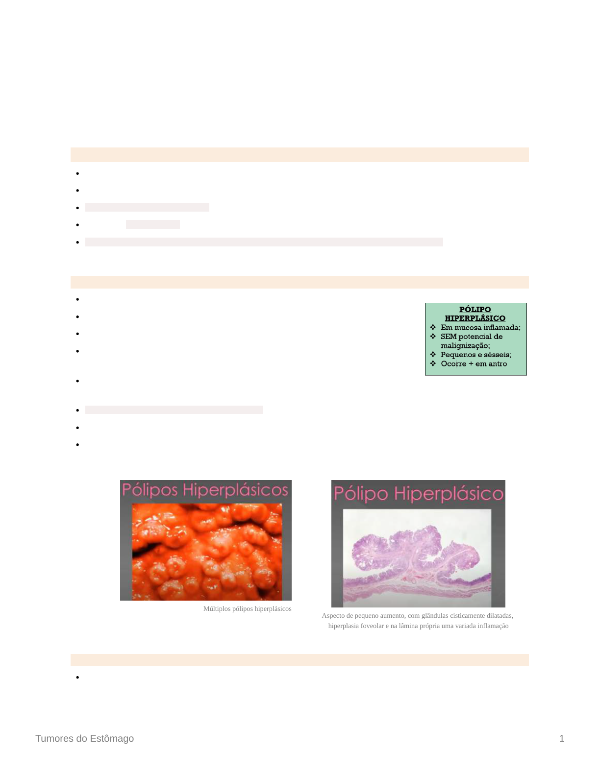 Tumores do Estômago 1 Tumores do Estômago ➯ Neoplasias comuns, malignidades frequentes e altas taxas de letalidade Tumores benignos Tumores não neoplásicos que se apresentam como pólipos são os mais comuns (90%) Comuns no estômago, mas podem ser encontrados em outros locais na forma sindrômica Natureza hiperplásica ou inflamatória São pólipos harmatomatosos Pólipo de Peutz Jegheres e Pólipo Juvenil NÃO SÃO COMUNS no estômago (mais comuns no intestino) Pólipo Hiperplásico Ou pólipo inflamatório 75% das lesões polipoides gástricas Faixa etária entre 50 e 60 anos Apresentação mais comum no ANTRO, com lesões SÉSSEIS ou PEDICULADOS, superfície geralmente lisa Fundo gástrico com MUCOSA INFLAMADA, sobretudo relacionada com gastrite por H. pylori A chance da displasia está ligada ao tamanho da lesão A grande maioria desses pólipos hiperplásicos tem menos de 1cm Na grande maioria das vezes não tem associação com malignidade e não apresentam foco de displasia → 1 a 20% dos casos chance de displasia Pólipo de Glândulas Fúndicas Incidência crescente diretamente proporcional a ampla utilização dos INIBIDORES DAS BOMBAS DE PRÓTONS (tratamento inibidores da acidez gástrica) Múltiplos pólipos hiperplásicos Aspecto de pequeno aumento, com glândulas cisticamente dilatadas, hiperplasia foveolar e na lâmina própria uma variada inflamação Tumores do Estômago 2 Diminui a produção de ácido e provoca de uma forma reacional uma proliferação/cistificação dessas glândulas presentes na mucosa oxíntica Sintomatologia variada, alguns são completamente assintomáticos, outros se apresentam com náuseas, vômitos e dor Apresenta-se mais em mulheres (5x mais) Tende a ocorrer MUCOSA OXÍNTICA, portanto, em CORPO E FUNDO GÁSTRICO As glândulas ficam cisticamente dilatadas e revestida por células da mucosa oxíntica, portanto, células parietais e principais, a lâmina própria com desprezíveis células inflamatórias Adenomas polipoides (Pólipos verdadeiramente neoplásicos) 5 a 10% dos tumores benignos gástricos 50 a 60 anos Predileção em homens (3x mais) Mucosa INFLAMADA e com histórico de GASTRITE CRÔNICA com atrofia e metaplasia intestinal Esses pólipos apresentam DISPLASIA (leve ou alto grau) Os focos de displasia indicam um potencial de malignização relacionado com o tamanho ou grau de displasia e a configuração histológica Únicos ou múltiplos, SÉSSEIS ou PEDICULADOS, tubulares ou vilosos, preferencia pelo ANTRO Cerca de 40% no momento do diagnóstico já tem algum foco de malignização Não se pode com certeza fazer a diferenciação dessas lesões → então, elas precisam ser EXCISADAS e diagnosticadas durante uma endoscopia No momento que se diagnostica uma lesão benigna, mesmo que tenha chance para uma evolução maligna, isso não vai acontecer, pois com o diagnóstico já se retira a lesão, sempre que possível Se for uma lesão muito grande, que não possa ser excisada no momento do diagnóstico, ela deve ter a indicação cirúrgica devido ao risco de displasia e malignização (que são relacionados ao tamanho da lesão) Podem ser tubulares, vilosos ou túbulo-vilosos A configuração vilosa, que são projeções digitiformes fica com aspecto verrucoso, com um eixo conjuntivo vascular de sustentação e coberto por um epitélio, a configuração é vilosa, também chamada de papilomatosa A configuração tubular, tal qual glândula tubular reta que a gente observa no estômago normal. Aí vai apresentar algum nível de displasia que pode ser de baixo a alto grau, lembrando que as lesões de displasia de alto grau são as mais preocupantes no que tange ao risco de transformação maligna Macroscopicamente é igual aos outros pólipos, por isso deve ser biopsiado � No cólon, a maioria dos adenocarcinomas colônicos surgem dos pólipos, no estômago a maioria dos adenocarcinomas NÃO surgem dos pólipos (embora o adenoma possa virar um adenocarcinoma) Tumores Malignos Adenoma gástrico, com superfície lisa, congesta Tumores do Estômago 3 ➯ Carcinomas (90-95%) que surgem do epitélio de revestimento do estômago, e ainda vamos ter linfoma (4%), carcinoide ou neuroendócrino (3%) e mesenquimais (2%) 1. Carcinoma gástrico Tem uma distribuição geográfica bem peculiar, variando de região pra região Alta incidência: Japão, China, Chile, Portugal e Rússia Baixa incidência: EUA, Canadá, Austrália e Nova Zelândia � Nas regiões de alta prevalência, os pacientes são submetidos a screening, o diagnóstico precoce é feito em 35% das vezes (Japão) Já onde ele tem uma baixa incidência e o investimento na vigilância não se justifica, o diagnóstico precoce se faz de 10 a 25% das vezes (USA e Europa) Tem incidência maior em homens (2:1) É a 2ª malignidade mais comum no mundo → manifestação silenciosa nas fases iniciais Neoplasia grave, com alta letalidade, prognóstico bastante restrito quando já se está numa fase mais avançada Patogenia Fatores ambientais: Helicobacter pylori; Fumo; Preservação de alimentos a base de sal (tipo charque ou defumados, que contem componentes nitrosos importantes como carcinógenos da mucosa gástrica) Pimenta; Escassez de alimentos frescos ricos em antioxidantes (vegetais e frutas); Fatores do hospedeiro: Gastrite crônica – risco adicional ao câncer; Gastrectomia parcial – favorece refluxo, gastrite alcalina e um processo inflamatório crônico continuado; Adenomas gástricos; Fatores genéticos: Grupo sanguíneo tipo A; História familiar de câncer gástrico; Câncer colônicos familiar não polipoide (síndrome – comentado na aula de intestino); Síndrome de câncer gástrico familiar; Classificação de Laurén ➯ Classificação bem confirmada e estabelecida, onde conseguimos relacionar 2 tipos distintos do carcinoma gástrico 1. Intestinal Se desenvolve nas regiões de alto risco; Faixa etária de 55 anos em média; Ocorre mais em homens (2:1); As le