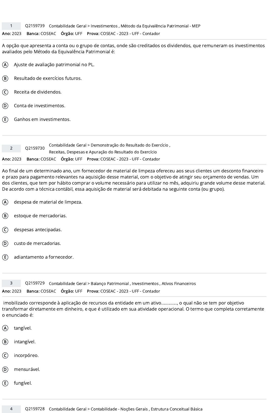 Ano: 2023 Banca: COSEAC Órgão: UFF A opção que apresenta a conta ou o grupo de contas, onde são creditados os dividendos, que remuneram os investimentos avaliados pelo Método da Equivalência Patrimonial é: A Ajuste de avaliação patrimonial no PL. B Resultado de exercícios futuros. C Receita de dividendos. D Conta de investimentos. E Ganhos em investimentos. Ano: 2023 Banca: COSEAC Órgão: UFF Ao �nal de um determinado ano, um fornecedor de material de limpeza ofereceu aos seus clientes um desconto �nanceiro e prazo para pagamento relevantes na aquisição desse material, com o objetivo de atingir seu orçamento de vendas. Um dos clientes, que tem por hábito comprar o volume necessário para utilizar no mês, adquiriu grande volume desse material. De acordo com a técnica contábil, essa aquisição de material será debitada na seguinte conta (ou grupo). A despesa de material de limpeza. B estoque de mercadorias. C despesas antecipadas. D custo de mercadorias. E adiantamento a fornecedor. Ano: 2023 Banca: COSEAC Órgão: UFF imobilizado corresponde à aplicação de recursos da entidade em um ativo............., o qual não se tem por objetivo transformar diretamente em dinheiro, e que é utilizado em sua atividade operacional. O termo que completa corretamente o enunciado é: A tangível. B intangível. C incorpóreo. D mensurável. E fungível. 1 Q2159739 >Contabilidade Geral Investimentos , Método da Equivalência Patrimonial - MEP Prova: COSEAC - 2023 - UFF - Contador 2 Q2159730 >Contabilidade Geral Demonstração do Resultado do Exercício , Receitas, Despesas e Apuração do Resultado do Exercício Prova: COSEAC - 2023 - UFF - Contador 3 Q2159729 >Contabilidade Geral Balanço Patrimonial , Investimentos , Ativos Financeiros Prova: COSEAC - 2023 - UFF - Contador 4 Q2159728 >Contabilidade Geral Contabilidade - Noções Gerais , Estrutura Conceitual Básica https://www.qconcursos.com/questoes-de-concursos/bancas/coseac https://www.qconcursos.com/questoes-de-concursos/institutos/uff https://www.qconcursos.com/questoes-de-concursos/bancas/coseac https://www.qconcursos.com/questoes-de-concursos/institutos/uff https://www.qconcursos.com/questoes-de-concursos/bancas/coseac https://www.qconcursos.com/questoes-de-concursos/institutos/uff https://www.qconcursos.com/questoes-de-concursos/questoes/3aa7b926-ef https://www.qconcursos.com/questoes-de-concursos/disciplinas/ciencias-contabeis-contabilidade-geral https://www.qconcursos.com/questoes-de-concursos/disciplinas/ciencias-contabeis-contabilidade-geral/investimentos https://www.qconcursos.com/questoes-de-concursos/disciplinas/ciencias-contabeis-contabilidade-geral/metodo-da-equivalencia-patrimonial-mep https://www.qconcursos.com/questoes-de-concursos/provas/coseac-2023-uff-contador https://www.qconcursos.com/questoes-de-concursos/questoes/3a87d0e0-ef https://www.qconcursos.com/questoes-de-concursos/disciplinas/ciencias-contabeis-contabilidade-geral https://www.qconcursos.com/questoes-de-concursos/disciplinas/ciencias-contabeis-contabilidade-geral/demonstracao-do-resultado-do-exercicio https://www.qconcursos.com/questoes-de-concursos/disciplinas/ciencias-contabeis-contabilidade-geral/receitas-despesas-e-apuracao-do-resultado-do-exercicio https://www.qconcursos.com/questoes-de-concursos/provas/coseac-2023-uff-contador https://www.qconcursos.com/questoes-de-concursos/questoes/3a8463a9-ef https://www.qconcursos.com/questoes-de-concursos/disciplinas/ciencias-contabeis-contabilidade-geral https://www.qconcursos.com/questoes-de-concursos/disciplinas/ciencias-contabeis-contabilidade-geral/balanco-patrimonial https://www.qconcursos.com/questoes-de-concursos/disciplinas/ciencias-contabeis-contabilidade-geral/investimentos https://www.qconcursos.com/questoes-de-concursos/disciplinas/ciencias-contabeis-contabilidade-geral/ativos-financeiros https://www.qconcursos.com/questoes-de-concursos/provas/coseac-2023-uff-contador https://www.qconcursos.com/questoes-de-concursos/questoes/3a7d0920-ef https://www.qconcursos.com/questoes-de-concursos/disciplinas/ciencias-contabeis-contabilidade-geral https://www.qconcursos.com/questoes-de-concursos/disciplinas/ciencias-contabeis-contabilidade-geral/contabilidade-nocoes-gerais https://www.qconcursos.com/questoes-de-concursos/disciplinas/ciencias-contabeis-contabilidade-geral/estrutura-conceitual-basica Ano: 2023 Banca: COSEAC Órgão: UFF A Relevância e a Fidedignidade são consideradas elementos....................................da informação contábil, de acordo com a NBC TG – Estrutura Conceitual. O termo que completa corretamente o enunciado é: A de melhoria. B qualitativos. C subjacentes. D fundamentais. E especiais. Ano: 2023 Banca: COSEAC Órgão: UFF Um dos relatórios obrigatórios exigidos pela contabilidade no processo contábil das empresas, não adota o regime de competência na sua elaboração. Trata-se do seguinte relatório: A Origens e aplicações de recursos. B Movimentação do patrimônio líquido. C Fluxos de caixa. D Balanço patrimonial. E Resultado do exercício. Ano: 2023 Banca: COSEAC Órgão: UFF Considere que uma determinada empresa, no exercício atual, precisa fazer uma opção por uma das modalidades de tributação. Considere, ainda, que essa empresa iniciou suas atividades em março do exercício anterior. O valor máximo de faturamento, nesse exercício anterior, que viabiliza a opção de tributação pelo Lucro Presumido é de: A R$ 78.000,000.00. B R$ 65.000.000,00. C R$ 39.000,000.00. D R$ 45.500.000,00. E R$ 60.000,000.00. Ano: 2023 Banca: COSEAC Órgão: UFF Das situações listadas abaixo, identi�que aquelas em que o contribuinte NÃO poderá utilizar o percentual de 16%, para formar a base de cálculo do Imposto de Renda na modalidade do Lucro Presumido. I Quando a receita for proveniente da venda de combustíveis e lubri�cantes. II Quando a atividade exercida pelo contribuinte, seja de pro�ssão regulamentada. III Quando a receita a ser tribut