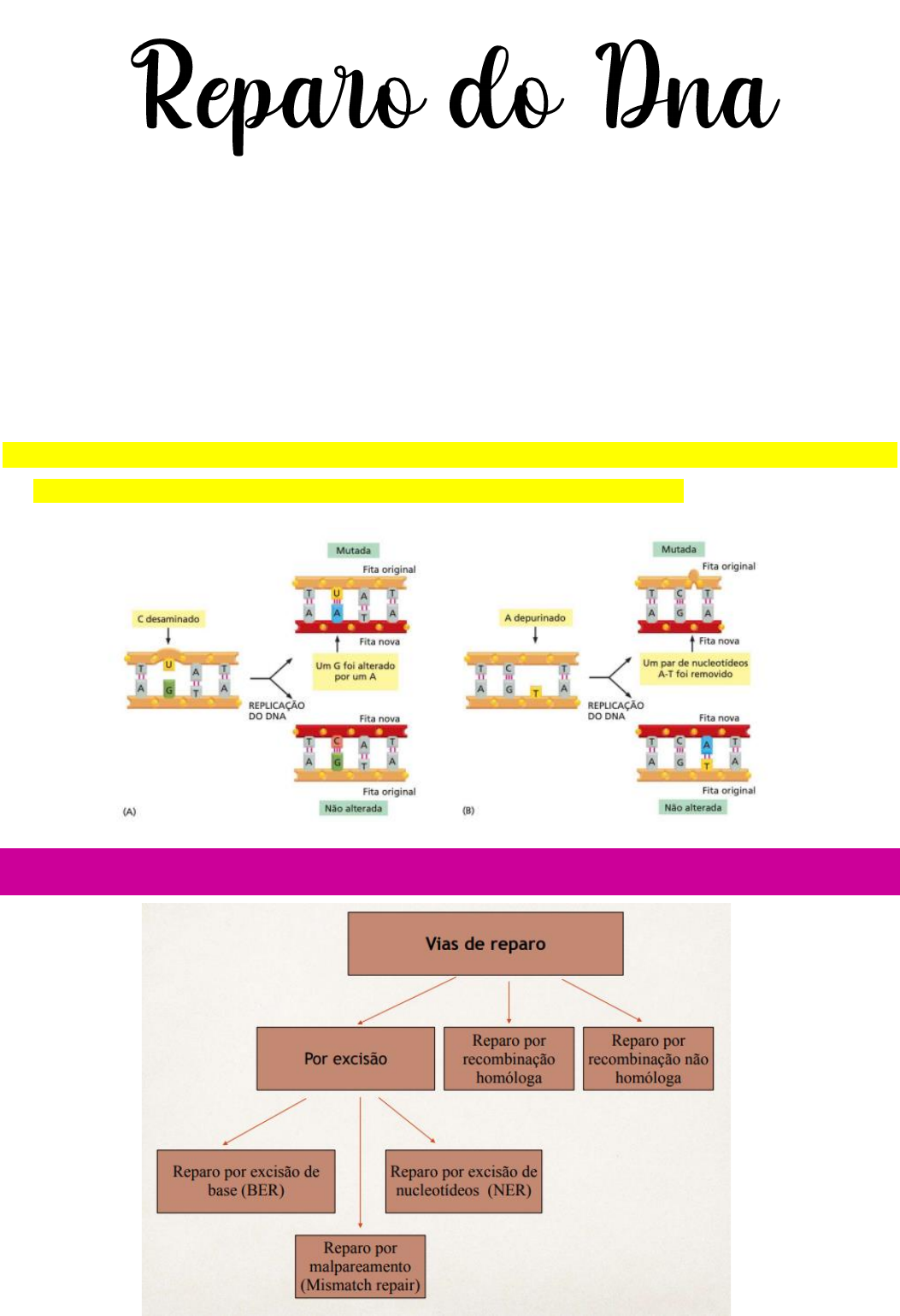 • Muito raramente, os processos celulares de replicação de DNA e reparo falham; • A máquina de replicação por si insere um nucleotídeo incorreto a cada 107 nucleotídeos copiados, e o sistema de reparo de malpareamento corrige 99% desses erros, aumentando a precisão de correção total para um erro a cada 109 nucleotídeos copiados. • O câncer é resultado de um acúmulo gradual de alterações nas sequências de DNA de células somáticas causadas por mutações aleatórias ao longo da vida que não foram reparados. (Doença do envelhecimento) • Quando os erros acontecem fora do processo replicativo ou aqueles que não conseguiram ser reparados pela polimerase no processo de replicação, é a via de reparo que entra em ação. VIAS DE REPARO Reversão direta da lesão do DNA (não se utiliza nenhuma das 5 vias) Antes de seguir algumas das vias, a célula tenta reparar o dano de maneira direita. É um modo mais eficiente de lidar com lesões específicas que ocorrem frequentemente. Algumas lesões possuem a POSSIBILIDADE de ser reparada por reversão direta: I. Dímeros de pirimidina que resultaram da exposição à luz ultravioleta (UV) . Será revertido o dano com a própria radiação que provocou o dano. (não apresentamos este mecanismo). Nós iremos reparar esses dímeros de outra forma. II. Resíduos de guanina alquilados que foram modificados pela adição de grupos metila ou etila na posição O6 do anel purínico. (Próximo tópico) Reparo do Dna: Reversão direta para alquilantes • Só conseguimos reverter a metilação no oxigênio de Carbono nº 6 da guanina, uma vez que o produto resultante, O6 - metilguanina, forma pareamento com a tamina em vez de citosina. • Essa lesão pode ser reparada pela ruma enzima chamada de O6 - metilguanina,-metiltransferase, que transfere o grupo metila para um resíduo de cisteína que possui no seu sítio Reparo do Dna: Excisão • É a forma mais geral para reparar uma ampla variedade de alterações químicas no DNA. • No reparo por excisão o DNA lesado é identificado e removido como bases livres ou nucleotídeos alterados. • A falha resultante é então preenchida através da síntese de uma nova fita de DNA, usando a fita complementar intacta como molde. Três tipos de reparo por excisão: ➢ Reparo por excisão de bases (BER) ➢ Reparo por excisão de nucleotídeos (NER) ➢ Malpareamento (mismatch repair). Reparo do Dna: Excisão de base • Uma única base lesada é identifica e removida da molécula de DNA; • Cs desaminados, As desaminados; diferentes tipos de bases alquiladas ou oxidadas; bases com anéis rompidos e bases nas quais a ligação dupla carbonocarbono foi acidentalmente convertida em uma ligação simples entre os carbonos. • A excisão no DNA é catalisada pela DNA GLICOSILASE. Assim, há Clivagem da ligação entre a uracila e a desoxirribose (açúcar) do esqueleto do DNA. • Isso resulta na produção de uma uracila livre e um sítio apirimídico. Contudo, dependendo da base pode ocorrer sítios apúrica ou apirimídica (AP). A DNA glicosilase também removem hipoxantina; • Posteriormente, os sítios AP (formado por açúcar e fosfato) são clivados por uma enzima endonuclease AP, a qual cliva regiões adjacentes ao sítio AP. • A lacuna é preenchido pela DNA-polimerase e pela DNA-ligase. Reparo do Dna: Excisão de Nucleotídeo • Lembre-se nucleotídeo é: base nitrogenada + fosfato + açúcar • Variedade maior de bases lesadas que distorcem a molécula de DNA; o Dímeros de pirimidina induzidos por UV; o Grupos volumosos – moléculas grandes (adição de um composto químico ao Dna que fica ligado covalentemente passando a ser chamados de aductos) adicionados às bases. Isso é resultante da reação de muitos carcinógenos com o DNA. Correção de dímeros (fora do processo transcricional, momento em que a célula não está transcrevendo nada) • Pareamento inadequado identificado por proteínas que formam um complexo. Elas vão atuar como como Helicase que vai abrir a dupla hélice de aproximadamente 30 pares de bases de DNA. Posteriormente, chega a proteína XPA para confirmar o dano e recrutar a proteína XPF. • XPF (posicionada na 5’) e XPG (posicionada na 3’ , essa já fazia parte do complexo citado) são endonucleases reconhecem o sítio de dando que clivam os 30 pares de nucleotídeos do sítio lesionado. • DNA polimerase vai preencher o espaço e a DNA ligase vai ligar os nucleotídeos. Excisão de nucleotídeo: Reparo acoplado à transcrição • Excisão durante o processo transcricional. • Durante a leitura percebe-se que há um dano que não foi reparado até então. Assim, quando chega na lesão do DNA (seja dímero ou grupo volumoso) bloqueia a transcrição; • A polimerase bloqueada é reconhecida pelas proteína CSB e CSA. • Posteriormente o mecanismo segue igual ao processo para excisão de nucleotídeo fora do processo replicativo. Reparo do Dna: Malpareamento • Bases mal pareadas que são incorporadas durante a replicação do DNA. • Os erros que escapam da correção da polimerase são reparados mais tarde por reparo de malpareamento. • Deve ser corrigida na fita parental/original para que não prossiga o mais mal pareamentos nas células filhas • Na região é reconhecido por proteínas de reparo de malpareamento que irão retirar os nucleotídeos mal pareados e os adjacentes, mas só remove em uma das duas fitas de DNA onde houve a mutação, isto é, envolvidas no malpareamento e sintetiza novamente a fita perdida. • Para ser eficiente na correção dos erros de replicação, o sistema de reparo de malpareamento deve sempre remover apenas a fita de DNA recém-sintetizada: a remoção da outra fita (fita original) iria perpetuar o erro, em vez de corrigi-lo. https://img.uninove.br/static/0/0/0/0/0/1/0/7/5/0/0/10750017/form-obj-0.pdf