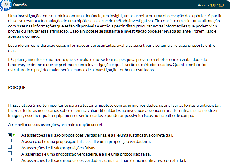 I. A elaboração do projeto de pesquisa é uma etapa fundamental para o sucesso da investigação. II. A etapa de elaboração do projeto de pesquisa é importante para testar a hipótese com os primeiros dados, analisar as fontes e entrevistar, fazer as leituras necessárias sobre tema, avaliar dificuldades na investigação, encontrar alternativas para produzir imagens, escolher quais equipamentos serão usados e possíveis riscos no trabalho de campo. A) As asserções I e II são proposições verdadeiras, e a II é uma justificativa correta da I. B) A asserção I é uma proposição verdadeira, e a II é uma proposição falsa. C) As asserções I e II são proposições falsas. D) A asserção é uma proposição falsa, e a II é uma proposição verdadeira. E) As asserções I e II são proposições verdadeiras, mas a II não é uma justificativa correta da I.