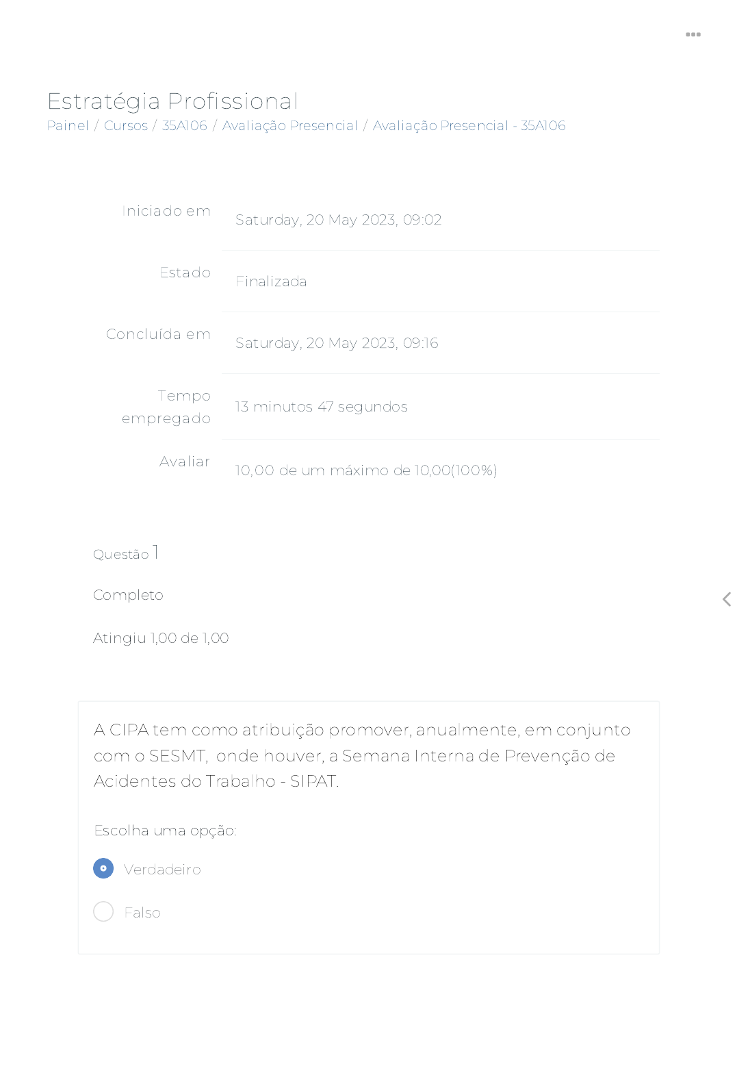 20/05/2023 09:16 Avaliação Presencial - 35A106 https://ava.politecnicabr.com.br/mod/quiz/review.php?attempt=4911292 1/8 Painel / Cursos / 35A106 / Avaliação Presencial / Avaliação Presencial - 35A106 Estratégia Pro�ssional Iniciado em Saturday, 20 May 2023, 09:02 Estado Finalizada Concluída em Saturday, 20 May 2023, 09:16 Tempo empregado 13 minutos 47 segundos Avaliar 10,00 de um máximo de 10,00(100%) Questão 1 Completo Atingiu 1,00 de 1,00 A CIPA tem como atribuição promover, anualmente, em conjunto com o SESMT, onde houver, a Semana Interna de Prevenção de Acidentes do Trabalho - SIPAT. Escolha uma opção: Verdadeiro Falso https://ava.politecnicabr.com.br/my/ https://ava.politecnicabr.com.br/course/index.php https://ava.politecnicabr.com.br/course/view.php?id=1028 https://ava.politecnicabr.com.br/course/view.php?id=1028#section-17 https://ava.politecnicabr.com.br/mod/quiz/view.php?id=28888 https://ava.politecnicabr.com.br/ 20/05/2023 09:16 Avaliação Presencial - 35A106 https://ava.politecnicabr.com.br/mod/quiz/review.php?attempt=4911292 2/8 Questão 2 Completo Atingiu 1,00 de 1,00 Complete as lacunas do texto a seguir com as respostas respectivamente: Os métodos ______________(empíricos) baseiam-se em estudos realizados com grupos de pessoas (grupos de controle). A partir da análise dos dados estatísticos obtidos, são construídos grá�cos e tabelas que são utilizados como base para avaliação do problema. Já os métodos __________________são procedimentos que buscam um modelo físico/matemático que se assemelhe às condições a que estariam sujeitos os trabalhadores quando expostos aos fatores do ambiente que in�uenciam a sobrecarga térmica. Escolha uma opção: a. Fisiológicos e Instrumentais b. Grá�cos e Psicométricos c. Instrumentais e Fisiológicos d. Psicométricos e Grá�cos https://ava.politecnicabr.com.br/ 20/05/2023 09:16 Avaliação Presencial - 35A106 https://ava.politecnicabr.com.br/mod/quiz/review.php?attempt=4911292 3/8 Questão 3 Completo Atingiu 1,00 de 1,00 Segundo a NR 05, em relação à organização da CIPA, podemos a�rmar: Escolha uma opção: a. O mandato dos membros eleitos da CIPA terá a duração de dois anos, permitida uma reeleição. b. O mandato dos membros eleitos da CIPA terá a duração de dois anos, permitida uma reeleição. c. É vedada a dispensa arbitrária ou sem justa causa do empregado eleito para cargo de direção de CIPA, desde o registro de sua candidatura até um ano após o � nal de seu mandato. d. Os representantes dos empregadores, titulares e suplentes serão por eles eleitos e empossados. e. Os representantes dos empregadores, titulares e suplentes serão por eles eleitos e empossados. https://ava.politecnicabr.com.br/ 20/05/2023 09:16 Avaliação Presencial - 35A106 https://ava.politecnicabr.com.br/mod/quiz/review.php?attempt=4911292 4/8 Questão 4 Completo Atingiu 1,00 de 1,00 Verdadeiro ou Falso? Podemos a�rmar que o auditor �scal pode realizar inspeções em qualquer empresa de sua área de atuação em qual- quer dia e horário, sem necessidade de comunicar previamente. Ele possui acesso a todas as de- pendências da empresa e pode solicitar informações e esclarecimentos a qualquer pessoa para apurar fatos considerados por ele como relevantes à inspeção. Escolha uma opção: Verdadeiro Falso https://ava.politecnicabr.com.br/ 20/05/2023 09:16 Avaliação Presencial - 35A106 https://ava.politecnicabr.com.br/mod/quiz/review.php?attempt=4911292 5/8 Questão 5 Completo Atingiu 1,00 de 1,00 Verdadeiro ou Falso? A lesão por esforço repetitivo (LER) é constituída por um conjunto de síndromes (quadros clínicos, patologias, doenças) que atacam os nervos, músculos e tendões (juntos ou separadamente). Ela é proveniente de atividades em que o trabalhador necessita realizar grande esforço físico, adota uma má postura ou uma postura incorreta durante o trabalho ou ainda quando ocorre compressão mecânica constante das estruturas dos membros. Escolha uma opção: Questão 6 Completo Atingiu 1,00 de 1,00 Verdadeiro ou Falso? Só terá direito à aposentadoria por invalidez quem, ao se �liar à Previdência Social, já tiver doença ou lesão que geraria o benefício, a não ser quando a incapacidade resultar no agravamento da enfermidade. Escolha uma opção: Verdadeiro Falso Verdadeiro Falso https://ava.politecnicabr.com.br/ 20/05/2023 09:16 Avaliação Presencial - 35A106 https://ava.politecnicabr.com.br/mod/quiz/review.php?attempt=4911292 6/8 Questão 7 Completo Atingiu 1,00 de 1,00 Verdadeiro ou Falso? Segundo o código de ética em seu artigo de número 20. Comunicar às instituições representativas da categoria fatos que envolvam recusa ou demissão de cargo, função ou emprego motivada pela necessidade do pro�ssional em preservar os postulados éticos e legais da pro�ssão. Escolha uma opção: Questão 8 Completo Atingiu 1,00 de 1,00 Verdadeiro ou Falso? As melhorias ergonômicas geralmente são propostas após a realização da análise ergonômica do trabalho prevista no item 17.1.2 da NR 17 (BRASIL, 1978a). Escolha uma opção: Verdadeiro Falso Verdadeiro Falso https://ava.politecnicabr.com.br/ 20/05/2023 09:16 Avaliação Presencial - 35A106 https://ava.politecnicabr.com.br/mod/quiz/review.php?attempt=4911292 7/8 Questão 9 Completo Atingiu 1,00 de 1,00 Verdadeiro ou Falso? Podemos a�rmar que para o conceito prevencionista, devemos considerar como acidente do trabalho qualquer ocorrência não programada, como uma lesão incapacitante ou não incapacitante, ou qualquer outro dano ao trabalhador, assim como também qualquer dano que inter�ra no processo produtivo (equipamentos, instalações etc.). Escolha uma opção: Questão 10 Completo Atingiu 1,00 de 1,00 Verdadeiro ou Falso? Auxílio-doença é o benefício concedido a todos os segurados impedidos de trabalhar por doença ou acidente de trabalho por mais de 30 dias consecutivos. Escolha uma opçã