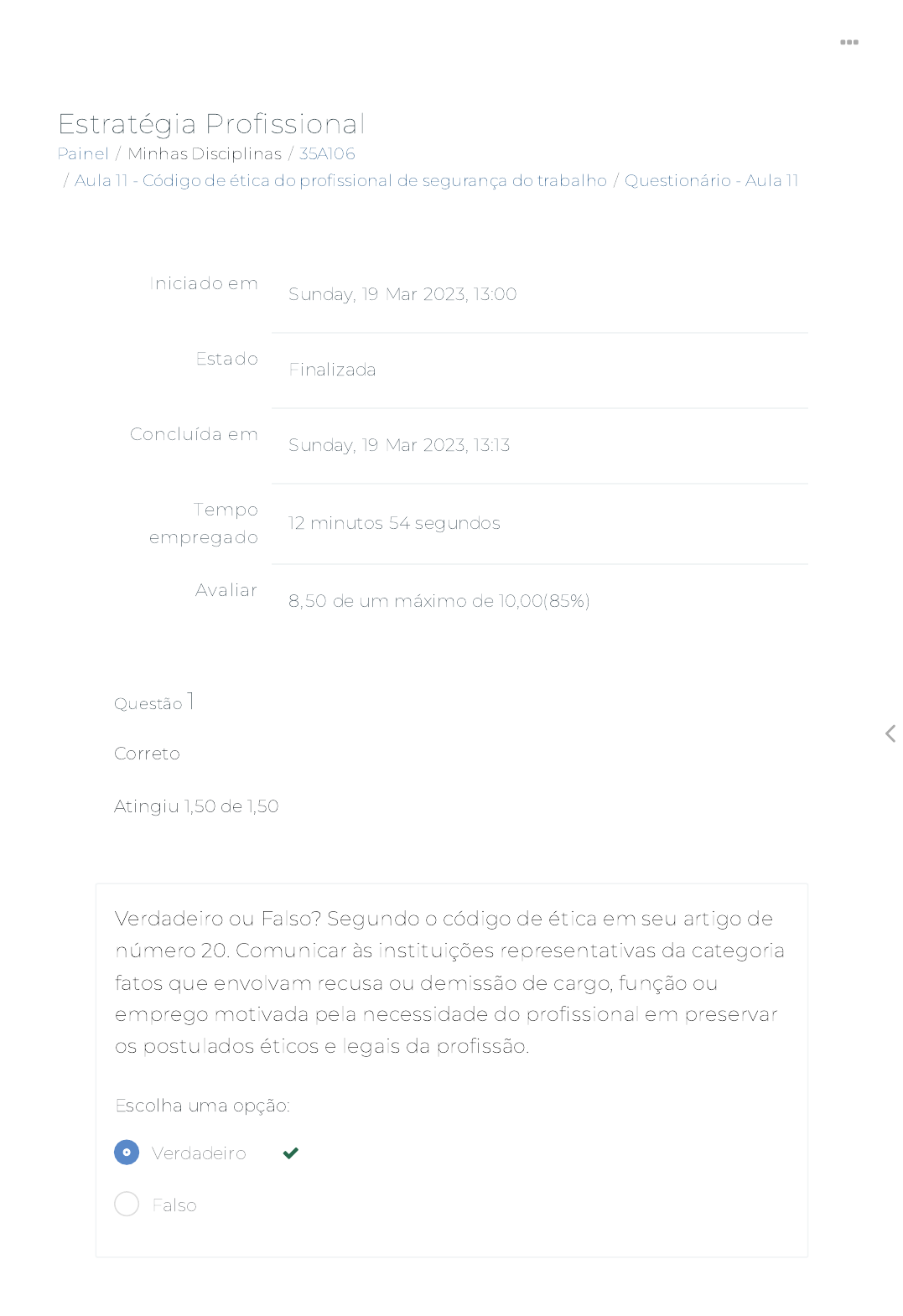 27/03/2023 21:08 Questionário - Aula 11 https://ava.politecnicabr.com.br/mod/quiz/review.php?attempt=4575045 1/5 Painel / Minhas Disciplinas / 35A106 / Aula 11 - Código de ética do pro�ssional de segurança do trabalho / Questionário - Aula 11 Estratégia Pro�ssional Iniciado em Sunday, 19 Mar 2023, 13:00 Estado Finalizada Concluída em Sunday, 19 Mar 2023, 13:13 Tempo empregado 12 minutos 54 segundos Avaliar 8,50 de um máximo de 10,00(85%) Questão 1 Correto Atingiu 1,50 de 1,50 Verdadeiro ou Falso? Segundo o código de ética em seu artigo de número 20. Comunicar às instituições representativas da categoria fatos que envolvam recusa ou demissão de cargo, função ou emprego motivada pela necessidade do pro�ssional em preservar os postulados éticos e legais da pro�ssão. Escolha uma opção: Verdadeiro Falso https://ava.politecnicabr.com.br/my/ https://ava.politecnicabr.com.br/course/view.php?id=1028 https://ava.politecnicabr.com.br/course/view.php?id=1028#section-13 https://ava.politecnicabr.com.br/mod/quiz/view.php?id=25477 https://ava.politecnicabr.com.br/ 27/03/2023 21:08 Questionário - Aula 11 https://ava.politecnicabr.com.br/mod/quiz/review.php?attempt=4575045 2/5 Questão 2 Correto Atingiu 1,50 de 1,50 Verdadeiro ou Falso? Segundo o código de ética em seu artigo de número 12. Guardar sigilo sobre o que souber em razão do exercício pro�ssional lícito, inclusive no âmbito do serviço público, salvo os casos previstos em lei ou quando solicitado por autoridades competentes e instituições representativas da categoria. Escolha uma opção: Questão 3 Correto Atingiu 1,00 de 1,00 Verdadeiro ou Falso? O Código de Ética do técnico de segurança do trabalho é um instrumento imprescindível para que o pro�ssional da área sinta-se seguro em suas decisões. Ele deve estar sempre à disposição para consultas e não deve ser negligenciado. Escolha uma opção: Verdadeiro Falso Verdadeiro Falso https://ava.politecnicabr.com.br/ 27/03/2023 21:08 Questionário - Aula 11 https://ava.politecnicabr.com.br/mod/quiz/review.php?attempt=4575045 3/5 Questão 4 Correto Atingiu 1,50 de 1,50 Verdadeiro ou Falso? Segundo o código de ética em seu artigo de número 17. Atender às instituições representativas da categoria, no sentido de colocar à sua disposição, sempre que solicitados, papéis de trabalho, relatórios e outros documentos que deram origem e orientaram a execução do seu trabalho. Escolha uma opção: Questão 5 Incorreto Atingiu 0,00 de 1,50 Verdadeiro ou Falso? É vetado ao técnico de segurança do trabalho: Aconselhar o trabalhador ou o empregador contra disposições expressas em lei ou contra os princípios fundamentais e as normas brasileiras de segurança e saúde no trabalho. Escolha uma opção: Verdadeiro Falso Verdadeiro Falso https://ava.politecnicabr.com.br/ 27/03/2023 21:08 Questionário - Aula 11 https://ava.politecnicabr.com.br/mod/quiz/review.php?attempt=4575045 4/5 Questão 6 Correto Atingiu 1,50 de 1,50 Verdadeiro ou Falso? É vetado ao técnico de segurança do trabalho: Expressar-se publicamente sobre assuntos técnicos sem estar devidamente capacitado para tal e, quando solicitado a emitir sua opinião, somente fazê-lo com conhecimento da �nalidade da solicitação e em benefício da coletividade. Escolha uma opção: Questão 7 Correto Atingiu 1,50 de 1,50 Verdadeiro ou Falso? Segundo o código de ética em seu artigo de número 7. O técnico de segurança do trabalho poderá delegar parcialmente a execução dos serviços a seu cargo a um colega de menor experiência, mantendo-os sempre sob sua responsabilidade técnica. Escolha uma opção: Verdadeiro Falso Verdadeiro Falso https://ava.politecnicabr.com.br/ 27/03/2023 21:08 Questionário - Aula 11 https://ava.politecnicabr.com.br/mod/quiz/review.php?attempt=4575045 5/5 © 2022 - Escola Politécnica Brasileira Entre em Contato https://www.politecnicabr.com.br 0800 084 2627 0800 084 2627 Links Úteis Dicas da nossa Diretora Acadêmica Planner de Estudos Declaração de Matrícula Orientações do AVA Abertura de Ticket Fale com o Tutor Cronograma de Estudos Manual de Estágio Manual de Competência Siga-nos nas redes sociais https://ava.politecnicabr.com.br/mod/quiz/0 https://www.politecnicabr.com.br/ https://soundcloud.com/user-501638417/sets/escola-politecnica-brasileira https://storage.googleapis.com/sirius-pubstore/semestre_plannerdeestudo%20poli.pdf https://storage.googleapis.com/sirius-pubstore/declaracao_matricula.pdf https://storage.googleapis.com/sirius-pubstore/orientacoes_ava.pdf https://storage.googleapis.com/sirius-pubstore/abertura_ticket.pdf https://storage.googleapis.com/sirius-pubstore/fale_com_tutor.pdf https://storage.googleapis.com/sirius-pubstore/cronograma_estudos.pdf https://storage.googleapis.com/sirius-pubstore/manual_estagio.pdf https://storage.googleapis.com/sirius-pubstore/manual_competencia.pdf https://www.facebook.com/politecnicabr https://www.instagram.com/politecnicabr_oficial https://ava.politecnicabr.com.br/