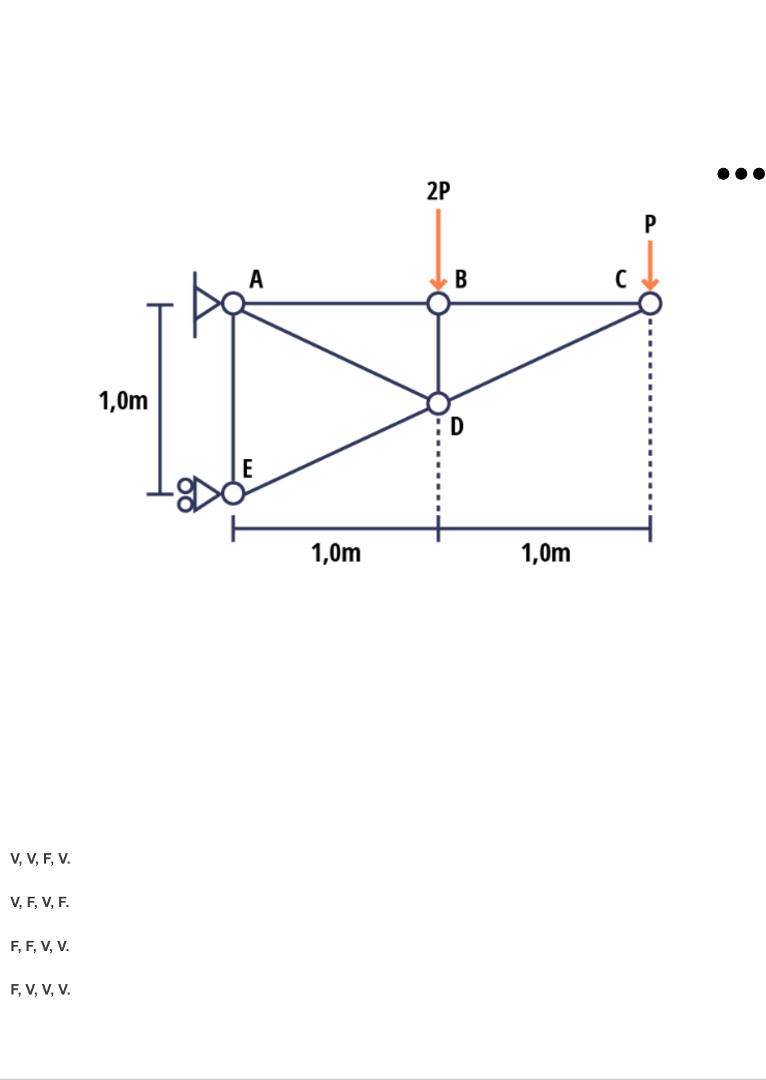 20/05/2023, 12:06 Comentários https://sereduc.blackboard.com/ultra/courses/_150550_1/outline/assessment/_7317824_1/overview/attempt/_27054739_1/review/inline-feedbac… 1/10 Ocultar opções de resposta Pergunta 1 0 / 0 O método dos nós é o mais genérico para se resolver os carregamentos internos de uma treliça. Após o equacionamento do equilíbrio e a obtenção das reações de apoio, cada nó deve ser equilibrado individualmente, onde, a partir das forças conhecidas, encontra-se os carregamentos desconhecidos. Uma treliça é apoiada em uma parede e recebe um carregamento de magnitude P, conforme a figura. Considerando essas informações e a estrutura em equilíbrio, analise as afirmativas a seguir e assinale V para a(s) verdadeira(s) e F para a(s) falsa(s): I. ( ) O carregamento na barra BC vale 2P (tração). II. ( ) O carregamento na barra CD vale 2,24 P (tração). III. ( ) Os carregamentos das barras AB, BD e AE valem 2P (tração). IV. ( ) O carregamento na barra DE vale 4,47 P (compressão). Agora, assinale a alternativa que apresenta a sequência correta: V, V, F, V. V, F, V, F. F, F, V, V. F, V, V, V. Resposta corretaV, F, V, V. 20/05/2023, 12:06 Comentários https://sereduc.blackboard.com/ultra/courses/_150550_1/outline/assessment/_7317824_1/overview/attempt/_27054739_1/review/inline-feedbac… 2/10 Ocultar opções de resposta Pergunta 2 0 / 0 Em algumas aplicações estruturais não é possível construir uma única viga para ligar um ponto a outro, sendo necessária a montagem de uma viga composta, feita de duas ou mais vigas, interligadas por meio de pinos. Os carregamentos atuantes devem ser cuidadosamente analisados para se evitar colapso da estrutura. A viga composta ABC é interligada através do pino B e sofre os carregamentos conforme a figura. De posse dessas informações, é possível afirmar que as componentes vertical e horizontal dos carregamentos em B valem: 3000 N e 8000 N. 0 e 8000 N. 3000 N e 4000 N. 6000 N a e 4000 N. Resposta correta0 e 4000 N. Pergunta 3 0 / 0 Quando se calcula os carregamentos em todas as barras da treliça, objetiva-se encontrar a barra que sofrerá o maior carregamento de tração e a barra que sofrerá o maior carregamento de compressão, pois elas serão os limitantes de projeto para o carregamento a ser suportado. 20/05/2023, 12:06 Comentários https://sereduc.blackboard.com/ultra/courses/_150550_1/outline/assessment/_7317824_1/overview/attempt/_27054739_1/review/inline-feedbac… 3/10 Ocultar opções de resposta Uma treliça é formada por triângulos equiláteros de lado 2 metros e sofre o carregamento de valor P, conforme a figura. Sabendo que a máxima força de tração que uma barra da treliça pode receber é de 5000 N e que a máxima compressão é de 3000 N, é correto afirmar que o valor máximo de P que atende esses requisitos é de: 5194 N. 4484 N. 2242 N. 5000 N. Resposta correta2597 N. Pergunta 4 0 / 0 As vigas geralmente são projetadas para suportar carregamentos perpendiculares ao seu comprimento. Além disso, em muitos casos, diversos carregamentos podem ser aplicados, o que torna os diagramas de esforços solicitantes mais complexos de serem elaborados. 20/05/2023, 12:06 Comentários https://sereduc.blackboard.com/ultra/courses/_150550_1/outline/assessment/_7317824_1/overview/attempt/_27054739_1/review/inline-feedbac… 4/10 Ocultar opções de resposta Uma viga bi-apoiada de 1,5 metros é solicitada por dois carregamentos de 50N nos pontos B e D, com sentidos opostos, como mostra a figura. Considerando essas informações e sabendo que a viga está em equilíbrio, analise as afirmativas a seguir: I. Chamando as reações de apoio verticais de Y A e Y C , o equilíbrio vertical da viga mostra que Y A = Y C = 0 . II. O diagrama de força cortante apresenta três regiões distintas, sendo duas com valor de 25 N e duas com valor de -25 N. III. O diagrama de momento fletor apresenta valores positivos e tem valor máximo de 25 N · m . IV. O diagrama de momento fletor possui uma região constante de valor 25 N · m entre os pontos B e C. Está correto apenas o que se afirma em: Resposta corretaIII e IV. II e III. I, II e IV. I e III. I e IV. Pergunta 5 0 / 0 Na resolução dos carregamentos em uma treliça, realiza-se o equacionamento de equilíbrio em cada nó, respeitando todos os princípios da estática. Ao se montar as equações nos nós, cria-se um sistema de equações lineares que deve ser resolvido. 20/05/2023, 12:06 Comentários https://sereduc.blackboard.com/ultra/courses/_150550_1/outline/assessment/_7317824_1/overview/attempt/_27054739_1/review/inline-feedbac… 5/10 Ocultar opções de resposta Ocultar opções de resposta Considerando a figura e os seus conhecimentos sobre método dos nós, pode-se afirmar que o número de equações que serão montadas para se realizar o equilíbrio da treliça é: 9. Resposta correta14. 10. 12. 7. Pergunta 6 0 / 0 As vigas são corpos que possuem seu comprimento muito maior do que sua largura e altura. São estruturas muito utilizadas na engenharia por terem características de suportar carregamentos nos seus seis graus de liberdade. Porém, sua aplicação é mais utilizada nos carregamentos longitudinais e perpendiculares ao seu comprimento. Uma viga bidimensional é engastada em uma parede e sofre um carregamento de valor P em sua extremidade livre. Considerando essas informações e os conteúdos estudados sobre vigas, é correto afirmar que a configuração desta estrutura é chamada: viga flexão. viga dupla. 20/05/2023, 12:06 Comentários https://sereduc.blackboard.com/ultra/courses/_150550_1/outline/assessment/_7317824_1/overview/attempt/_27054739_1/review/inline-feedbac… 6/10 Resposta corretaviga em balanço. viga livre. viga bi-apoiada. Pergunta 7 0 / 0 As estruturas podem possuir inúmeros formatos para atender diversos requisitos de projeto. Ao receberem carregamentos, mesmo que essas forças estejam em apenas uma direção, carregamentos em