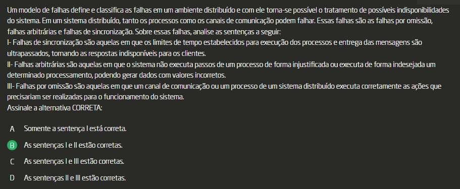 Em um sistema distribuído, tanto os processos como os canais de comunicação podem falhar. Sobre essas falhas, analise as sentenças: I- Falhas de sincronização são aquelas em que os limites de tempo estabelecidos para execução dos processos e entrega das mensagens são ultrapassados, tornando as respostas indisponíveis para os clientes. II- Falhas arbitrárias são aquelas em que sistema não executa passos de um processo de forma injustificada ou executa de forma indesejada um determinado processamento, podendo gerar dados com valores incorretos. III- Falhas por omissão são aquelas em que um canal de comunicação ou um processo de um sistema distribuído executa corretamente as ações que precisariam ser realizadas para funcionamento do sistema. Assinale a alternativa CORRETA: