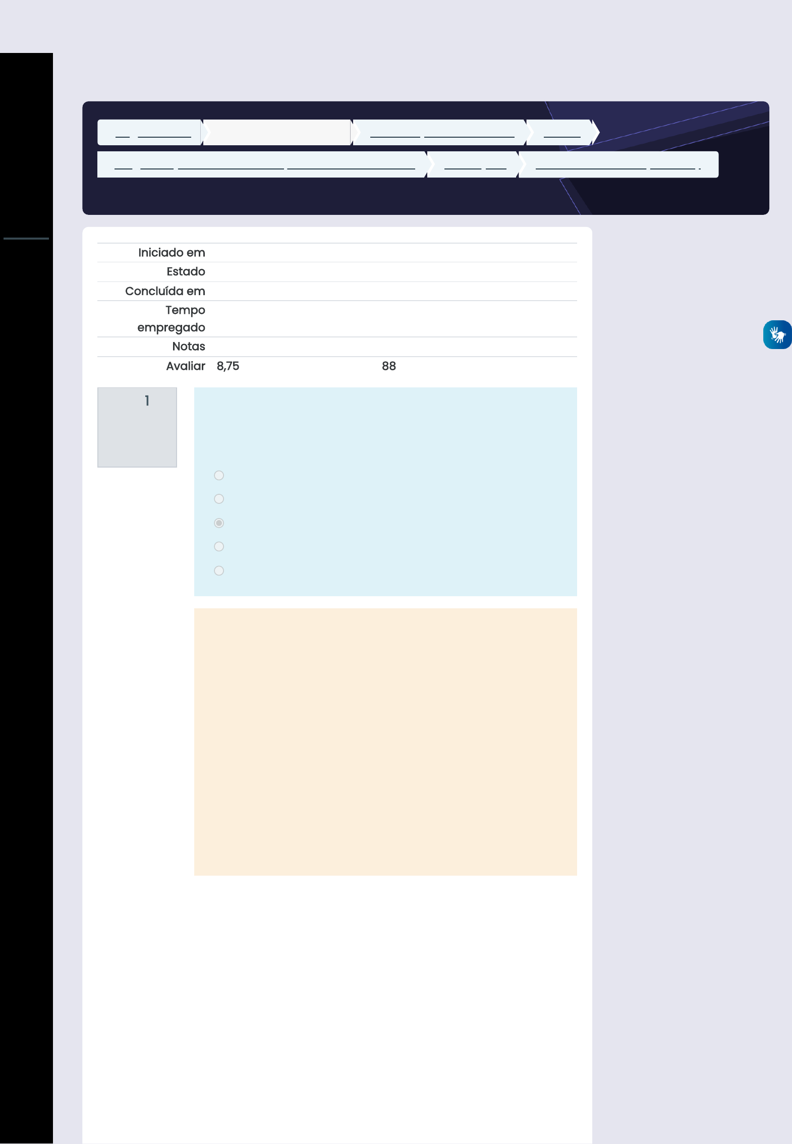 ... Página inicial Disciplinas e Espaços GRADUAÇÃO A DISTÂNCIA 2023-1 Programação Orientada a Objetos - 2023_01_EAD_A Avaliações P1 -- Prova On-line (Acessar) Questão 1 Incorreto Atingiu 0,00 de 1,00 Iniciado em terça, 21 mar 2023, 19:00 Estado Finalizada Concluída em terça, 21 mar 2023, 19:35 Tempo empregado 35 minutos 23 segundos Notas 7,00/8,00 Avaliar 8,75 de um máximo de 10,00(88%) Qual comando é utilizado para chamar o construtor da superclasse? Escolha uma opção: constructor pai class super upper Sua resposta está incorreta. Uma subclasse pode chamar um construtor definido por sua superclasse usando a forma de super a seguir: super(lista-parâmetros); Lista-parâmetros especifica qualquer parâmetro requerido pelo construtor na superclasse. A primeira instrução executada dentro do construtor de uma subclasse deve sempre ser super( ). A resposta correta é: super https://ava.candidomendes.edu.br/moodle/ https://ava.candidomendes.edu.br/moodle/course/index.php?categoryid=8 https://ava.candidomendes.edu.br/moodle/course/index.php?categoryid=158 https://ava.candidomendes.edu.br/moodle/course/view.php?id=11825 https://ava.candidomendes.edu.br/moodle/course/view.php?id=11825§ion=4 https://ava.candidomendes.edu.br/moodle/mod/quiz/view.php?id=381290 javascript:void(0); https://ava.candidomendes.edu.br/moodle/user/index.php?id=11825 https://ava.candidomendes.edu.br/moodle/grade/report/index.php?id=11825 https://ava.candidomendes.edu.br/moodle/course/view.php?id=11825&stopjsnav=1 https://ava.candidomendes.edu.br/moodle/course/view.php?id=11825&datapref=1 https://ava.candidomendes.edu.br/moodle/ https://ava.candidomendes.edu.br/moodle/my/ https://ava.candidomendes.edu.br/moodle/course/view.php?id=892 https://ava.candidomendes.edu.br/moodle/course/view.php?id=11794 https://ava.candidomendes.edu.br/moodle/course/view.php?id=11768 https://ava.candidomendes.edu.br/moodle/course/view.php?id=11825 javascript:void(0); Questão 2 Correto Atingiu 1,00 de 1,00 Questão 3 Correto Atingiu 1,00 de 1,00 Sobre programação estruturada e programação orientada a objetos, é INCORRETO afirmar que: Escolha uma opção: A linguagem de programação C é um exemplo de linguagem de programação estruturada, compilada e procedural. A linguagem de programação C++ é um exemplo de linguagem orientada a objetos, que não permite a utilização do paradigma estruturado na solução de um problema. Existem vários paradigmas de programação, dentre eles o estruturado e o orientado a objetos. O paradigma orientado a objetos entende o problema como um conjunto de objetos interagindo por meio de troca de mensagens. No paradigma de programação estruturado, qualquer problema pode ser dividido em problemas menores, chamados de funções. Sua resposta está correta. Incorreta - A linguagem de programação C++ é um exemplo de linguagem orientada a objetos, que não permite a utilização do paradigma estruturado na solução de um problema. A linguagem c++ é orientada a objetos e permite a utilização do paradigma estruturado na solução de um problema. A resposta correta é: A linguagem de programação C++ é um exemplo de linguagem orientada a objetos, que não permite a utilização do paradigma estruturado na solução de um problema. Um laço de repetição foi criado em Java utilizando os comandos abaixo. Escolha uma opção: i = i+10 pode ser substituído por i+=10, sem alteração no resultado. For ( int i=0; i<=100; i++=10){ System.out.println(i);} terá o mesmo resultado. A variável i terá o valor 100 após a execução terminar o laço de repetição. For ( int i=100; i<=0; i=i-10){ System.out.println(i);} terá o mesmo resultado, só que regressivo. Os comandos i=i+10; e System.out.println(i); não precisam estar dentro das chaves do while. Sua resposta está correta. O comando i=i+10 e o Comando i+=10 são a mesma coisa, só que o comando i+=10 é uma abreviação do comando i=i+10 A resposta correta é: i = i+10 pode ser substituído por i+=10, sem alteração no resultado. javascript:void(0); https://ava.candidomendes.edu.br/moodle/user/index.php?id=11825 https://ava.candidomendes.edu.br/moodle/grade/report/index.php?id=11825 https://ava.candidomendes.edu.br/moodle/course/view.php?id=11825&stopjsnav=1 https://ava.candidomendes.edu.br/moodle/course/view.php?id=11825&datapref=1 https://ava.candidomendes.edu.br/moodle/ https://ava.candidomendes.edu.br/moodle/my/ https://ava.candidomendes.edu.br/moodle/course/view.php?id=892 https://ava.candidomendes.edu.br/moodle/course/view.php?id=11794 https://ava.candidomendes.edu.br/moodle/course/view.php?id=11768 https://ava.candidomendes.edu.br/moodle/course/view.php?id=11825 javascript:void(0); Questão 4 Correto Atingiu 1,00 de 1,00 Questão 5 Correto Atingiu 1,00 de 1,00 Considere o programa abaixo escrito na linguagem Java: Qual a afirmativa correta? Escolha uma opção: As classes carro e avião são superclasses da classe veículo. As classes veículo e carro são subclasses da classe maquinas. A classe veículo é superclasse das classes carro e avião. A classe avião é subclasse da classe carro. A classe veículo é subclasse da classe avião. Sua resposta está correta. Quando se usa a palavra extends na criação de uma classe, significa que possui uma herança. A nomenclatura para herança é a seguinte: Public class <nome da subclasse / classe filha> extends < nome da superclasse/ classe pai> {} . Logo A classe veículo é superclasse das classes carro e avião. A resposta correta é: A classe veículo é superclasse das classes carro e avião. Muitas linguagens de programação definem os tipos de dados primitivos para ponto flutuante(números com vírgula). Qual o tipos a seguir pode ser considerado ponto flutuante em java? Escolha uma opção: Double word real byte int Sua resposta está correta. Double e float são pontos fluentes em java, tipos que aceitam valores com vírgula. A resposta correta é: Double javascript:v