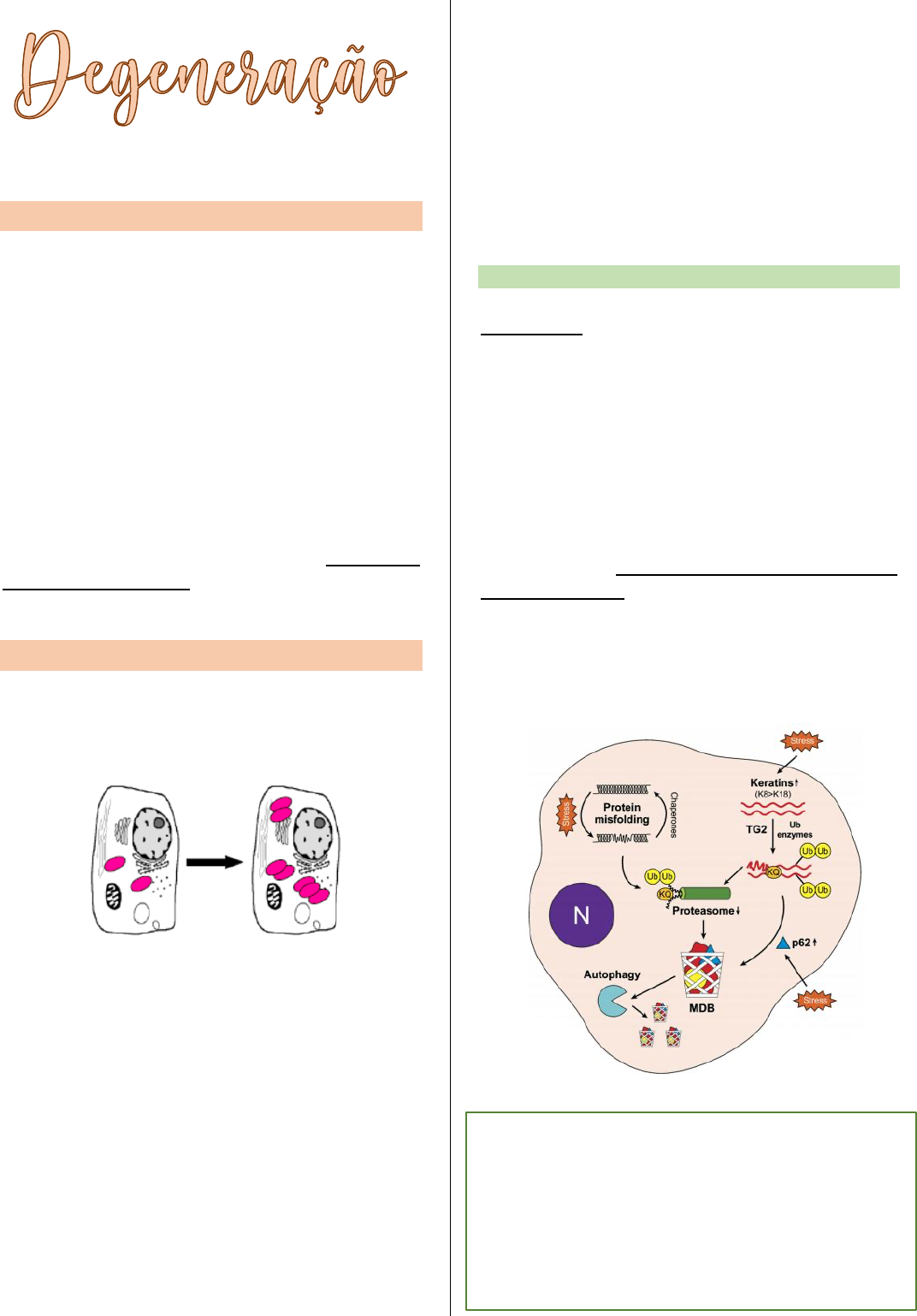 HIALINA INTRODUÇÃO Degeneração hialina - lesão celular reversível decorrente de alterações bioquímicas, resultando no acúmulo de proteínas no interior (intracitoplasmática) das células. Transformação hialina – acúmulo de proteínas na matriz extracelular (MEC). Hialinose - acúmulo de proteínas na parede de artérias pequenas ou arteríolas – proteínas solúveis, o organismo consegue remover. Amilóidose – acúmulo de proteínas fibrilares insolúveis na MEC – nesse caso o organismo não tem a capacidade de remover essa proteína, já que ela é insolúvel, só tirar no caso de cirurgia. DEGENERAÇÃO HIALINA É o acúmulo intracitoplasmático de proteínas. As proteínas acumuladas apresentam -se como vacúolos, gotículas ou agregados arredondados eosinófilicos (rósea) no citoplasma. Mecanismo patogênicos gerais: aumento da captação (proteínas endocitadas), aumento da produção (acúmulo de proteína) e condensação de filamentos e proteínas – alterações mediadas por EROS. Quando identificada é importante para direcionar o diagnóstico, já que existe vários tipos. *Corpúsculo de Mallory-Denks – encontra-se muito nos hepatócitos. *Corpúsculo de Russell – encontra-se nos plasmócitos. Corpúsculo de Councilman-rocha lima – corpos apoptóticos de hepatócitos, encontra-se nos hepatócitos e macrófagos. *Corpúsculo Goticular – encontra-se nas células epiteliais do túbulo contorcido proximal. Corpúsculo de Negri – encontra-se nos neurônios. Corpúsculo de mallory-Denks Encontrado muito nos hepatócitos, devido a doenças hepática alcoólica e doença hepática não alcoólica (medicamentos e síndrome metabólica/diabetes mellitus). Doença hepática não alcoólica: Álcool é metabolizado no fígado, com isso terá alguns substratos devido a essa metabolização como: radicais livres e acetaldeído, eles causam oxidação proteica nas células, principalmente nas proteínas (queratina 8/18, microtúbulos e microfilamentos) do citoesqueleto. Após a oxidação proteica, terá uma condensação proteica, assim, formando grumos ou agregados eosinofílicos, isso que olhamos histológicamen- te. Questão de prova: nomeei o processo patológico geral – degeneração hialina. Específica – degeneração hialina mallory-denks. Patogênese - Oxidação proteica por radicais livres que leva a condensação de proteínas do cito esqueleto, formando grumos eosinofílicos. Nesse caso está tendo esteatose e degeneração hialina, pois afetou as proteínas microtúbulos e microfilamentos. Logo, quando for por álcool terá esteatose e degeneração hialina. Diabetes mellitus: glicose + proteínas = glicação com isso forma muito ARES (produtos finais de glicação avançadas), assim, aumento o EROs, levando a oxidação de proteínas, dessa forma, tendo muita inflamação. Corpúsculo de Russell Produção excessiva de imunoglobulina, levando a distensão do retículo endoplasmático nos plasmócitos, tendo inclusão eosinofilica. Inflamação: salmonelase, leishmaniose osteomielites. *Mioloma múltiplo (câncer de plasmócitos), esses plasmócitos neoplásicos, aumenta a produção de imunoglobulina (Ig). Corpúsculo de Councilman-Rocha Lima Corpos apoptóticos de hepatócitos, os quais que sofreram apoptose por alguns motivos, podendo ser infecções virais, principalmente: Hepatite A e B, Febre amarela (brasileiro Rocha Lima que fez o estudo). O paciente chega com grave estado de icterícia Corpúsculo Goticular Acúmulo de vesículas pinocitóticas carreadas/preenchidas de proteínas no citoplasma de células epiteliais dos túbulos contorcido proximais. Síndrome nefrótica: condição clínica que existem em várias doenças renais, que levam a uma hipoalbunemia (diminuição de albumina) e intensa proteinúria (perda de proteína pela urina). Os sinais clínicos são espuma na urina e edema generalizado. As doenças que podem levar isso é a Diabetes Mellitus e Lúpus. A disfunção glomerular irá aumentar a concentração de proteínas no filtrado glomerular, com isso o corpo vai tentar reabsorver o máximo de proteínas no túbulo contorcido proximal, só que pela grande quantidade, não consegue devolver tudo para corrente sanguínea, assim, acumulam-se no citoplasma das células formando as gotículas eosinofílica. Corpúsculo de Negri É um acúmulo intracitoplasmático de proteínas virais no citoplasma dos neurônios. Encefalopatia viral: inflamação do encéfalo por conta do vírus da raiva. Esse vírus colonizam os neurônios, assim, produzindo proteínas virais, dessa forma, acumulando e formando inclusões eosinofílicas. Resumo histológico Degeneração hidrópica, gordurosa, hialina- esteatose, Russell, goticular, hidrópica-hialina. TRANSFORMAÇÃO HIALINA Acúmulo excessivas de fibras colágenas tumefeitas (inchado) e espessas na MEC (interstícios). Queloide (não respeita área lesionada, não regredi) e cicatriz hipertrófica (só cresce no local da lesão e tende a regredir) – são caracterizadas por deposição excessivas de colágenos. Por conta do aumento da sensibilidade dos fibroblastos, assim, tendo uma resposta exagerada. *Hialinose arteriolar ou arterioloesclerose hialina. Acúmulo de proteínas plasmáticas e proteínas da matriz extracelulares produzidas pelas células musculares lisas na região subendotelial. Arteríola: túnica íntima (epitélio simples pavimentoso), túnica média (tec. muscular liso) e túnica adventícia (tec. conjuntivo). O acúmulo acontece na região do subendotelial, fazendo com que diminua o diâmetro da arteríola, dessa forma, podendo causa atrofia das células, degeneração hidrópica ou gordurosa, podendo ter necrose, disfunções de órgãos ou tecidual. Hipertensão arterial sistêmica – Principal arteríola comprometida dessa doença é a arteríola glomerular aferente. Com o aumento da pressão arterial leva com que o sangue se choque mais com o endotélio
