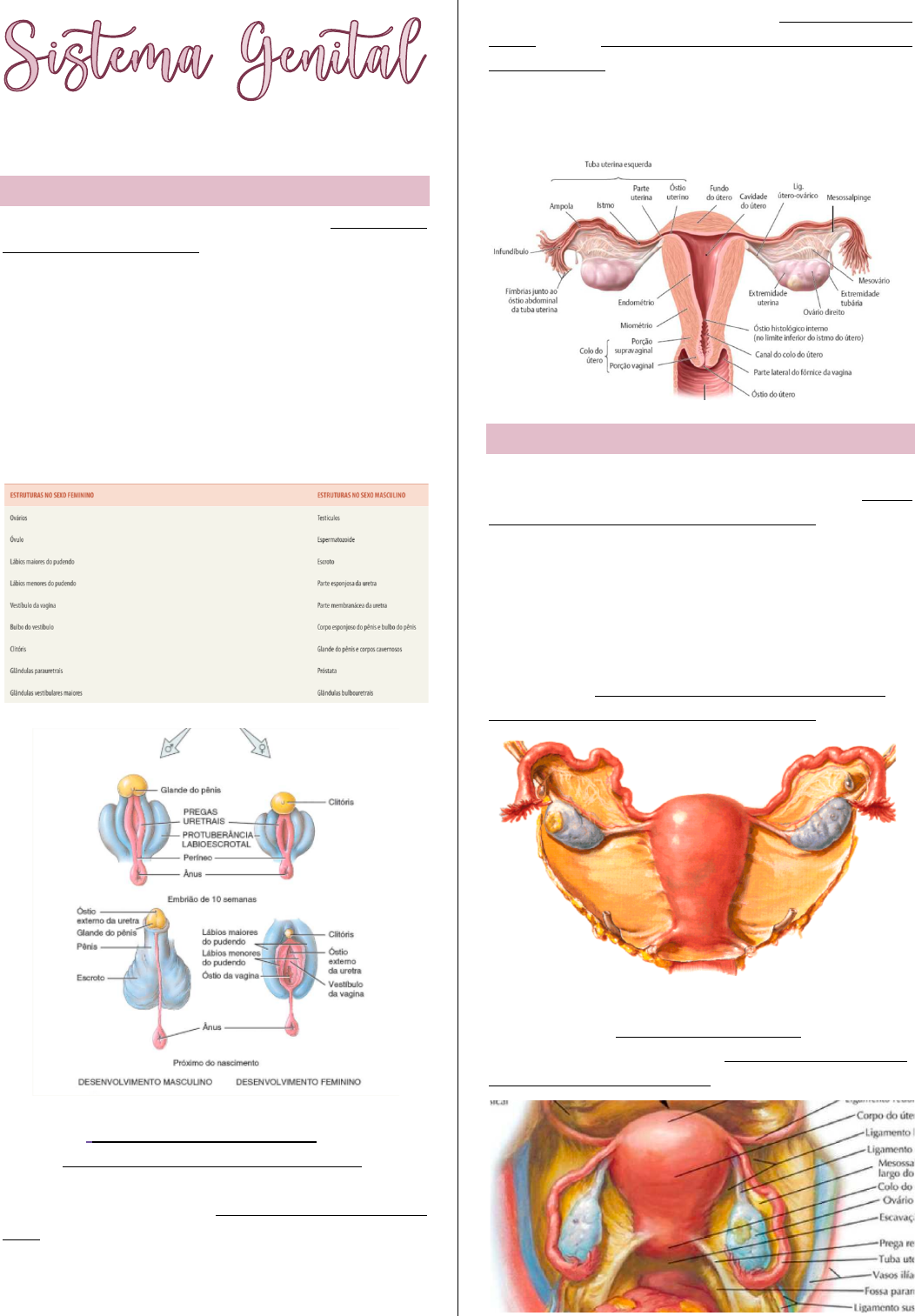 João Manuel – Medicina Nove de Julho FEMININO – ANATOMIA INTRODUÇÃO Tem muitas estruturas homólogas do sistema reprodutor masculino. • Escroto à Lábios maiores; • Linha haff à Lábios menores; • Glândula do pênis à Clítoris; • Gônada masculina/testículo à ovário; • Próstata à Glândulas parauretrais (glândula menor); • Glândulas bulbouretrais à Glândulas vestibulares (glândula maior). A função do sistema reprodutor é reproduzir, com a finalidade de perpetuar a espécie. A mu- lher libera ovócito/oócito 2. Também libera hormônios femininos, progesterona e estrogê- nios. Esse sistema serve de cópula (relação se- xuais), a parte que usa é a vagina. Também per- mite a condução do ovócito, formação do feto. Todo mês ocorre a menstruação. Vagina é canal aberto, se abre no óstio da va- gina e este permite uma comunicação com o meio interno. Esta comunicação pode propiciar uma infecção, que pode subir e atingir cavidade abdominal. A comunicação pode levar doenças inflamatórios. OVÁRIO Os ovários têm um tamanho de amêndoa, aqui onde produz o ovócito e hormônio. É preso por ligamentos e pregas de peritônio. Cavidade abdominopélvico: o útero se encon- tra na cavidade pélvica, sendo intraperito- neal ou abdominopélvica (depende da mu- lher), mas de maneira infraperitoneal. Já os ovários e tubas uterinas atinge a cavidade ab- dominal. O útero fica apoiado sobre a bexiga, as tubas vem sentido lateral e posterior. Margens do ovário: Uma extremidade voltada para o útero: extremidade uterina; uma extre- midade para tuba uterina: extremidade tubária; uma face medial e lateral. João Manuel – Medicina Nove de Julho Ligamentos: • Ligamento útero-ovárico: liga o ovário no útero; • Ligamento suspensor do ovário: sus- pende ovário, o qual vai passar artéria e veia ovárica; • Mesovário: é uma projeção do peritônio que se liga na margem mesovárica e a ou- tra margem é livre. Vascularização: • Irrigação: Artérias ováricas que ramo da aorta abdominal. • Drenagem: Plexo pampiniforme dre- nam para as veias de ováricas, o Veia ovárica direita drena direta para veia cava inferior; o Veia ovárica esquerda drena pri- meiro para veia renal esquerda e depois para veia cava inferior. Síndrome do ovário: acaba ocorrendo a onuvo- lução (não libera o óvulo), por conta disso forma cisto. Pode ser por conta de desregulação de eixo, uso de anticoncepcional ao longo dos anos. Pode levar dificuldades de engravidar. TUBAS UTERINAS É nelas que vai acontecer a fertilização e fe- cunda, isso ocorre na parte da ampola. É dividido em 5 partes: A primeira parte são as fimbrias, uma parte dela se comunica com ová- rio, que recebe o nome de fímbria ovárica, de- pois vem a parte do infundíbulo, depois a parte da ampola, maior parte, depois vem um parte de estreitamento chamada de istmo, depois vem uma região que se comunica com o uterino, chamada de corno uterino, depois vem uma parte que fica dentro do útero, que é chamada de intramural ou intrauterina. Ligamentos: mesovário, mesosalpinge (pro- jeção do peritônio – estabiliza as tubas ) e me- sométrio (estabiliza o útero). Esses três juntos forma o ligamento largo do útero. A função de proteção e estabilização. Gravidez ectópica tubária: O crescimento desse feto, pode levar o rompimento da tuba, pode levar hemorragia, logo, essa gravidez não pode seguir. João Manuel – Medicina Nove de Julho Vascularização: • Irrigação: ramos tubários que se ori- gina das artérias uterinas e ováricas. • Drenagem: vv. tubárias drenam para as vv. ováricas e para o plexo venoso ute- rino. Esse drena para as v. uterina, que por sua vez, drenam para as v. ilíaca in- terna. Laqueadura: é um método cirúrgico de con- trole da natalidade. Os oócitos que são liberados pelos ovários e entram nas tubas uterinas des- sas pacientes, degeneram e são logo absorvidos. Cuidado para não grampear o ureter junto, por- que ele passa pertinho, tem que observar se a mulher está urinando pós-operatório. ÚTERO Tem comprimento de 7,5cm por 5cm. Ele se apoia por cima da bexiga, por isso quando a mu- lher engravida vai ao banheiro várias a s vezes, como fica em cima, acaba estimulando a bexiga. O peritônio reveste e forma algumas escava- ções: escavação retrouterino (reto e útero), es- cavação vesicouterina (bexiga e útero). Geralmente na maioria das mulheres o útero se encontra antivertido (canal vaginal com o útero formando o ângulo) e antifletido (colo com o útero formando o ângulo). Quando o útero não se encontra dessa maneira ele pode ter graus de retroversão útero vai no sentido contrário. O problema desse grau retro- vertido é que se a mulher engravida é uma gra- videz mais complicada (quando vai em direção ao canal da vagina). O útero tem duas faces: Face anterior (relacio- nada com a bexiga urinária); Face posterior (intestinal). O útero é divido em algumas regiões: colo do uterina (útero com o canal vaginal), istmo do útero (parte estreita), o corpo e fundo. João Manuel – Medicina Nove de Julho O colo é devido em duas porções: porção vagi- nal (encontra canal da vaginal) e porção supra- vaginal (em cima da porção vaginal). A cavidade do útero, tem cerca de 6 cm de com- primento do óstio uterino até a parede do fundo do útero. A cavidade do útero continua inferior- mente como o canal do colo do útero. Os cornos do útero são as regiões superolaterais da cavi- dade do útero, onde penetram as tubas uterinas. Papanicolau: avalia o colo do útero, para vê se as células não modicou, se não tem cancer do útero. Como não há peritônio entre a parte anterior do colo e a base da bexiga urinária, o câncer do colo do útero pode disseminar-se para a bexiga uri- nária por contiguidade. Também pode propa- gar-se por metástase linfogênica (pela linfa) para os linfonodos ilíacos ou sacra