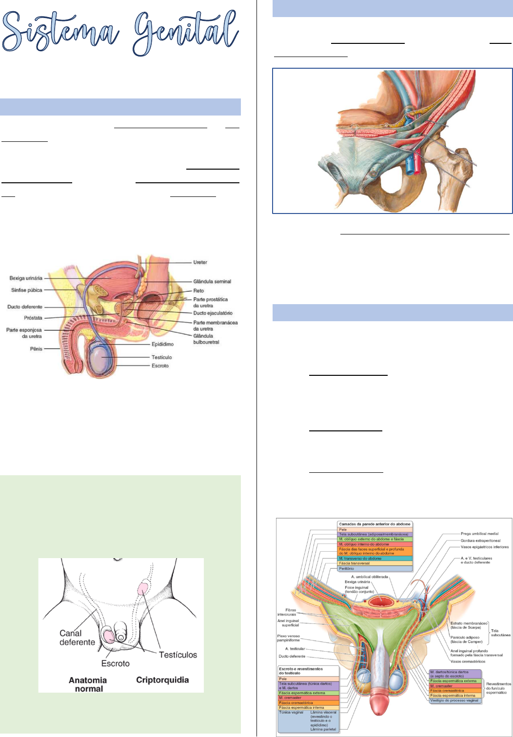 João Manuel – Medicina Nove de Julho MASCULINO – ANATOMIA INTRODUÇÃO A principal função do sistema reprodutor é a re- produção, perpetuação da espécie. O masculino vai produzir os gametas (espermatozoides), sustentar e transportá-los; por um sistema de grande ductos, recebendo secreções de glându- las. A gônada masculina são os testículos (ór- gãos primários), o qual vai produzir alguns hor- mônios; os órgãos secundários/acessórios são o restante. Órgãos externo: Parte distal da uretra (uretra esponjosa), escroto e o pênis. Órgãos Interno: As glândulas, ductos, epidí- dimo, testículo (desenvolve na cavidade abdo- minal, perto dos rins, retroperitoneal). OBS.: Tem condição que os testículos não desce e continua na cavidade abdominal, criptorqui- dia, eles não podem permanecer na cavidade, por conta da temperatura, pois acaba dimi- nuindo a produção de espermatozoides. Pode acontecer de maneira unilateral ou bilateral. Temperatura mais baixas produção espermato- zoides é maior e em temperaturas mais altas os espermatozoides não “sobrevivem”. CANAL INGUINAL É um canal que passa artérias, veias, nervos, nos meninos o ducto diferente, nas mulheres o liga- mento redondo. Por conta da descida do testículo por esse canal, ele é mais aberto, isso pode oferecer um surgi- mento de hernias inguinal (enfraquecimento da região, que oferece a saída de alguma conte- údo ou não). FUNÍCULO ESPERMÁTICO Todos os componentes que que passam pelo ca- nal, se chama funículo espermático, todas as es- truturas, inclusive envoltórios: • Primeira fáscia que vem do músculo oblíquo externo vai em direção a região inferior gerando a fáscia espermática externa. • Segunda fáscia vem do músculo oblíquo interno, gera a fáscia cremastérica, re- cobre o músculo cremaster. • Terceira fáscia vem do músculo trans- verso do abdômen gera a fáscia esper- mática interna. João Manuel – Medicina Nove de Julho A tela subcutânea é formada para túnica dar- tos e músculo dartos. Túnica vaginal é a pleura (peritônio), também se dividi em: • Lâmina Visceral: envolve o testículo, epi- dídimo e funículo. • Lâmina Parietal; também possui líquido. Os músculos do testículo: externo à interno – músculo dartos (músculo liso – sistema autô- nomo), músculo cremaster (músculo estriado esquelético – inervação somática – nervo geni- tofemoral). - No frio: O músculo dartos, acaba fa- zendo com que o escroto suba, enrugar, contrair e espessar. Já o músculo cremaster, eleva o tes- tículo. Constituintes do funículo espermático: Ducto deferente, artéria testicular, artéria do ducto de- ferente, artéria cremastérica, Plexo venoso pam- piniforme (conjunto de veias que drenam o tes- tículo, funículo; drenam o sangue para veia tes- ticular), fibras nervosas simpáticas, nervo geni- tofemoral e vasos linfáticos. ESCROTO O escroto apresenta uma coloração mais in- tensa em comparação ao resto do corpo. O escroto vai ser dividido internamente, pelo septo do escroto; e externamente é marcada pela rafe do escroto, a qual é continua com a rafe do pênis. O septo dividi os testículos, isso é importante já que quando tiver infecção/inflamação um não passa para outro. Irrigação: o escroto são os ramos escrotais an- teriores e posteriores das artérias perirrenal e pudenda externa; junto com a artéria cremas- térica. Drenagem: As veias vão receber os mesmos no- mes. Drenagem linfática: linfonodo inguinal à lin- fonodo lombares. Inervação: ramos do plexo lombar e plexo sa- cral. TESTÍCULO Os testículos estão suspensos no escroto pelos funículos espermáticos, possui uma face fi- brosa e resistente, túnica albugínea, a qual emite séptulos do testículos, os quais dividem em lóbulos, cada septo tem os túbulos seminífe- ros contorcidos à túbulos seminíferos retos à rede do testículo (mediastino do testículo) à João Manuel – Medicina Nove de Julho ductos eferentes à epidídimo (ele armazena, matura, capacita o espermatozoide). Irrigação: dos testículos é pela a. testicular (artéria gonodal), ela vem da aorta abdominal. Drenagem é diferente, ela se dar pelo plexo pampiniforme, ele drena o sangue para veia testicular. • Testículo esquerdo: veia testicular es- querda à veia renal esquerda à veia cava inferior. • Testículo direito: veia testicular direita à veia cava inferior. Drenagem linfática: direto para os linfonodos lombares. Inervação: ramos do plexo lombar e plexo sa- cral. Pode acontecer um acúmulo de líquido anor- mal (por trauma ou problemas de pressões hi- drostática) entre as lâminas vaginal: - Se o líquido for claro será uma hidro- cele, pode se dar no testículo no funículo. Pode ter acúmulo de sangue nessa região, formando a hematocele. - Pode ter uma acúmulo de líquido no epidídimo, espermatocele. - Torção do funículo espermático, acontece por uma frouxidão maior nessa re- gião, pode ter uma necrose. - Varicocele – plexo venoso pampini- forme é formado por veinhas, que ficam dilata- das e tortuosas, pode gerar infertilidade, pode ser congênito ou adquirir em decorrer com vida. PÊNIS Pênis ereto (posição anatômica) região: ante- rior ou ventral. Pênis flácido: posterior ou dor- sal. É um órgão é considerado de cópula, utili- zado para relações sexuais. Tem função dupla: micção e ejaculação. João Manuel – Medicina Nove de Julho É dividido em três partes: na raiz (está atrás da sínfise púbica – formado pela continuação do corpos esponjoso, bulbo do pênis, ele é envol- vido pelo músculo bulbo esponjoso – quando ele se contrai: ajuda na micção e na ejaculação; também terá a continuação dos corpos caverno- sos em ramos do pênis, envolvido pelo os mús- culos isquiocarvenosos – quando ele se con- trai: ajuda na micção e na ejaculação), no corpo e glande. É formado por três corpos: 2 co