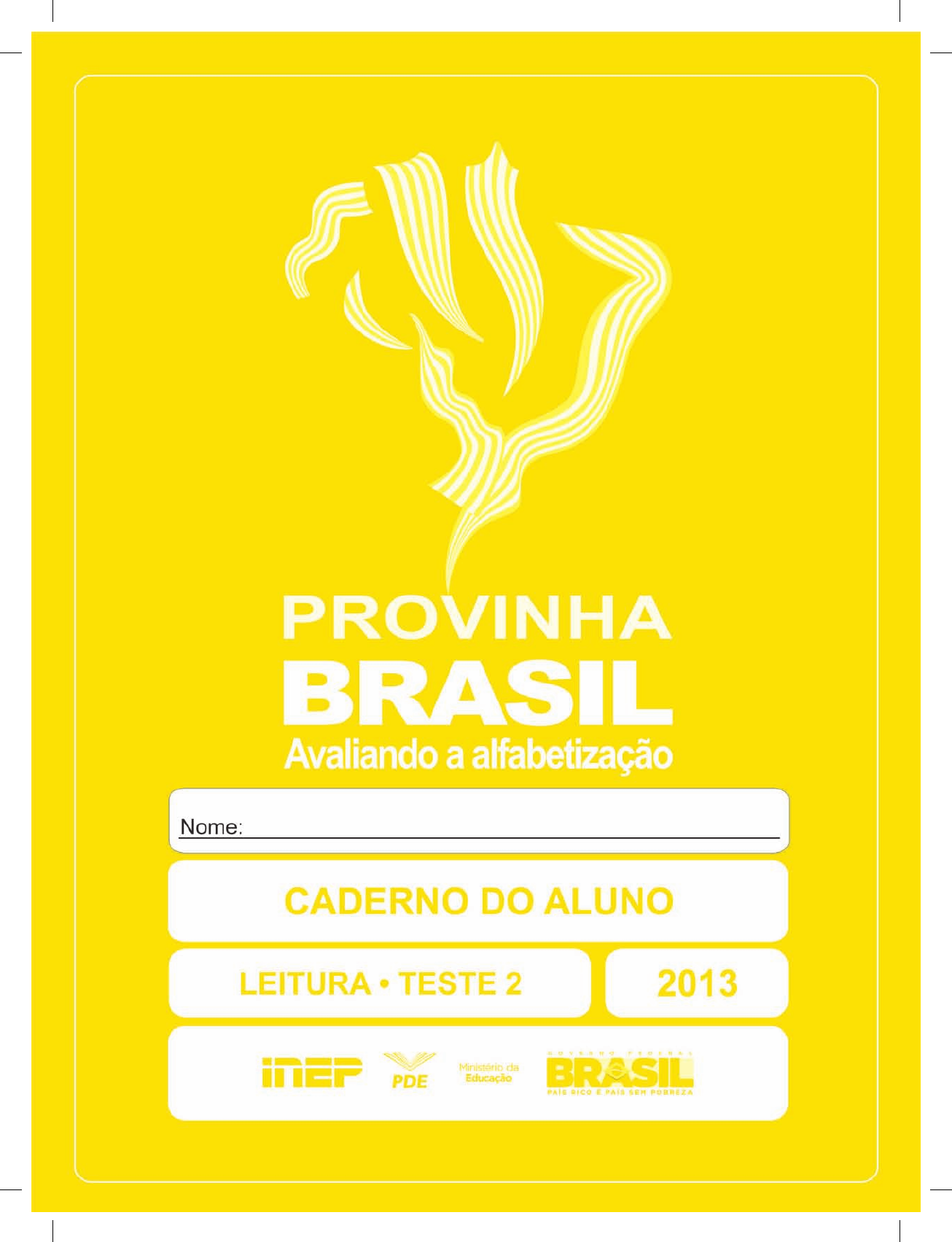 CADERNO ALUNO_LEITURA.indd 1 06/08/2013 11:47:15 Questão exemplo BOCA VOTA TOCA BOTA CADERNO ALUNO_LEITURA.indd 2 06/08/2013 11:47:16 Questão 1 7 896061 934582 FRONTEIRA Brasil Argentina 0 % M+ M- MR C 7 8 9 4 5 6 1 2 3 1 x x x2 EE ( - ). X 0 = eCalc CADERNO ALUNO_LEITURA.indd 3 06/08/2013 11:47:17 Questão 2 B G P N T C F M CADERNO ALUNO_LEITURA.indd 4 06/08/2013 11:47:18 Questão 3 gato - GATO pato - PATO porco - PORCO rato - RATO CADERNO ALUNO_LEITURA.indd 5 06/08/2013 11:47:19 Questão 4 CANJA JANTA ANDA ANTA CADERNO ALUNO_LEITURA.indd 6 06/08/2013 11:47:19 Questão 5 PATO BALA TELA DEDO CADERNO ALUNO_LEITURA.indd 7 06/08/2013 11:47:20 Questão 6 GAVETA GAMELA CARETA CANETA CADERNO ALUNO_LEITURA.indd 8 06/08/2013 11:47:21 Questão 7 TA JA HA GA CADERNO ALUNO_LEITURA.indd 9 06/08/2013 11:47:22 Questão 8 5 4 3 1 CADERNO ALUNO_LEITURA.indd 10 06/08/2013 11:47:23 Questão 9 RELEVO E OLHOS. RELIGIÃO E ÓLEO. RELÓGIO E ÓCULOS. REMÉDIO E ÔNIBUS. CADERNO ALUNO_LEITURA.indd 11 06/08/2013 11:47:24 Questão 10 CRIANÇAS BRINCANDO DE RODA. CRIANÇAS BRINCANDO DE BOLA. CRIANÇAS BRINCANDO DE CORRER. CRIANÇAS BRINCANDO DE PULAR CORDA. CADERNO ALUNO_LEITURA.indd 12 06/08/2013 11:47:25 Questão 11 UM FOGÃO. UM LIVRO. UMA COMIDA. UMA PANELA. CADERNO ALUNO_LEITURA.indd 13 06/08/2013 11:47:26 Questão 12 COCADA CORNETA CEBOLA CENOURA CADERNO ALUNO_LEITURA.indd 14 06/08/2013 11:47:27 Questão 13 A ORIENTAÇÃO SOBRE A IMPORTÂNCIA DO USO DE CINTO DE SEGURANÇA PARA CRIANÇA. A CONTAÇÃO DE UMA HISTÓRIA DE CONTO DE FADAS PARA CRIANÇA. A RECOMENDAÇÃO DA LEITURA DE UM LIVRO PARA CRIANÇA. A DIVULGAÇÃO SOBRE A IMPORTÂNCIA DA LEITURA PARA CRIANÇA. CADERNO ALUNO_LEITURA.indd 15 06/08/2013 11:47:28 Questão 14 Qual é o assunto do texto? OS JOGOS DA COPA. A BOLA OFICIAL DA COPA. O MASCOTE DA COPA. A DATA DA COPA. O MASCOTE DA COPA DE 2014 TODOS ESTAVAM ANSIOSOS PARA DESCOBRIR QUAL SERIA O MASCOTE OFICIAL DA COPA DE 2014, QUE SERÁ REALIZADA NO BRASIL. A NOTÍCIA FOI CONFIRMADA: O TATU BOLA FOI ESCOLHIDO PELA FIFA PARA SER O MASCOTE DA COPA. CADERNO ALUNO_LEITURA.indd 16 06/08/2013 11:47:29 Questão 15 PEIXINHO O PEIXINHO CHORAVA E CHORAVA. ERA TANTA A SUA MÁGOA QUE JÁ NÃO SABIA SE NADAVA EM LÁGRIMAS OU ÁGUA. NÃO QUERIA COMER, NÃO QUERIA BRINCAR, SÓ QUERIA CHORAR. O PEIXINHO ESTAVA COM SAUDADE DOS SAPINHOS DA LAGOA, DOS IRMÃOZINHOS, DOS PRIMINHOS, DAQUELA VIDA DE PEIXINHO TÃO BOA. O PEIXINHO CHORAVA E CHORAVA. SOZINHO NO FUNDO DO AQUÁRIO, JUSTO NO DIA DO SEU ANIVERSÁRIO. A SOLIDÃO DOS PRIMINHOS. A SAUDADE DE UM SAPINHO. A TRISTEZA DE UM PEIXINHO. A MÁGOA DOS IRMÃOZINHOS. CADERNO ALUNO_LEITURA.indd 17 06/08/2013 11:47:29 Questão 16 CONVIDAR PARA UMA CORRIDA. ALERTAR SOBRE O PERIGO DAS CORRIDAS. ENSINAR COMO SE FAZ UMA CORRIDA DE SACOS. CONTAR UMA HISTÓRIA SOBRE CORRIDA DE SACOS. CADERNO ALUNO_LEITURA.indd 18 06/08/2013 11:47:31 Questão 17 VOCÊ SABIA QUE... . . . AS ABELHAS BRASILEIRAS, COMO AS ESPÉCIES JATAÍ E ARAPUÁ, NÃO TÊM FERRÕES? AS QUE POSSUEM, E PRODUZEM MUITO MEL, SÃO AS DE ORIGEM EUROPEIA , QUE HOJE EM DIA ESTÃO MAIS AGRESSIVAS POR CAUSA DO CRUZAMENTO COM ABELHAS AFRICANAS. [ . . . ] DIVERTIR INFORMAR EMOCIONAR ARGUMENTAR CADERNO ALUNO_LEITURA.indd 19 06/08/2013 11:47:32 Questão 18 O PAI ORGULHOSO DE SI MESMO CHEGA PRO FILHO E PERGUNTA: — O QUE É QUE VOCÊ VAI FAZER QUANDO FOR DO TAMANHO DO PAPAI? O MENINO OLHA PRO PAI E RESPONDE RÁPIDO: — UMA DIETA. PORQUE O PAI ESTÁ GORDO. PORQUE O MENINO ESTÁ GORDO. PORQUE O PAI ESTÁ ORGULHOSO DO FILHO. PORQUE O MENINO ESTÁ ORGULHOSO DO PAI. CADERNO ALUNO_LEITURA.indd 20 06/08/2013 11:47:32 Questão 19 QUE VAI CHOVER MAIS. QUE CHOVEU BASTANTE. QUE AS NUVENS ESTÃO ZANGADAS. QUE AS NUVENS ESTÃO BRIGADAS. CADERNO ALUNO_LEITURA.indd 21 06/08/2013 11:47:33 Questão 20 CIENTISTAS. CRIANÇAS. MOSQUITOS DA DENGUE. PAI E MÃE. CADERNO ALUNO_LEITURA.indd 22 06/08/2013 11:47:34 CADERNO ALUNO_LEITURA.indd 23 06/08/2013 11:47:34 CADERNO ALUNO_LEITURA.indd 24 06/08/2013 11:47:35