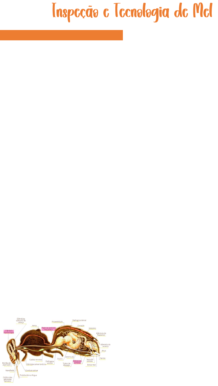 INTRODUÇÃO →Definição: mel é um produto alimentício produzido pelas abelhas a partir do néctar das flores e se secreções de certas plantas ou de excreções de insetos sugadores de plantas que ficam sobre as partes vivas das plantas que as abelhas recolhem, transformam, combinam com substâncias especificas próprias, armazenam e deixam maturara nos favos da colmeia (processo físico-enzimático) →As abelhas produzem mel, pois não conseguem gerar energia a partir do néctar e do pólen, por isso são transformadas nesse produto que, após ser maturado, oferece energia a elas Esse mel serve então de alimento para si próprias, já que não conseguem absorver nutriente diretamente →É então necessário ingerir essa matéria prima que, após o contato com enzimas naturais do seu organismo, formará o mel, que será regurgitado e depositado na melgueira, no interior da colmeia, onde ocorre sua maturação para posterior alimentação fracionada →O simples fato de se retirar constantemente o mel da colmeia funciona como um estimulo à produção continuada →Papo ou vesícula nectarífera é o local onde o néctar ficara após ser sugado pelas abelhas, para sofrer desidratação →Glândula hipofaríngea faz a produção das enzimas amilase, invertase e glicose-oxidase, que atuam no processo enzimático de produção de mel →Glândulas mandibular e cerífera são importantes para a produção de geleia real e cera, respectivamente PRODUÇÃO DO MEL →É um processo físico-enzimático, pois as abelhas coletam o néctar, secreções de plantas e exceções dos insetos sugadores e vão armazená-los em uma porção do seu corpo denominada papo/vesícula nectarífera, onde ocorrerá desidratação do néctar (processo físico) →Em seguida há o processo enzimático, no qual as abelhas combinam o amido do néctar com a sua própria amilase, fazendo a quebra em maltose. A sacarose presente no néctar, quando entra em contato com a enzima invertase, produzida pelas abelhas, é convertida em glicose e frutose. A glicose oriunda da quebra do dissacarídeo é quebrada pela enzima glicose- oxidase em ácido glucônico e peroxido de hidrogênio (H2O2) O ácido glucônico é responsável pela acidez do mel, tornando-o um meio não interessante para a proliferação de bactérias O H2O2 auxilia na conservação do mel, diminuindo a sua perecibilidade, tornando seu prazo de validade extremamente longo Os açúcares presentes no mel são entoa maltose, glicose e frutose →A produção é então finalizada com um processo físico, no qual há o regurgitamento do mel nos favos (mel verde), onde irá sofrer desidratação, formando o mel maturado, pronto para o consumo das abelhas e dos seres humanos →O mel é o produto menos perecível que existe, pois não é propicio a proliferação bacteriana pelo seu pH baixo, possui conservantes naturais, umidade baixa (+/- 20%), além de que o mel inspecionado é obrigatoriamente pasteurizado, o que elimina 100% dos organismos patogênicos e 99% dos deteriorantes PRODUÇÃO DA GELEIA REAL →Este é um produto com constituição diferente, sendo semelhante à produção do mel, porém no momento da regurgitação, ele entrará em contato com outras secreções das glândulas hipofaríngeas, que o enriquecem naturalmente →Após sua produção, é armazenado no ninho, também no interior da colmeia, para a alimentação da abelha rainha CLASSIFICAÇÃO ZOOLÓGICA →As abelhas especializadas na produção do mel pertencem ao Reino Animalia, Filo Arthropoda, Classe Insecta, Ordem Hymenoptera, Família Apidae, Gênero e Espécie Apis mellifera Abelhas europeias como Apis mellifera ligustica (italiana) e Apis mellifera mellifera (alemã) são mais especializadas na produção de mel, em virtude do clima naturalmente frio de onde estão inseridas Abelhas africanas como Apis mellifera scuttelata é originaria de uma região de clima mais quente e já não apresenta tanta especialidade nessa produção HISTÓRICO DA APICULTURA NO BRASIL →Abelhas Não são nativas do Brasil, tendo sido introduzidas em 1839 por Antônio Carneiro, que trouxe as 1ª espécies de Apis melífera da Europa →Durante esse período notou-se que as abelhas europeias não se adaptaram ao clima quente do país e, consequentemente, produzir mel de maneira satisfatória →Em 1956 foi necessário introduzir abelhas africanas para realizar o cruzamento, mas mesmo com essa combinação genética, o clima ainda apresentava grande influência na produção do mel →Apesar de existir grandes produções no Sul do país, favorecidas pelas baixas temperaturas, o Brasil ainda pode ser muito melhor e ocupar posição de maior destaque na produção mundial →Em 1974 observa-se maior racionalização da produção brasileira, que deixou de ser amadora e tornou-se profissionalizada e, por isso, em 1980 houve maior expansão do setor no país →Em 2009 o país alcançou seu ápice produtivo com posição de destaque no ranking mundial, sendo o 4º maior produtor →Com uma queda nos anos seguintes (2010- 2015), foi possível observar um crescimento ascendente da produção nos últimos 5 anos, voltando-se também ao mercado externo BIOLOGIA DAS ABELHAS E CICLO REPRODUTIVO →Abelhas são conhecidas por sua importância para a polinização e produção de mel, consideradas uma sociedade organizada, na qual os membros possuem suas funções bem estabelecidas →Fêmeas, tanto operárias como rainha, são organismos diploides (2n), enquanto o zangão é haploide (n), sendo que a rainha é maior que a operária e o zangão é mais escuro →ZANGÕES são originados de ovos não fecundados (partenogênese = desenvolvimento de embrião sem fecundação) e fazem a fertilização da abelha rainha, sendo que, após isso morrem, pois no acasalamento, seu órgão genital fica preso no corpo da rainha e se rompe Não possuem ferrão e não produzem mel, pois não possuem órgãos de defesa ne