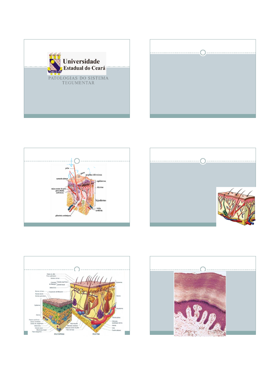 01/07/2021 1 PATOLOGIAS DO SISTEMA TEGUMENTAR 1. Introdução 2. Alterações de pigmentação 3. Alterações circulatórias 4. Alopecia 5. Alterações inflamatórias 6. Dermatoses físico-químicas 7. Dermatoses nutricionais 8. Dermatopatias infecciosas 9. Neoplasias cutâneas 10. Disfunções endócrinas PATOLOGIAS DO SITEMA TEGUMENTAR 1. Introdução A pele: Órgão... DERMATOPATOLOGIA DERMATO – DERMA = Pele; PATO – PATHOS = Doença; LOGIA – LOGOS = Ciência; estudo. ANATOMIA DA PELE CAMADA CÓRNEA CAMADA LÚCIDA CAMADA GRANULOSA CAMADA ESPINHOSA CAMADA BASAL EPIDERME DERME ANATOMIA DA PELE 3 4 5 6 7 8 01/07/2021 2 GLÂNDULA SEBÁCEA GLÂNDULAS SUDORÍPARAS MÚSCULO PILOERETOR PAPILA DÉRMICA INFUNDÍBULO ISTMO ANATOMIA DA PELE 9 10 11 12 13 14 01/07/2021 3 A pele: Órgão... Fatores endógenos Imunológicos, congênito, hereditário, hormonal e emocional... Fatores exógenos Infecciosos, nutricionais, físicos, químicos, alérgicos... 1. Introdução ALTERAÇÕES DA COBERTURA PILOSA HIPERTRICOSE X HIPOTRICOSE HIPERTRICOSE Ausência do pêlo, congênita ou hereditária, havendo menor quantidade do mesmo. SHPYNX CÃO CRISTADO CHINÊS HIPOTRICOSE 15 16 17 18 19 20 01/07/2021 4 2. Alterações da Pigmentação - Hipopigmentação - Hipopigmentação congênita - Hipopigmentação adquirida - Hiperpigmentação - Acantose nigricans - Reação cutânea pouco frequente caracterizado por hiperpigmentação, lignificação e alopecia*. Apresenta etiologia multifatorial (pode ser primário–idiopático ou secundário). 3. Alterações circulatórias - Edema - Hiperemia - Necrose e gangrena - Gangrena úmida - Gangrena seca - Cianose - Hemorragia É a ausência de pêlo adquirida em consequência da parada do seu crescimento. Temporária: mecânica (fricção, dermatoses), química (intoxicação por arsênio, selênio, mercúrio e tálio), infecciosa (dermatites). Alopecias determinadas por disfunção endódrina apresentam-se simétricas e geralmente são acompanhadas de hiperpigmentação, hiperceratose e não são pruriginosas. Permanente: causada por radiação, dermatites associadas à lesão no folículo piloso e por lesão traumática com cicatrização. 4. Alopecias RAREFAÇÃO PILOSA HIPOTRICOSE É DIFERENTE DE ALOPECIA! ALOPECIA Ausência do pêlo em áreas de cobertura pilosa devido a um estado de doença. Corte da pele Com pêlo Sem pêlo PADRÕES DE RESPOSTA À AGRESSÃO • ACANTOSE • ACANTÓLISE • HIPERQUERATOSE – Paraqueratose – Ortoqueratose • EXOCITOSE • DISPLASIA • INFLAMAÇÃO 21 22 23 24 25 27 01/07/2021 5 ACANTOSE ACANTÓLISE HIPERQUERATOSE HIPERQUERATOSE PARAQUERATOSE ORTOQUERATOSE ESPONGIOSE DISPLASIA 28 29 30 31 32 34 01/07/2021 6 INFLAMAÇÃO ETIOLOGIA BIOAGENTES Protozoários Ex. Leishmania spp. Vírus Ex. Apthovirus Artrópodes Ex. Dermatobia hominis Helmintos Ex. Habronema spp. Fungos Ex. Trycophiton spp. Bactérias Ex. Staphylococcus spp. Sarnas Ex. Psoroptes spp. ETIOLOGIA CAUSAS SEM BIOAGENTE ENVOLVIDO Radiação Ultravioleta Ex. Queratose actínica Fundo endócrino Ex. Síndrome de Cushing Alérgica Ex. DAPI Fundo nutricional Ex. Deficiência Zn Congênita Ex. Hipotricose Traumática Ex. Pioderma de calo Autoimune Ex. LES EPITELIOGÊNESE IMPERFEITA Focal ou multifocal Ausência de epitélio escamoso e, ou, mucosas Vida pós-natal curta Morte por desidratação Morte por septicemia EPITELIOGÊNESE IMPERFEITA ICTIOSE Do grego ICHTYOS = peixe Grupo de dermatopatias Hiperqueratose e formação de escamas Defeitos hereditários 35 36 37 38 39 40 01/07/2021 7 ICTIOSE FONTE: Necropsy Show and Tell. http:// http://w3.vet.cornell.edu/nst/ HIPERELASTOSE CUTÂNEA Herança genética Alteração enzimática Displasia do colágeno Fragilidade cutânea Áreas de “pele solta” Hipermobilidade das juntas HIPERELASTOSE CUTÂNEA SZCZEPANIK et al., Bulletin of the Veterinary Institute of Pulawy, 2006, 50, 609-612 HIPERELASTOSE CUTÂNEA HIPERELASTOSE CUTÂNEA EPIDERMÓLISE BOLHOSA Genodermatoses mecanobolhosas Defeitos na membrana basal Vesículas e bolhas que se rompem Lesões geralmente após nascimento Exclusão reprodutiva 41 42 43 44 45 46 01/07/2021 8 EPIDERMÓLISE BOLHOSA Dermatite perivascular Vasculite Dermatite nodular Dermatite difusa Dermatite granulomatosa Dermatite vesicular e pustular Perifoliculite Paniculite 5. Alterações inflamatórias Calosidades Higroma Dermatite Fotodinâmica (Fotossensibilização) Fotossensibilização primária (Hypericum perforatum – erva de S. João / Fagopyrum sagittatum – trigo sarraceno) Fotossensibilizaçãodo Tipo II ou endógena (deficiência de uroporfirinogênio III sintetase ou ferroquelatase – formação de agentes fotodinâmicos: uroporfirina e coproporfirina) Fotossensibilização do Tipo III ou hepatogênica (plantas hepatotóxicas (Lantana camara) ou contaminadas por fungos (Pithomyces chartarum – braquiária) Dermatite solar (queimadura solar – pele clara) 6. Dermatoses fisico-químicas FOTOSSENSIBILIZAÇÃO Hypericum perforatum (Erva de São João) Fagopyrum esculentum (Trigo mourisco) FOTOSSENSIBILIZAÇÃO FOTOSSENSIBILIZAÇÃO 47 48 49 50 51 52 01/07/2021 9 FOTOSSENSIBILIZAÇÃO FOTOSSENSIBILIZAÇÃO Intoxicação pelo arsênio (herbicidas, raticidas...) Intoxicação por naftaleno clorado (naftaleno clorado) Ergot (fungo: Claviceps purpurea) Intoxicação pelo festuca (Festuca arundinácea) Intoxicação pelo Selênio (Xylorryza spp, Stanleya spp, Oonopsis spp) Intoxicação pelo tálio (veneno de rato e baratas...) 6. Dermatoses fisico-químicas Deficiência de ácidos graxos Deficiência proteica Deficiências vitamínicas Deficiências vitamina A Deficiências vitamina E Deficiências de biotina Deficiências de riboflavina Deficiências de niacina 7. Dermatoses Nutricionais Deficiências minerais Paraceratose nutricional dos suínos Deficiência de Zinco associada a presença de ácido fítico na soja. Acomete principalmente animais jovens Esteatite - (Doença da gordura amarela