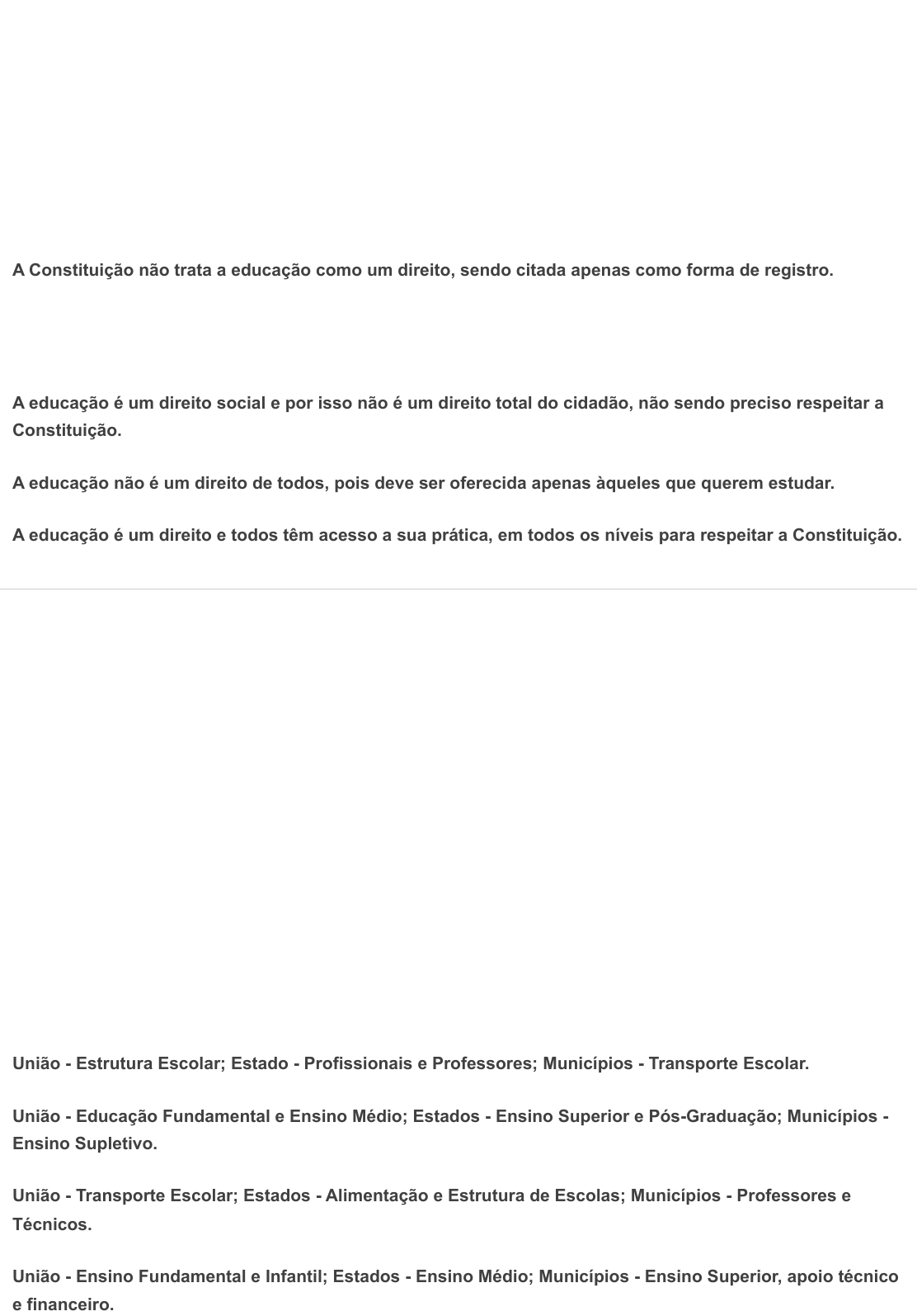 21/05/2023, 16:29 Comentários https://sereduc.blackboard.com/ultra/courses/_163370_1/outline/assessment/_7832328_1/overview/attempt/_26212148_1/review/inline-feedback… 1/7 Ocultar opções de resposta Ocultar opções de resposta Pergunta 1 1 / 1 A Constituição da República Federativa do Brasil, de 1988, é nossa principal lei. Nesse documento estão as regras de conduta e de funcionamento de todas as áreas do país, incluindo a educação. Em seu TÍTULO II: Dos Direitos e Garantias Fundamentais, Capítulo 2, artigo 6º, a educação é apresentada como o primeiro direito social. A respeito do direito à educação e a nossa realidade, escolha a alternativa correta: A Constituição não trata a educação como um direito, sendo citada apenas como forma de registro. Resposta correta A educação é um direito social que precisa ser respeitado e oferecido a todos, mas assim como outros direitos (como moradia e saúde) ainda não conseguiu ser estabelecida. A educação é um direito social e por isso não é um direito total do cidadão, não sendo preciso respeitar a Constituição. A educação não é um direito de todos, pois deve ser oferecida apenas àqueles que querem estudar. A educação é um direito e todos têm acesso a sua prática, em todos os níveis para respeitar a Constituição. Pergunta 2 1 / 1 As etapas de Ensino e as obrigações para o funcionamento de cada uma delas foram definidas pela Emenda 14ª da Constituição Federal e regulamentado pela Lei de Diretrizes e Bases da Educação (LDB). Cada membro da federação assume uma parte da responsabilidade do Sistema Educacional, sendo o Governo Federal (União), Governos dos Estados e Municípios, os sujeitos dessa organização. São atribuições da União, Estados e Municípios, respectivamente: União - Estrutura Escolar; Estado - Profissionais e Professores; Municípios - Transporte Escolar. União - Educação Fundamental e Ensino Médio; Estados - Ensino Superior e Pós-Graduação; Municípios - Ensino Supletivo. União - Transporte Escolar; Estados - Alimentação e Estrutura de Escolas; Municípios - Professores e Técnicos. União - Ensino Fundamental e Infantil; Estados - Ensino Médio; Municípios - Ensino Superior, apoio técnico e financeiro. 21/05/2023, 16:29 Comentários https://sereduc.blackboard.com/ultra/courses/_163370_1/outline/assessment/_7832328_1/overview/attempt/_26212148_1/review/inline-feedback… 2/7 Ocultar opções de resposta Resposta correta União - Ensino superior e pós-graduação, apoio técnico e financeiro; Estados - Ensino Médio; Municípios - Ensino Fundamental e Infantil. Pergunta 3 1 / 1 Relacione os elementos do sistema nacional de educação: (A) Plano Nacional de Educação- PNE (B) Base Nacional Comum Curricular (BNCC) ( ) propôs uma referência nacional para a formulação de currículos. ( ) responsável pela articulação entre os sistemas de ensino. ( ) estabelece superação das desigualdades educacionais, com ênfase na promoção da cidadania e na erradicação de todas as formas de discriminação. ( ) promove o princípio da gestão democrática da educação pública. ( ) valoriza os profissionais da educação. ( ) articula os sistemas de ensino. ABBAAB. Resposta corretaBBAAAB. BABBAA. ABABAA. BAABBA. Pergunta 4 1 / 1 A Lei de Diretrizes e Bases da Educação (LDB) trouxe em 1996 mudanças em relação a educação da pessoa com deficiência. Em seu capítulo V, chamado de “Educação Especial”. 21/05/2023, 16:29 Comentários https://sereduc.blackboard.com/ultra/courses/_163370_1/outline/assessment/_7832328_1/overview/attempt/_26212148_1/review/inline-feedback… 3/7 Ocultar opções de resposta Ocultar opções de resposta I. Estabelece que essa modalidade de educação deve ser oferecida para os portadores de necessidades especiais desde a educação infantil, preferencialmente na rede regular de ensino; II. O apoio especializado, sempre que necessário, será oferecido dentro das escolas regulares; III. Quando não for possível integrar esse atendimento à classe comum, ele será oferecido por meio de classes, escolas ou serviços especializados; IV. Esse modelo de educação fica sob a responsabilidade do educador em sala de aula. Escolha a alternativa que representa a sequência correta: II, III e IV estão corretas. III e IV estão corretas. II e III estão corretas. I e II estão corretas. Resposta corretaI, II e III estão corretas. Pergunta 5 1 / 1 O Ensino Fundamental é a etapa mais longa da formação educacional dentro do Sistema Educacional Brasileiro. Com duração de 9 anos, é realizado em duas etapas distintas, o Ensino Fundamental 1 (EF I) e o Ensino Fundamental 2 (EF II). São características das diferentes etapas do Ensino Fundamental: I. No EF I, o estudante é atendido por um professor que se encarrega de todas as disciplinas; II. A partir do EF II, o estudante recebe formação por área e têm diversos professores, divididos nas componentes curriculares; III. Entre o EF I e o EF II, há uma prova de admissão para que o estudante siga para a próxima etapa; IV. O EF II pode ser substituído por um prolongamento do EF I, com educador único; Escolha a alternativa que representa a sequência correta: I, II e III estão corretas. Resposta corretaI e II estão corretas. 21/05/2023, 16:29 Comentários https://sereduc.blackboard.com/ultra/courses/_163370_1/outline/assessment/_7832328_1/overview/attempt/_26212148_1/review/inline-feedback… 4/7 Ocultar opções de resposta III e IV estão corretas. II e III estão corretas. II, III e IV estão corretas. Pergunta 6 1 / 1 A Pedagogia habilita seus profissionais a atuarem também na gestão escolar. O Estatuto da Criança e do Adolescente trata da responsabilidade de gestores em relação à problemas percebidos pela escola, como segue: Art. 56. Os dirigentes de estabelecimentos de ensino fundamental comunicarão ao Conselho Tutelar os casos de: I - Maus-tratos envolvendo seus a