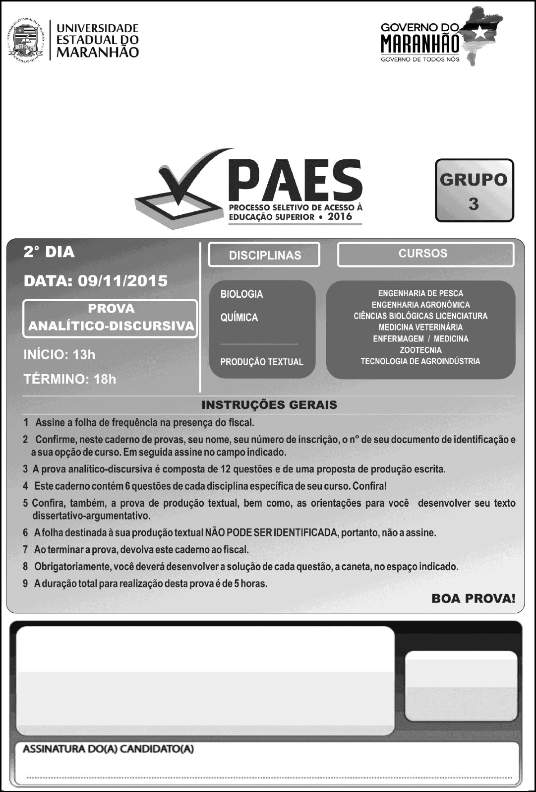 ASSESSORIA DE CONCURSOS E SELETIVOS DA REITORIA DIVISÃO DE OPERAÇÃO DE CONCURSOS VESTIBULARES Processo Seletivo de Acesso à Educação Superior – PAES/2016 - DOCV/UEMA 2° Dia – 09/11/15 das 13 às 18h Processo Seletivo de Acesso à Educação Superior – PAES/2016 - DOCV/UEMA 2° Dia – 09/11/15 das 13 às 18h BIOLOGIA 01 - A Acetabularia é uma alga marinha, unicelular, com cerca de 5 cm de altura, cuja estrutura é formada por um “chapéu”(ou umbela) e uma haste (ou pé), onde se localiza o núcleo. Analise as experiências de microdissecção realizadas com essa alga, demonstradas nos esquemas abaixo. SOARES, José Luis. Biologia. São Paulo: Scipione, v.único, 1997, p.63. Com base nas experiências apresentadas, explique os resultados observados, destacando o papel do núcleo celular. ________________________________________________________________________________________________________ ________________________________________________________________________________________________________ ________________________________________________________________________________________________________ ________________________________________________________________________________________________________ ________________________________________________________________________________________________________ ________________________________________________________________________________________________________ ________________________________________________________________________________________________________ Processo Seletivo de Acesso à Educação Superior – PAES/2016 - DOCV/UEMA 2° Dia – 09/11/15 das 13 às 18h 02 - O Reino Plantae é representado por mais de 300.000 espécies, cuja história evolutiva foi marcada pela grande capacidade adaptativa na conquista gradual e extensa do ambiente terrestre, durante a qual as plantas desenvolveram estruturas e mecanismos especiais capazes de superar problemas como a perda de água para o ar e a garantia da fecundação. A árvore evolutiva abaixo representa o surgimento de algumas dessas características, mostrando que a longa história evolutiva das plantas envolveu vários passos. SILVA Jr., César da; SASSON, Sezar; CALDINI Jr., Nelson. Biologia. 10ª ed. São Paulo, v. 2, 2010, p. 398. Após analisar a árvore, explique cada passo evolutivo característico das embriófitas, traqueófitas, espermatófitas e antófitas. ________________________________________________________________________________________________________ ________________________________________________________________________________________________________ ________________________________________________________________________________________________________ ________________________________________________________________________________________________________ ________________________________________________________________________________________________________ ________________________________________________________________________________________________________ ________________________________________________________________________________________________________ ________________________________________________________________________________________________________ 03 - As células são unidades morfofisiológicas dos seres vivos e da sua complexidade depende a vida, possuindo organelas especializadas na realização de determinadas funções. Construindo um paralelo, a ilha de São Luís do Maranhão é limitada pelas Baías de São Marcos e São José, incluindo os municípios de São Luís, São José de Ribamar, Paço do Lumiar e Raposa, e é alimentada energeticamente pela estação do Sacavém. Além disso, possui um complexo sistema de circulação de produtos e de pessoas. a) Relacione os elementos apontados na caracterização da ilha com os componentes celulares denominados: retículo endoplasmático, mitocôndrias e membrana plasmática. ________________________________________________________________________________________________________ ________________________________________________________________________________________________________ ________________________________________________________________________________________________________ ________________________________________________________________________________________________________ b) A seguir, explique suas respectivas funções. ________________________________________________________________________________________________________ ________________________________________________________________________________________________________ ________________________________________________________________________________________________________ ________________________________________________________________________________________________________ Processo Seletivo de Acesso à Educação Superior – PAES/2016 - DOCV/UEMA 2° Dia – 09/11/15 das 13 às 18h 04 - Anatomicamente, os insetos são bastante uniformes com apêndices, cabeça, tórax e abdômen e a presença de um exoesqueleto. À medida que o animal vai crescendo, ocorre o rompimento desta “carapaça” em algum ponto do corpo do animal e essa estrutura é comumente encontrada abandonada. O gráfico abaixo mostra as linhas A e B, que representam curvas de crescimento de organismos. PEZZI, Antônio C.; GOWDAK, Demétrio O.; MATTOS, Neide S. Biologia: Ensino Médio. São Paulo: FTD, 2014, p. 364. Considerando o gráfico, indique a curva (A ou B) que define corretamente o crescimento dos insetos. Justifique sua resposta, analisando comparativamente as duas curvas. ________________________________________________________________________________________________________ ________________________________________________________________________________________________________ ________________________________________________________________________________________________________ _________________________________