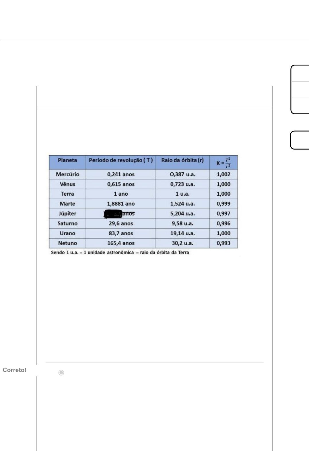 21/05/2023, 17:07 HUMBERTO CESAR DE OLIVEIRA BATISTA, histórico de teste: Área: Física Mecânica Clássica - Teste Final https://famonline.instructure.com/courses/27956/quizzes/144281/history?version=1 1/15 Área: Física Mecânica Clássica - Teste Final Resultados para HUMBERTO CESAR DE OLIVEIRA BATISTA Pontuação desta tentativa: 10 de 10 Enviado 21 mai em 16:01 Esta tentativa levou 22 minutos. 1 / 1 ptsPergunta 1 (UFRGS - 2011) Observe a tabela dos períodos e raios de órbitas dos planetas. Considere o raio médio da órbita de Júpiter em tomo do Sol igual a 5 vezes o raio médio da órbita da Terra. Segundo a 3ª Lei de Kepler, "o quociente dos quadrados dos períodos e o cubo de suas distâncias médias do sol é igual a uma constante K, igual a todos os planetas". Assim, o período de revolução de Júpiter em tomo do Sol (translação) é de aproximadamente 11 anos Correto!Correto! A+ A A- 21/05/2023, 17:07 HUMBERTO CESAR DE OLIVEIRA BATISTA, histórico de teste: Área: Física Mecânica Clássica - Teste Final https://famonline.instructure.com/courses/27956/quizzes/144281/history?version=1 2/15 Resposta Correta. A 3ª lei de Kepler indica que o quadrado do período de revolução de cada planeta é proporcional ao cubo do raio médio de sua órbita. Por isso, quanto mais distante o planeta estiver do sol, mais tempo levará para completar a translação. Matematicamente, a terceira Lei de Kepler é descrita da seguinte maneira: T ao quadrado sobre r ao cubo igual a K Onde: T: corresponde ao tempo de translação do planeta R: o raio médio da órbita do planeta K: valor constante, ou seja, apresenta o mesmo valor para todos os corpos que orbitam ao redor do Sol. A constante K depende do valor da massa do Sol. Conforme dado no problema o raio médio da órbita de Júpiter em tomo do Sol é igual a 5 vezes o raio médio da órbita da Terra, ou melhor: Rj = 5. Rt, substituindo em: . Para Júpiter: Para a Terra: Se o período de translação da Terra é de 1 ano, então: E daí, Conclui-se que o período de revolução de Júpiter em tomo do Sol (translação) é de aproximadamente 11 anos. 110 anos 5 anos 125 anos 25 anos A+ A A- 21/05/2023, 17:07 HUMBERTO CESAR DE OLIVEIRA BATISTA, histórico de teste: Área: Física Mecânica Clássica - Teste Final https://famonline.instructure.com/courses/27956/quizzes/144281/history?version=1 3/15 1 / 1 ptsPergunta 2 (UDESC) A aceleração da gravidade na superfície do planeta Marte é aproximadamente 4,0 m/s . Calcule a que altura da superfície da Terra deve estar uma pessoa com massa de 100,0 kg, para ter o mesmo peso que teria na superfície de Marte. 2 3,6 x (10)6 m Correto!Correto! A+ A A- 21/05/2023, 17:07 HUMBERTO CESAR DE OLIVEIRA BATISTA, histórico de teste: Área: Física Mecânica Clássica - Teste Final https://famonline.instructure.com/courses/27956/quizzes/144281/history?version=1 4/15 O peso de um corpo de massa m é uma força, sendo resultado da ação do campo de gravidade da Terra so bre ele. Desprezando a rotação da Terra e a ação da gravidade exercida pelo Sol, Lua e outros astros, a força de atração da gravidade será igual ao peso. Pela Segunda Lei de Newton, começar estilo tamanho matemático 24px bold italic P negrito igual a bold italic m bold italic g fim do estilo Segundo Newton e a Lei da Gravitação Universal, a aceleração da gravidade é o resultado da força de atração que a Terra exerce sobre todos os corpos. Assim, a força gravitacional é calculada pela fórmula: Onde, F: É o módulo da força gravitacional entre dois corpos G: Constante de gravitação universal, considerando 6,67408.10 N.m²/kg² M e m: massa dos corpos (medida em quilogramas) d: distância entre os centros dos corpos (medida em metros) Fazendo P igual à própria força F: F espaço igual a espaço P espaço espaço P espaço igual a espaço G espaço numerador M m espaço sobre denominador d ao quadrado fim da fração espaço m g espaço igual a espaço G espaço numerador M m sobre denominador d ao quadrado fim da fração espaço espaço bold italic g negrito espaço negrito igual a negrito espaço bold italic G negrito espaço negrito M sobre negrito d à potência de negrito 2 Sendo assim, A força gravitacional é uma grandeza vetorial, ela atua na direção de um eixo imaginário que liga os dois corpos e, o sentido com que o corpo 1 atraí o corpo 2, é oposto ao que o corpo 2 atrai o corpo 1. Sendo uma força atrativa entre dois corpos, o módulo (valor numérico), com que uma partícula 1 é atraída por uma partícula 2, é o mesmo com que a partícula 2 é atraída pela partícula 1. Isso se deve ao fato de que a força gravitacional concorda com a terceira lei de Newton, sendo um par ação-reação. -11 A+ A A- 21/05/2023, 17:07 HUMBERTO CESAR DE OLIVEIRA BATISTA, histórico de teste: Área: Física Mecânica Clássica - Teste Final https://famonline.instructure.com/courses/27956/quizzes/144281/history?version=1 5/15 1,36 x (10)7 m 6,4 x (10)6 m 4,0 x (10)14 m 1,0 x (10)7 m 1 / 1 ptsPergunta 3 Um trem desloca-se com velocidade de 72 km/h, quando o maquinista vê um obstáculo à sua frente. Ele aciona os freios e pára em 5s. A aceleração média imprimida ao trem pelos freios, foi em módulo, igual a: -4m/s2 -5m/s2 -14,4m/s2 4m/s2 Correto!Correto! A resposta está correta. O cálculo da aceleração é feito por am = (vf - vi)/ (tf - ti) Considerando a velocidade final de 72km/h ou 20m/s, lembrando que divide por 3,6 para converter de km/h para m/s, então: Sendo assim, am=(0 – 20)/(5 – 0) , ou seja, am= - 4m/s2 . Em módulo, a aceleração am = -4m/s2 será am = |-4m/s2| = 4m/s2. 14,4m/s2 A+ A A- 21/05/2023, 17:07 HUMBERTO CESAR DE OLIVEIRA BATISTA, histórico de teste: Área: Física Mecânica Clássica - Teste Final https://famonline.instructure.com/courses/27956/quizzes/144281/history?version=1 6/15 1 / 1 ptsPergunta 4 (Uerj - 2015) Um carro, em um trecho retilíneo da estrada na qual trafe