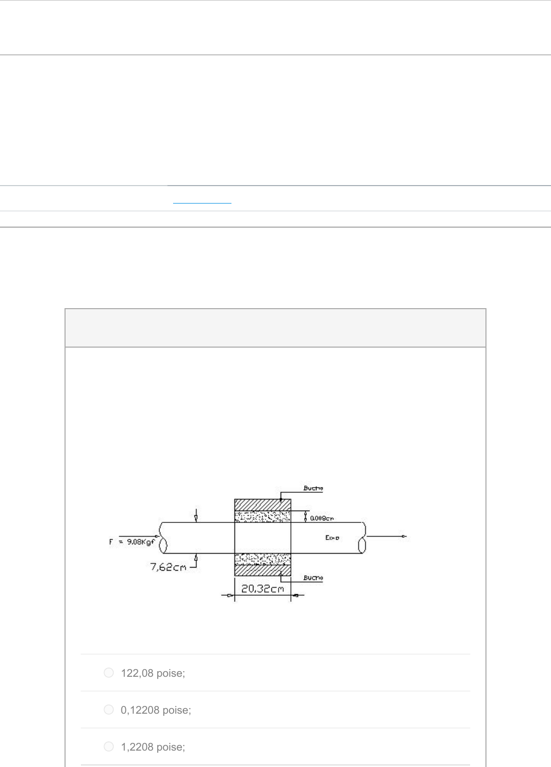 UNIDADE I_APLICAÇÃO_1_2021 Entrega 7 mar em 23:59 Pontos 3 Perguntas 15 Disponível 23 fev em 0:00 - 7 mar em 23:59 13 dias Limite de tempo Nenhum Este teste foi travado 7 mar em 23:59. Histórico de tentativas Tentativa Tempo Pontuação MAIS RECENTE Tentativa 1 227 minutos 3 de 3 Pontuação deste teste: 3 de 3 Enviado 6 mar em 15:05 Esta tentativa levou 227 minutos. 0,2 / 0,2 ptsPergunta 1 Um eixo de 7,62 cm de diâmetro escorrega com 0,12 m/s dentro de uma bucha de comprimento 20,32 cm e com folga radial 0,008 cm, conforme figura abaixo, quando uma força de 9,08 kgf é aplicada. Determinar a viscosidade absoluta do fluido entre o eixo e a bucha em (poise). Considere o perfil de velocidade linear. 122,08 poise; 0,12208 poise; 1,2208 poise; https://pucminas.instructure.com/courses/63792/quizzes/168512/history?version=1 12,208 poise; Correto!Correto! 0,2 / 0,2 ptsPergunta 2 CANO (2018) Um tubo liso horizontal de 5 cm de diâmetro interno transporta 0,0034 m /s de etanol com densidade 0,787 e viscosidade absoluta de 1,10 Pa·s. Determinar a velocidade média de escoamento de etanol, em (m/s) e o regime de escoamento. 3 −3 1,73 m/s e turbulento Correto!Correto! 1,73 m/s e laminar 6,20 m/s e turbulento 6,20 m/s e laminar 0,2 / 0,2 ptsPergunta 3 O campo de velocidades de um escoamento é dado por: Onde: Determinar se o escoamento é uni, bi ou tridimensional, permanente ou transiente. Bidimensional, permanente. Tridimensional, permanente. Tridimensional, transiente. Correto!Correto! Bidimensional, transiente. 0,2 / 0,2 ptsPergunta 4 Um fio magnético deve ser recoberto com verniz para fins de isolamento, puxando-o através de um orifício circular de 0,9 mm de diâmetro. O diâmetro do fio é de 0,8 mm e está centrado no orifício. O verniz (m = 20 centipoise) enche completamente o espaço entre o fio e as paredes do orifício, que tem um comprimento (profundidade) de 20 mm. O fio é puxado através do orifício a uma velocidade de 50 m/s. Determinar a força requerida para puxar o fio em (N). 10,1 N; 9,908 N; 1,01 N Correto!Correto! Nenhuma das alternativas acima. 0,2 / 0,2 ptsPergunta 5 A diferença de pressão no escoamento de sangue através de um bloqueio parcial numa artéria (conhecido como estenose), Δp, pode ser avaliada com a seguinte equação: Onde V é a velocidade média do escoamento de sangue, μ é a viscosidade dinâmica do sangue, ρ é a massa específica do sangue, D é o diâmetro da artéria, A é a área da seção transversal da artéria desobstruída e A é a área da seção transversal da estenose. Determinar as dimensões das constantes K e K . 0 1 v u F.t/L2 L/t adimensionais Correto!Correto! M/L3 0,2 / 0,2 ptsPergunta 6 WHITE, Frank M. Mecânica dos Fluidos. 6. ed. Porto Alegre: AMGH, 2011 Um bloco de peso P desliza para baixo em um plano inclinado lubrificado por um filme fino de óleo, como mostra a figura abaixo. A área de contado do filme é A e sua espessura h. Considerando uma distribuição linear de velocidade no filme, deduzir uma expressão para a velocidade “terminal” V (com aceleração igual a zero) do bloco. Determinar a velocidade “terminal” V em (m/s) do bloco se a massa do bloco é de 6 kg, a área de contato do filme é igual a 35 cm , o ângulo de inclinação do plano é de 15° e o filme de óleo SAE 30, tem uma espessura de 1mm a 20°C, com viscosidade dinâmica igual a 0,29 Pa.s. 2 15 m/s Correto!Correto! 56 m/s 1,5 m/s 5,6 m/s 0,2 / 0,2 ptsPergunta 7 Um bloco é puxado para cima sobre uma superfície inclinada cujo ângulo θ=25°, sobre a qual há uma fina película de um óleo, de espessura h = 0,01 in. Para que o bloco se movimente para cima com uma velocidade constante de 1,5 m/s, é necessária a aplicação de uma força F = 130 N. A densidade relativa do material do bloco é 5,3 e suas dimensões são a = 12 cm, b = 13 cm e c = 15 cm (perpendicular ao plano da figura). Sabendo que a densidade relativa do óleo é SG = 0,85, determinar sua viscosidade cinemática em (m /s). Considere que o perfil de velocidades na película de óleo é linear. o 2 8,7x10 m²/s;-2 8,7x10 m²/s;Correto!Correto! -4 87x10 m²/s;-4 0,87x10 m²/s.-4 0,2 / 0,2 ptsPergunta 8 No módulo de um foguete espacial, instalado na rampa de lançamento na terra (g = 9,81m/s ), coloca-se certa massa de um líquido cujo peso é W = 15 kgf. Determinar o peso W’ do mesmo líquido, quando o módulo do foguete estiver na lua (g’ = 1,70 m/s ), em (kgf). 2 2 26 kgf; 2,6 kgf; Correto!Correto! 86,5 kgf; 8,65 kgf. 0,2 / 0,2 ptsPergunta 9 A correia na figura, move-se a uma velocidade constante e desliza na parte superior de um tanque de óleo de viscosidade m, como mostra a figura abaixo. Considerando uma distribuição linear de velocidade no óleo, determinar a potência P necessária para acionamento da correia, em (W), se ela move a 2,5 m/s em óleo SAE30W a 20° (viscosidade dinâmica igual a 0,29 Pa.s), com L = 2 m; b = 60 cm e h = 3 cm. 29 W 0,0725 W 73 W Correto!Correto! 0,029 W 0,2 / 0,2 ptsPergunta 10 CANO (2018) Um determinado veículo é abastecido com um combustível de peso específico 6,67 kN/m . Considere que o tanque de combustível tem capacidade volumétrica de 50 L. Determinar a massa do combustível, em (kg), quando o tanque estiver cheio, desprezando a existência prévia de outro combustível. Dado: aceleração da gravidade, g= 9,81 m/s . 3 2 68 kg 39,2 kg 34 kg Correto!Correto! 33,35 kg 0,2 / 0,2 ptsPergunta 11 A densidade da água a 25 °C é de 62,4 lbm/ft . O valor dessa densidade em (kg/m ). 3 3 62,4 kg/m3 31,2 kg/m3 999,5 kg/mCorreto!Correto! 3 1889,5kg/m3 624,0 kg/m3 0,2 / 0,2 ptsPergunta 12 A distribuição de velocidades para o escoamento laminar entre placas paralelas é dada por: Onde h é a distância separando as placas, e a origem é colocada a meio caminho entre as placas. Considerar um escoamento de água a 15ºC (m = 1,1x10 N.s/m ), com u = 0,30 m/s e h = 0,50 mm. Determinar a tensão de cisalhamento na placa superio