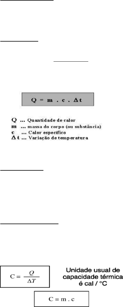 CALORIMETRIA. A calorimetria é um tema da física que trabalha a troca de calor entre os corpos. De acordo com o conceito de equilíbrio térmico, quando dois corpos a temperaturas diferentes são colocados em contato, eles atingem, após algum tempo, a mesma temperatura. Calor sensível Quando um corpo tem a sua temperatura alterada, podendo também sofrer mudanças em suas dimensões, dizemos que ele recebeu somente calor sensível. Portanto, o calor do tipo sensível é capaz de variar a temperatura de um corpo, alterando ou não as suas dimensões, por meio do processo de dilatação térmica. Calor específico Uma grandeza importante está presente na equação acima, o calor específico, representado pela letra c. Calor específico é uma unidade que indica a quantidade de calorias necessárias para se elevar em 1,0 ºC uma massa de 1,0 g de determinada substância. Essa unidade é medida com referência na água pura, cujo calor específico é igual a 1,0 cal/gºC. Capacidade térmica" uma grandeza física utilizada para definir a quantidade de calor que um corpo deve receber, ou ceder, para que a sua temperatura varie em 1,0 ºC ou 1,0 K. Diferentemente do calor específico, essa grandeza está relacionada com o corpo como um todo, e não somente com cada grama de sua composição. Por essa razão, dizemos que calor específico é uma propriedade da substância, enquanto a capacidade térmica é uma propriedade do corpo em si. Calor Latente O calor latente, também chamado de calor de transformação, é uma grandeza física que designa a quantidade de calor recebida ou cedida por um corpo enquanto seu estado físico se modifica.Importante destacar que durante a transformação a temperatura permanece a mesma, ou seja, constante. Exercicios de aprendizagem. 1-Toda substância apresenta uma propriedade física que determina qual é a quantidade de calor necessária por unidade de massa desse corpo para que a sua temperatura varie em 1ºC ou 1K. Essa propriedade e sua unidade física, no Sistema Internacional de Unidades, são, respectivamente, iguais a: 2-Um corpo de 10 kg precisa receber 2500 J de calor sensível para ter sua temperatura variada em 10 K. Determine sua capacidade térmica. 3-Um corpo com 10,0 kg de massa tem capacidade térmica igual a 20,0 J/K. Determine o seu calor específico. 4-Um corpo de 500 g que se encontra a uma temperatura inicial de 25 ºC recebe de um aquecedor uma quantidade de calor sensível igual a 5000 cal, atingindo uma temperatura de 30 ºC ao final do processo de aquecimento. Determine o calor específico desse corpo. 5-(UFPR) Para aquecer 500 g de certa substância de 20 °C para 70 °C, foram necessárias 4000 calorias. A capacidade térmica e o calor específico valem, respectivamente: 6-(Fuvest) Um amolador de facas, ao operar um esmeril, é atingido por fagulhas incandescentes, mas não se queima. Isso acontece porque as fagulhas: 7-Um corpo de massa 6g em estado sólido, é aquecido até o ponto de fusão. Sabendo que o calor latente do corpo é de 35 cal/g, determine a quantidade de calor recebida pelo corpo. 8-Inicialmente em estado líquido, um corpo com massa igual a 40g, é resfriado e alcança devido ao resfriamento o estado de fusão. Sabendo que a quantidade de calor é 1200 cal, determine o calor latente de fusão desse corpo. 9- Determine o calor específico em cal/g°C de uma substância com massa de 1 kg que, ao receber 5000 cal de calor de uma fonte térmica, teve a sua temperatura elevada em 20 °C.