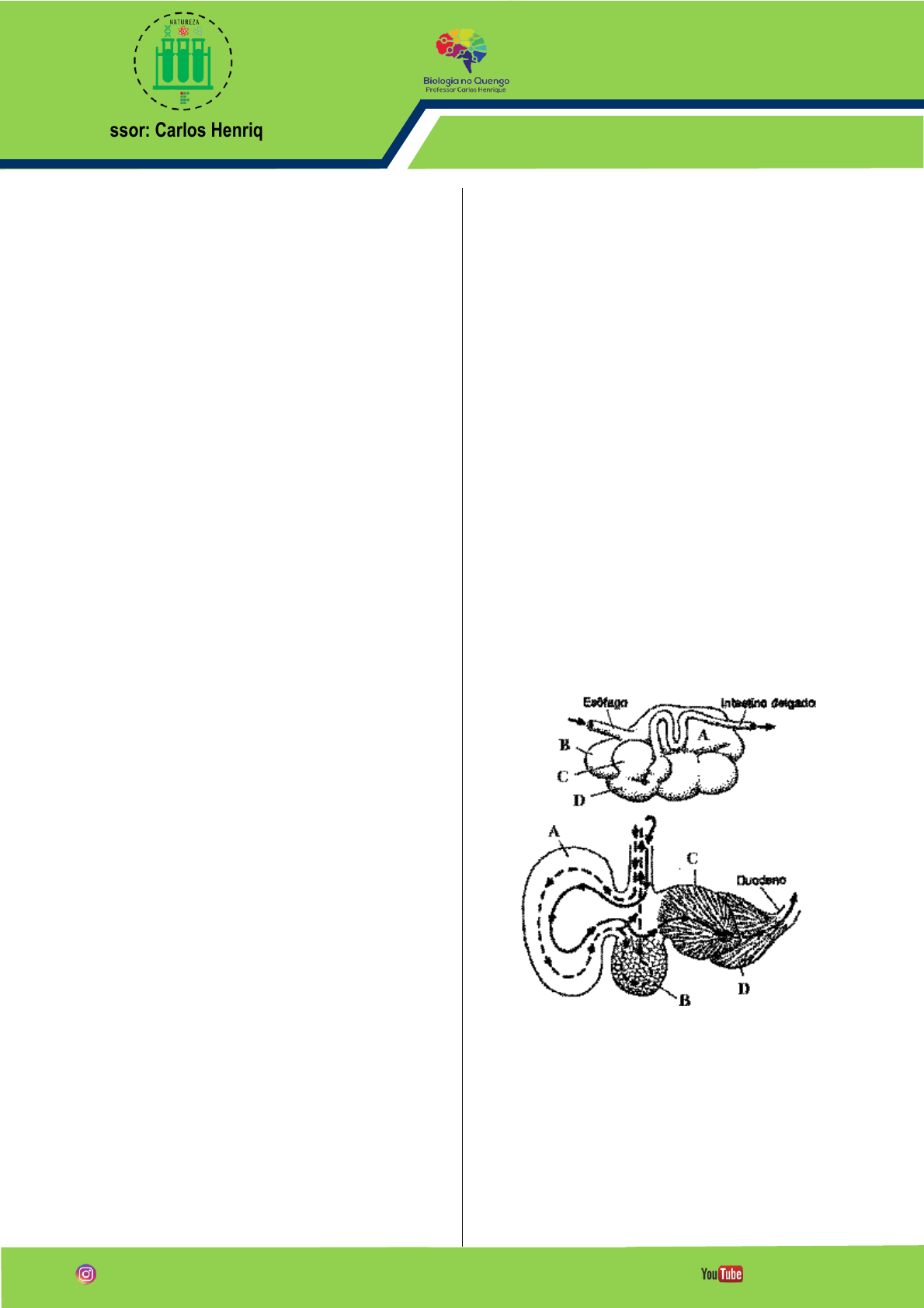 Professor: Carlos Henrique Fisiologia animal – Digestório - Ruminantes @ifrnnatureza IFRN Natureza BIOLOGIA Sistema Digestório / Ruminantes 01 - (FURG RS/2001) Os animais ruminantes apresentam o estômago dividido em quatro compartimentos. Esta especialização tem por objetivo a) proteger o trato gastrointestinal do efeito nocivo de alguns vegetais. b) obter maior eficiência na digestão das proteínas. c) aumentar a capacidade de assimilar lipídios. d) permitir a digestão da celulose. e) produzir abundante secreção para favorecer a ruminação. 02 - (UECE/2000/Janeiro) Quando comparamos o aparelho digestivo de animais ruminantes com o de carnívoros, podemos encontrar diferenças e semelhanças. Assinale a opção que evidencia corretamente tais aspectos: a) No estômago dos ruminantes, um de seus compartimentos, a pança, abriga bactérias e protozoários capazes de digerir a celulose. O estômago dos carnívoros é diferente, possui somente o compartimento envolvido na digestão química dos alimentos pelo suco gástrico. b) No intestino dos carnívoros o ceco é bastante desenvolvido, servindo para alojar microorganismos capazes de digerir a celulose. A celulose é digerida de forma semelhante no folhoso dos ruminantes. c) O coagulador é o estômago químico dos ruminantes, produzindo HC e pepsina, constituintes do suco gástrico que participam da digestão química dos alimentos. O estômago dos carnívoros é diferente por ser incapaz de produzir HC e pepsina. d) Os estômagos de ambos os animais são semelhantes. As diferenças são encontradas nos intestinos. O intestino dos carnívoros é muito maior que o dos ruminantes. 03 - (PUC RS/2003/Janeiro) Responda à questão com base nos dados a seguir. “A metade sul do Estado do Rio Grande do Sul é caracterizada pelo bioma dos Campos Sulinos, onde as principais atividades econômicas são a agricultura e a pecuária. Na pecuária, destaca-se a criação de gado bovino, o qual alimenta-se de material de origem vegetal rico em celulose. Como estes herbívoros ruminantes não produzem a celulase, enzima que hidrolisa a celulose, a digestão de seu alimento ocorre com o auxílio de microorganismos que vivem em seu sistema digestório. As figuras abaixo mostram parte do aparelho digestório destes ruminantes.” As câmaras identificadas nas figuras pelas letras A, B, C e D representam, respectivamente, a) rúmen, retículo, abomaso e omaso. b) retículo, rúmen, abomaso e omaso. c) retículo, rúmen, omaso e abomaso. Professor: Carlos Henrique Fisiologia animal – Digestório - Ruminantes @ifrnnatureza IFRN Natureza BIOLOGIA d) rúmen, retículo, omaso e abomaso. e) rúmen, omaso, abomaso e retículo. 04 - (UFMS/2002/Inverno - Biológicas) A evolução do processo digestivo por fermentação, ocorrida muitas vezes de forma independente entre os vertebrados, resultou em soluções distintas para os problemas apresentados no aproveitamento das plantas como alimento. Considerando a figura acima, que mostra o sistema digestório de um ruminante com quatro câmaras no estômago, é correto afirmar: 01. que, após a ingestão, o alimento dirige-se imediatamente para o omaso. 02. que, no rume e no retículo, o alimento é umedecido e misturado aos microorganismos. 04. que, no retículo, ocorre a digestão de proteínas, graças à atividade dos microorganismos. 08. que, periodicamente, o ruminante retorna o alimento à boca para ser mastigado mais eficientemente. 16. que os microorganismos são as principais fontes de aminoácidos e vitaminas para os ruminantes. 05 - (PUC MG/2007) A apendicite é um processo infeccioso, que provoca a inflamação do apêndice. Essa inflamação causa muita dor e pode resultar na ruptura do órgão, provocando uma infecção generalizada na cavidade abdominal. O apêndice cecal, ou apêndice vermiforme, é uma expansão do cecum de vários animais. Sobre esse assunto, é INCORRETO afirmar: a) No interior do apêndice cecal humano, podem ocorrer atividades de células de defesa. b) Em herbívoros não ruminantes, o apêndice cecal é normalmente bastante desenvolvido e está relacionado com a digestão da celulose. c) O apêndice cecal humano é um prolongamento curto da primeira porção do intestino grosso na junção com o intestino delgado. d) Em ruminantes, o apêndice se transforma no maior dos quatro estômagos e abriga uma importante flora bacteriana. 06 - (UFPEL RS/2007/Verão) Os mamíferos ruminantes pastadores executam o processo digestivo da celulose graças às condições especiais do seu trato digestório. Os ruminantes apresentam o estômago mais complexo dividido em quatro câmaras: rumen (pança), reticulum (barrete), omasum (folhoso) e abomasum (coagulador), onde obtêm substâncias de alto teor energético. Com base no texto e em seus conhecimentos, analise as seguintes afirmações. I. Microrganismos existentes no rumen e reticulum degradam o material vegetal, rompendo suas paredes celulares e liberando as proteínas e os carboidratos. II. O alimento é umedecido, agitado e misturado aos microrganismos simbiontes (bactérias e Professor: Carlos Henrique Fisiologia animal – Digestório - Ruminantes @ifrnnatureza IFRN Natureza BIOLOGIA protozoários) que vivem no rumen. Os produtos resultantes dessa simbiose são absorvidos na última câmara: o abomaso. III. A celulose, carboidrato estrutural das plantas, é composta de curtas cadeias de moléculas de glicose; é, portanto, um recurso alimentar potencialmente nutritivo. IV. Os mamíferos herbívoros possuem diversas adaptações interessantes para processar sua dieta de plantas fibrosas, mas nenhum vertebrado consegue sintetizar enzimas para quebrar a celulose. V. Os mamíferos ruminantes possuem bactérias e protozoários no rumen e no reticulum que fabricam enzimas que, transformam a celulose em glicose, importante para a vida dos associados. Estão corretas as seguintes afirmativas a) II, III e V. b) II, III e IV. c) I, IV