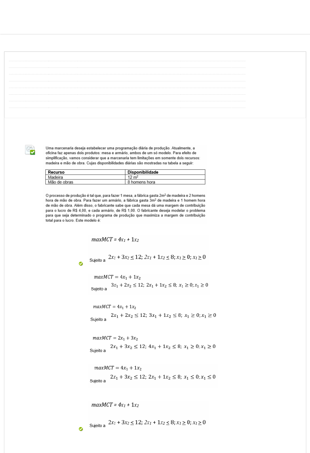 Revisar envio do teste: QUESTIONÁRIO UNIDADE IPESQUISA OPERACIONAL 5398-60_59101_R_E1_20231 CONTEÚDO Usuário thalles.rodrigues @aluno.unip.br Curso PESQUISA OPERACIONAL Teste QUESTIONÁRIO UNIDADE I Iniciado 22/05/23 13:36 Enviado 22/05/23 14:12 Status Completada Resultado da tentativa 3 em 3 pontos Tempo decorrido 36 minutos Resultados exibidos Todas as respostas, Respostas enviadas, Respostas corretas, Comentários, Perguntas respondidas incorretamente Pergunta 1 Resposta Selecionada: e. Respostas: a. b. c. d. e. Comentário da resposta: UNIP EAD BIBLIOTECAS MURAL DO ALUNO TUTORIAISCONTEÚDOS ACADÊMICOS 0,3 em 0,3 pontos http://company.blackboard.com/ https://ava.ead.unip.br/webapps/blackboard/execute/courseMain?course_id=_279512_1 https://ava.ead.unip.br/webapps/blackboard/content/listContent.jsp?course_id=_279512_1&content_id=_3319418_1&mode=reset https://ava.ead.unip.br/webapps/portal/execute/tabs/tabAction?tab_tab_group_id=_10_1 https://ava.ead.unip.br/webapps/portal/execute/tabs/tabAction?tab_tab_group_id=_27_1 https://ava.ead.unip.br/webapps/portal/execute/tabs/tabAction?tab_tab_group_id=_47_1 https://ava.ead.unip.br/webapps/portal/execute/tabs/tabAction?tab_tab_group_id=_29_1 https://ava.ead.unip.br/webapps/portal/execute/tabs/tabAction?tab_tab_group_id=_25_1 https://ava.ead.unip.br/webapps/login/?action=logout Pergunta 2 Resposta Selecionada: a. Respostas: a. b. c. d. e. Comentário da resposta: É o processo de identi�car um problema especí�co e selecionar uma linha de ação para resolvê-lo. Um problema ocorre quando o estado atual de uma situação é diferente do estado desejado. Uma oportunidade ocorre quando as circunstâncias oferecem a chance do indivíduo/organização ultrapassar seus objetivos e/ou metas. As características elencadas a seguir, referem-se a qual fator? I - Tempo disponível. II - A importância. III - O ambiente. IV - Certeza/incerteza e risco. V - Agentes envolvidos. VI - Con�ito de interesses. Fatores relevantes à tomada de decisão. Fatores relevantes à tomada de decisão. Fatores relevantes do método de tomada de decisão. Fatores componentes à tomada de decisão. Fatores característicos do modelo de tomada de decisão. Fatores determinantes do método de resolução de problemas. Resposta: A RESOLUÇÃO: Os fatores mencionados são relevantes para a tomada de decisão, mas não se relacionam com o método, além de não serem componentes, característicos ou determinantes do método de resolução. Desta forma a resposta correta é a alternativa a: Fatores relevantes a tomada de decisão Pergunta 3 0,3 em 0,3 pontos 0,3 em 0,3 pontos Resposta Selecionada: c. Respostas: a. b. c. d. e. Comentário da resposta: I e IV. I e II. I; III e V. I e IV. I e V. I; IV e V. Pergunta 4 Resposta Selecionada: 0,3 em 0,3 pontos c. Respostas: a. b. c. d. e. Comentário da resposta: Pergunta 5 Resposta Selecionada: d. Respostas: a. Uma pequena metalúrgica deseja maximizar sua receita com a venda de dois tipos de �nas �tas de aço que se diferenciam em qualidade no acabamento de corte. As �tas são produzidas a partir do corte de bobinas de grande largura. Existem duas máquinas em operação. Uma das máquinas é mais antiga e permite o corte diário de 4.000m de �ta. A outra, mais nova, corta até 6.000m. A venda das chapas no mercado varia com a qualidade de cada uma. Fitas produzidas na máquina antiga permitem um lucro de R$ 30.000 por mil metros de produção. Fitas cortadas na máquina mais moderna produzem um lucro de R$ 50.000 por mil metros de produção. Mil metros de �ta cortada na máquina antiga consome 3 homens x hora de mão de obra. Na máquina moderna, são gastos apenas 2 homens x hora. Diariamente são disponíveis 18 homens x hora para a operação de ambas as máquinas. Considerando x1 igual à quantidade de �ta vinda da máquina antiga em milhares de metros e x2 a quantidade de �ta vinda da máquina moderna também em milhares de metros, o modelo matemático que determina a produção que otimiza o lucro da metalúrgica será dado por: 0,3 em 0,3 pontos b. c. d. e. Comentário da resposta: Pergunta 6 Com base no texto apresentado a seguir, leia as a�rmações enumeradas e responda qual a correta. Sabemos que a Pesquisa Operacional (PO) é a abordagem cientí�ca na tomada de decisões. Um conjunto de métodos e modelos matemáticos aplicados à resolução de complexos problemas nas operações (atividades) de uma organização. A PO tem provocado um signi�cativo impacto na gestão e administração de empresas em diferentes organizações. Com o desenvolvimento da informática nas últimas décadas, tem sido estendida para numerosas organizações. Observe o diagrama a seguir: I. A origem da PO como ciência é atribuída à coordenação das operações administrativas após a 2ª Guerra Mundial (1939 a 1942), quando os líderes das empresas voltaram da guerra para resolver problemas como produção, armazenamento de matérias-primas e transporte e logística etc. A aplicação do método cientí�co e de ferramentas matemáticas em operações administrativas passou a ser chamado de Pesquisa Operacional. II. A origem da PO como ciência é atribuído à coordenação das operações militares durante a 2ª Guerra Mundial (1939 a 1942), quando os líderes militares solicitaram que cientistas estudassem problemas como posicionamento de radares, armazenamento de munições e transporte de tropa etc. A aplicação do método cientí�co e de ferramentas matemáticas em operações militares passou a ser chamado de Pesquisa Operacional. III. A origem da PO como ciência é atribuído à coordenação dos estudos de operações administrativas após a 2ª Guerra Mundial (1939 a 1942), quando os soldados, ao voltarem da guerra, foram trabalhar em empresas e a utilizam para resolver problemas como produção, armazenamento 0,3 em 0,3 pontos Resposta Selecionada: b. Respostas: a. b. c. d. e. Comentário da res