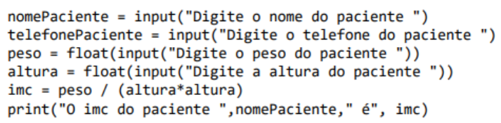 Modularização, dados de entrada e saída em Python Desafio Nem sempre o desenvolvedor que presta manutenção em um sistema é o mesmo que participou da equipe inicial de implementação do sistema. Você é o novo desenvolvedor da equipe responsável por cuidar de um sistema de saúde e surgiu um requisito para a melhoria do trecho do código que trata do cálculo de índice de massa corporal (IMC) de uma pessoa. No código original do sistema, desenvolvido em Python, uma função realiza mais de uma tarefa. Observe: Assim, é preciso melhorar esse trecho do código utilizando a modularização. Como você procederia? Padrão de resposta esperado Para melhorar o código do cálculo do IMC, a função deve ser quebrada em duas ou mais funções. Antes de tudo, você deve definir a função utilizando a palavra reservada def, seguido pelo nome da função. Em seguida, incluir os caracteres () e : e, por fim, os comados desse bloco. Veja como fica o fluxo de execução do cálculo do IMC utilizando a modularização: Exercícios 1. Diversas linguagens de programação implementam o conceito de modularização. Com isso, cada linguagem tem uma sintaxe para declaração de funções. Escolha a alternativa da sintaxe correta de declaração de função com parâmetros na linguagem Python. B. def velocidade (espaco, tempo): Funções em Python com parâmetros são definidas utilizando o comando def seguido do identificador único, parâmetros entre parênteses e dois pontos. def imprime( ): também está correto, porém não é passado o parâmetro. Em def dados(nome,idade) faltam os dois pontos. O Python irá apresentar erro de sintaxe. def __name__ == "__main__": está errado, pois se trata da definição do que será executado primeiro e inicia-se com if, e não def. if soma(): não é uma declaração de função. 2. Há dois tipos de modularização: função e procedimento. Selecione a alternativa que conceitue os dois tipos. D. Funções têm retorno e procedimentos não têm retorno. Funções e procedimentos podem receber parâmetros, porém têm características diferentes. Funções retornam o processamento de algo e procedimentos apenas executam um código à parte, não tendo retorno. Funções e procedimentos podem ser chamados a qualquer momento no código e são nomenclaturas do paradigma estruturado, que, em orientação a objetos, chamam-se métodos. 3. Ao desenvolver códigos, é necessário estar atento para minimizar os bugs em ambiente de produção. Ao estudar e conhecer alguns erros padrões, pode-se prever e evitar que eles aconteçam. Observe o código a seguir: def imprime( ): print("Olá usuário") def usuario( ) return usuario def __name__ == "__main__"( ): imprime( ) Selecione a alternativa que indica o erro que o Python irá acusar. B. Erro de sintaxe. Erro de sintaxe, pois estão faltando os dois pontos na função usuário e, na principal, no lugar de def, é if. Não há erro de semântica, pois todos os comandos digitados existem no Python. Não há conversão de valores. Não há funções com parâmetros. Não se está acessando variáveis que não existem. Portanto, não haverá erro de segmentação. 4. Além das funções criadas, há as disponíveis para uso na linguagem Python. Selecione a opção que corresponde a uma função não válida nativamente em Python. E. text( ) A função text não existe nativamente em Python. A função type retorna o tipo da variável passada por parâmetro. A função format formata um texto para ser apresentado na tela. A função input recebe um valor que o usuário digitou. A função print imprime uma variável ou um texto na tela. 5. Ao trabalhar com modularização de código, deve-se atentar ao escopo. Dessa forma, selecione a alternativa que conceitua escopo em linguagens de progamação. E. Trata-se do trecho em que a variável ou a função podem ser referenciados. Escopo está relacionadoa quem a função ou a variável está visível. O retorno e o tipo de uma função não é um escopo, mas pode assumir um escopo no código. Modificadores de variáveis ou função são unsigned, short, long, dentre outros. Tipo de variáveis ou retorno de função são int, string, float, dentre outros. Qualificadores de variáveis ou função são private, protected e public.