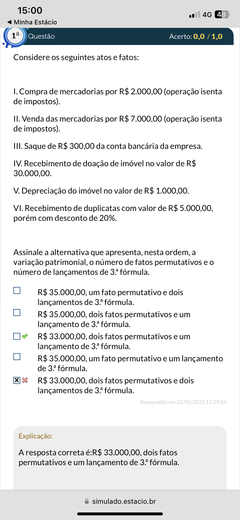 I. Compra de mercadorias por R$ 2.000,00 (operação isenta de impostos). II. Venda das mercadorias por R$ 7.000,00 (operação isenta de impostos). III. Saque de R$ 300,00 da conta bancária da empresa. IV. Recebimento de doação de imóvel no valor de R$ 30.000,00. V. Depreciação do imóvel no valor de R$ 1.000,00. VI. Recebimento de duplicatas com valor de R$ porém com desconto de 20%. a) R$ 35.000,00, um fato permutativo e dois lançamentos de fórmula. b) R$ 35.000,00, dois fatos permutativos e um lançamento de fórmula. c) R$ 33.000,00, dois fatos permutativos e um lançamento de fórmula. d) R$ 35.000,00, um fato permutativo e um lançamento de fórmula. e) R$ 33.000,00, dois fatos permutativos e dois lançamentos de fórmula.