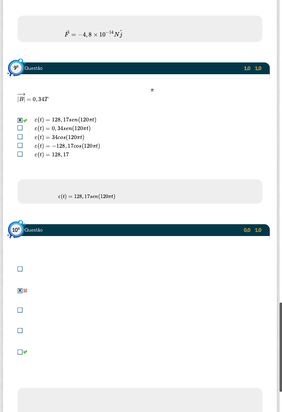 22/05/2023, 15:11 Estácio: Alunos https://simulado.estacio.br/alunos/ 1/1 Respondido em 17/05/2023 19:52:23 Explicação: Resposta correta: Acerto: 1,0 / 1,0 Um gerador alternador, formado por uma bobina com N=100 espiras retangulares de área A=100 cm2 , gira em torno de seu eixo maior, com velocidade angular ω=120 , na presença de um campo magnético uniforme . Se em t = 0, o campo está alinhado com a normal da espira, qual a função da f.e.m. fornecida pelo alternador? Respondido em 17/05/2023 19:54:17 Explicação: Resposta correta: Acerto: 0,0 / 1,0 Um cientista estava estudando a propriedade inercial eletromagnética conhecida como Lei de Lenz, quando observou que uma corrente elétrica é induzida em um circuito quando há uma variação do �uxo magnético que o atravessa. Qual das seguintes a�rmações descreve corretamente a Lei de Lenz? Uma corrente elétrica é induzida em um circuito quando há uma variação do �uxo magnético que o atravessa, e essa corrente induzida gera um campo elétrico que se soma ao campo magnético original, de forma a aumentar a intensidade do campo magnético. Uma corrente elétrica é induzida em um circuito quando há uma variação do �uxo magnético que o atravessa, e essa corrente induzida gera um campo elétrico que se opõe à variação do campo magnético original, de forma a diminuir a intensidade do campo magnético. Uma corrente elétrica é induzida em um circuito quando há uma variação do �uxo magnético que o atravessa, e essa corrente induzida gera um campo elétrico que se opõe à variação do campo magnético original, de forma a manter a direção do �uxo de campo magnético constante. Uma corrente elétrica é induzida em um circuito quando há uma variação do �uxo magnético que o atravessa, e essa corrente induzida gera um campo magnético que se soma ao campo magnético original, de forma a aumentar a intensidade do campo magnético. Uma corrente elétrica é induzida em um circuito quando há uma variação do �uxo magnético que o atravessa, e essa corrente induzida gera um campo magnético que se opõe à variação do campo magnético original, de forma a manter a direção do �uxo de campo magnético constante. Respondido em 17/05/2023 19:55:58 Explicação: A Lei de Lenz a�rma que uma corrente elétrica é induzida em um circuito quando há uma variação do �uxo magnético que o atravessa Essa corrente induzida gera um campo magnético que se opõe à variação do campo →F = −4, 8 × 10−14N ĵ π −→ |B| = 0, 34T ε(t) = 128, 17sen(120πt) ε(t) = 0, 34sen(120πt) ε(t) = 34cos(120πt) ε(t) = −128, 17cos(120πt) ε(t) = 128, 17 ε(t) = 128, 17sen(120πt) Questão9 a Questão10 a