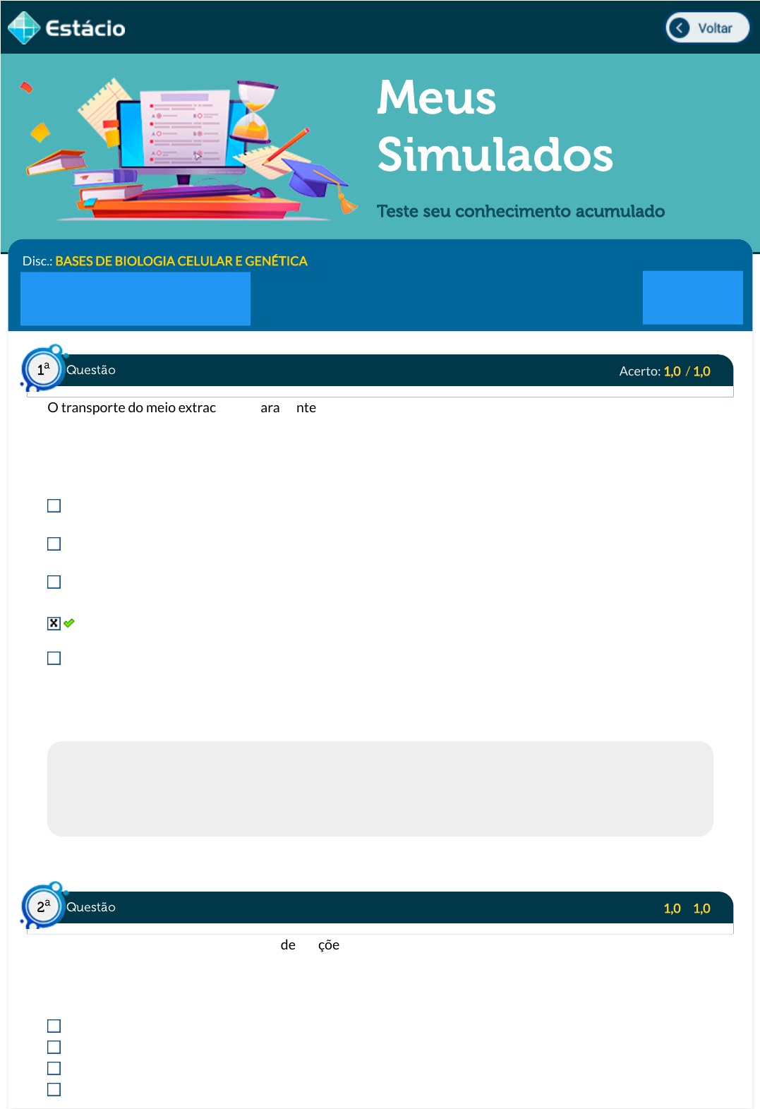 Meus Simulados Teste seu conhecimento acumulado Disc.: BASES DE BIOLOGIA CELULAR E GENÉTICA Aluno(a): JOSE IVO OLIVEIRA DA SILVA 202302194117 Acertos: 9,0 de 10,0 22/05/2023 Acerto: 1,0 / 1,0 O transporte do meio extracelular para o interior da célula pode ser de dois tipos: transporte passivo ou transporte ativo. No transporte ativo existem proteínas carreadoras que irão fazer o transporte com gasto de energia: a quebra de uma molécula de ATP em ADP + Pi. Sobre as proteínas carreadoras e sua classi�cação em grupos, marque a alternativa correta. No grupo das proteínas do tipo Uniporte ocorre o transporte de duas moléculas de cada vez, mas em sentidos opostos. No grupo das proteínas do tipo Antiporte ocorre o transporte de duas moléculas de cada vez no mesmo sentido. No grupo das proteínas do tipo Simporte ocorre o transporte de apenas um tipo de molécula de cada vez. No grupo das proteínas do tipo Antiporte ocorre o transporte de duas moléculas de cada vez, mas em sentidos opostos. No grupo das proteínas do tipo Uniporte ocorre o transporte de duas moléculas de cada vez, mas no mesmo sentido. Respondido em 22/05/2023 16:01:03 Explicação: No grupo das proteínas do tipo Antiporte ocorre o transporte de duas moléculas de cada vez, mas em sentido opostos. No grupo das proteínas do tipo Uniporte ocorre o transporte de apenas um tipo de molécula de cada vez. No grupo das proteínas do tipo Simporte ocorre o transporte de duas moléculas de cada vez, mas no mesmo sentido. Acerto: 1,0 / 1,0 A membrana plasmática tem uma série de funções especí�cas. Associadas a estas funções estão algumas especializações na estrutura da membrana plasmática. Marque a alternativa que apresenta especializações da membrana plasmática. Citoesqueleto, zonas de adesão, zonas oclusivas. Fosfolipídios, cílios, �agelos. Proteína globular, microvilosidades, cílios. Ribossomo, �agelos, microvilosidades. Questão1 a Questão2 a https://simulado.estacio.br/alunos/inicio.asp javascript:voltar(); Interdigitações, desmossomos, junções comunicantes. Respondido em 22/05/2023 15:55:46 Explicação: São especializações na estrutura da membrana plasmática: cílios, �agelos, microvilosidades, interdigitações, desmossomos, junções comunicantes, zonas de adesão e zonas oclusivas. Proteína globular e fosfolipídios fazem parte da composição da membrana, mas não são especializações da membrana. Ribossomo e citoesqueleto são estruturas celulares, mas não são especializações da membrana. Acerto: 1,0 / 1,0 O citoesqueleto é uma rede de �lamentos que dá sustentação para a membrana plasmática, dando à célula sua forma geral, contribui para o posicionamento das organelas, de�ne os caminhos de transporte de vesículas e proporciona o movimento em muitos tipos de células. Os �lamentos que compõem o citoesqueleto têm capacidade de polimerização e despolimerização, condição importante para alguns processos celulares. Com base nesse texto, considere as asserções abaixo e assinale a alternativa correta. O citoesqueleto é formado por três grupos principais de �lamentos com características e funções especí�cas que são essenciais para o funcionamento e para as atividades celulares. PORQUE Além de atuarem separadamente, também realizam funções em conjunto. Um exemplo disso é o que ocorre na divisão celular, onde os microtúbulos formam o fuso mitótico e segregam os cromossomos, enquanto os �lamentos de actina produzem um anel contrátil no centro celular para dividir a célula-mãe em duas células- �lhas. A asserção I é falsa e a II é verdadeira. As asserções I e II são falsas. As asserções I e II são verdadeiras e a II é uma justi�cativa para a I. A asserção I é verdadeira e a II é falsa. As asserções I e II são verdadeiras e a II não é uma justi�cativa para a I. Respondido em 22/05/2023 15:56:17 Explicação: As duas asserções são verdadeiras e a II justi�ca a I, pois o funcionamento dos três �lamentos são indispensáveis para o funcionamento normal de uma célula. Uma divisão celular, por exemplo, não é realizada se não houver o trabalho ao mesmo tempo dos diferentes �lamentos. Se o microtúbulo estiver funcional e os �lamentos de actina não, a divisão não é completada. Acerto: 1,0 / 1,0 (PUC-SP) [...] De outro lado, o galardão de química �cou com os inventores de ferramentas para estudar proteínas, os verdadeiros atores do drama molecular da vida. É verdade que a Fundação Nobel ainda fala no DNA como o diretor da cena a comandar a ação das proteínas, mas talvez não seja pretensioso supor que foi um lapso, e que o sinal emitido por essas premiações aponta o verdadeiro futuro das pesquisas biológicas e médicas muito além do genoma e de seu sequenciamento (uma simples soletração). (...) Questão3 a Questão4 a * LEITE, Marcelo. De volta ao sequenciamento. Folha de S. Paulo- 20 out. 2002. O autor refere-se às proteínas como "atores do drama molecular" e ao DNA como "diretor de cena". Essa referência deve-se ao fato de: O material genético ser constituído por proteínas. Não ocorrer uma correlação funcional entre DNA e proteínas no meio celular. As proteínas não terem controle sobre o metabolismo celular. O DNA controlar a produção de proteínas e estas controlarem a atividade celular. O DNA controlar a produção de proteínas e também atuar como catalisador de reações químicas celulares. Respondido em 22/05/2023 15:56:45 Explicação: O DNA possui sequências de nucleotídeos que serão usadas para a síntese de proteínas, que atuam em todas as atividades do nosso organismo. Acerto: 1,0 / 1,0 Carolina é portadora de daltonismo pertencendo ao grupo sanguíneo B, já seu irmão �lho dos mesmo país pertence ao grupo sanguíneo O e possui a visão normal. Carolina se casou- se com um homem de visão normal que pertence ao grupo sanguíneo AB. Qual a 