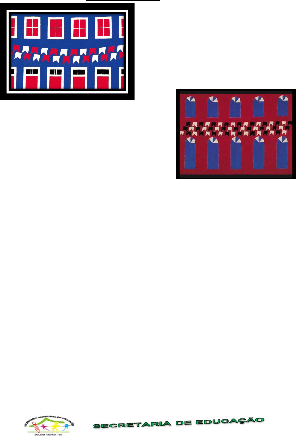 1 FESTAS JUNINAS Alfredo Volpi (1896 – 1988) Artista brasileiro, características de suas obras são as bandeirinhas e os casarios Trabalhou também como pintor decorador em residências da sociedade paulista da época, executando trabalho de decoração artística em paredes e murais. Ele gostava de usar cores vibrantes como: vermelho, azul, branco e preto Vamos analisar a obra de Volpi: O que nos faz lembrar as obras de Alfredo Volpi? ___________________________________________________________________ ___________________________________________________________________ ___________________________________________________________________ Você já participou de alguma festa junina? Onde foi realizada? ___________________________________________________________________ ___________________________________________________________________ __________________________________________________________________ O que mais você gosta que acontece em festas juninas? ___________________________________________________________________ ___________________________________________________________________ __________________________________________________________________ Infelizmente por motivo da pandemia não poderemos realizar festa junina na escola, mas vamos fazer de conta? Além do que sempre tinha nas festas da escola o que mais você gostaria que tivesse? ___________________________________________________________________ ___________________________________________________________________ __________________________________________________________________ 2 Vamos fazer arte de bandeirinhas com dobradura? Siga o passo a passo e produza algumas bandeirinhas com o papel colorido que foi enviado junto com o material. Depois no espaço reservado crie um desenho inspirado nas obras de Volpi. 3 Volpi tinha como temática desenhar casarios (casas antigas) e bandeirinhas. Agora vamos transformar a sua casa numa obra de Volpi. Produza um desenho de sua casa decorando a fachada com bandeirinhas e cores vibrantes. 4 Será maravilhoso quando pudermos nos encontrar novamente, mas enquanto isso vamos brincar de faz de conta novamente? Leia atentamente a poesia e imagine que você está participando dessa festa que a poesia descreve, represente ao lado como você imagina que tudo aconteceu. Alegrias de São João TODO MUNDO SE AGITA CHEGOU O MÊS DE SÃO JOÃO VAI TER MUITA BRINCADEIRA E QUADRINHA DE MONTÃO TEM FOGUEIRA A NOITE TODA MUITA CHAMA E ALEGRIA OS CASAIS SE DIVERTEM E FAZEM ATÉ SIMPATIA NESSA NOITE TEM DE TUDO TEM QUENTÃO, MILHO E PAMONHA PAÇOCA E PÉ DE MOLEQUE NA BARRACA DA ANTÔNIA O CÉU TODO COLORIDO FAZ A BELEZA ESPALHAR BALÕES, FOGOS E BANDEIROLAS QUE SERVEM PARA ENFEITAR NA MELHOR FESTA DO ANO BATE FORTE O CORAÇÃO A DIVERSÃO É GARANTIDA POIS É NOITE DE SÃO JOÃO! 5