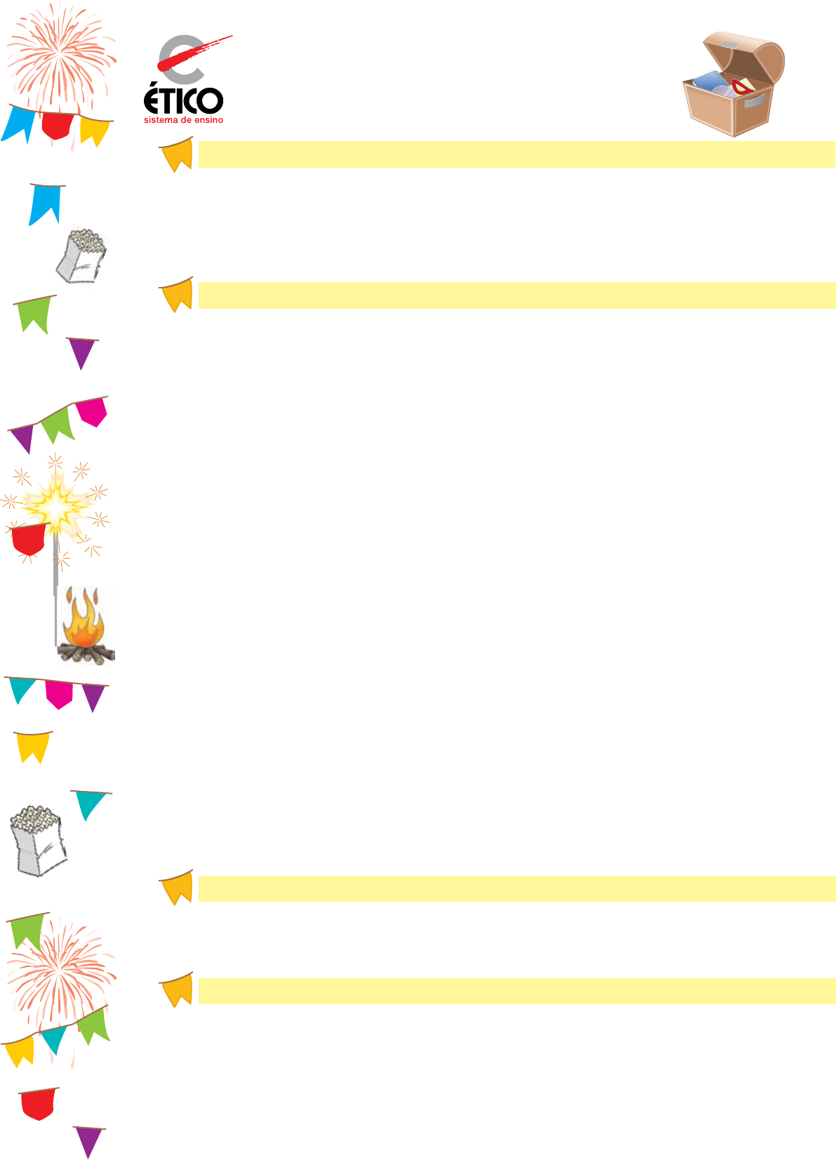 1 Educação Infantil Projeto Festa Junina www.sejaetico.com.br 0800 770 1996 Justificativa O mês de junho é marcado por muitas festividades que evidenciam a pluralidade cultural existente em nosso país. Este projeto tem por objetivo levar o aluno a conhecer essa manifestação cultural, utilizando, para isso, as diversas linguagens artísticas e textuais, pro- movendo a socialização, o senso cooperativo e o respeito às diversidades. conteúdos ConCeituais • Conhecer a história das festividades juninas. • Estabelecer situações que permitam aos educandos a apreensão de conceitos de maneira significativa. • Desenvolver habilidades e competências do educando nas suas relações com símbolos, expressões, ideias, imagens, representações e nexos, com os quais ele aprende e ressignifica o real. • Investigar os saberes prévios do educando sobre as festividades juninas, promo- vendo comparações e reflexões desses conhecimentos com conteúdos específicos de cada área do conhecimento. ProCedimentais • Coletar informações sobre a história das festividades juninas e suas adaptações nas regiões brasileiras. • Aplicar em contextos diferenciados das áreas do conhecimento as informações so- bre as festividades juninas. atitudinais • Promover a socialização. • Desenvolver o senso cooperativo. • Praticar ações cooperativas, respeitando as diversas opiniões. • Apreciar as festividades juninas como festa folclórica brasileira. • Respeitar as diversas manifestações artísticas produzidas nas festividades juninas. • Perceber a pluralidade cultural existente nas festividades juninas. Público-alvo Educação Infantil – nível III temPo estimado Uma semana letiva. www.sejaetico.com.br 0800 770 19962 material necessário • Caixa de papelão encapada com papel preto • Papel crepom em cores variadas • Cola • Tesoura • Barbante • Palitos para churrasco • Retalhos de pano • Revistas velhas • Tinta guache em cores variadas • Pincéis • Lápis de cor • Giz de cor desenvolvimento introdução As festas juninas foram trazidas para o Brasil pelos portugueses, mas essa festividade teve influência de vários povos. Com o passar do tempo, agrupou-se a essa festividade influên- cias culturais do povo brasileiro, o que caracteriza suas danças, cantigas e a culinária nas dife- rentes regiões do país. Nas festas juninas, a comunidade compartilha pratos típicos à base de milho, amen- doim e mandioca, e as pessoas se divertem muito em várias brincadeiras e danças. avaliação A avaliação será realizada por meio da observação docente e levará em consideração a participação, o interesse e a ampliação do conhecimento dos alunos durante todo o proces- so de desenvolvimento do projeto. orientação ao Professor(a) • Página 3 – O teatro na escola proporciona ao aluno a socialização, estimula a criativi- dade e desenvolve a coordenação e o vocabulário; portanto, essa atividade propõe a construção de um “cenário junino”. Escolha uma caixa de papelão do tamanho suficiente para a apresentação, encape-a com papel preto e decore o fundo com motivos juninos. Veja algumas sugestões para o cenário: Fogueira e céu: oriente os alunos para decorarem a fogueira com bolinhas de papel crepom, como também os elementos que compõem o céu. Bandeirinhas: oriente os alunos a pintarem as bandeirinhas com tinta guache em cores variadas, em seguida, cole-as em um barbante. Organize a cena e cole os elementos no fundo da caixa de papelão, compondo o cenário. • Página 6 – Incentive seus alunos a escolherem ou criarem as personagens. Apro- veite o momento para explorar as manifestações juninas da sua região. Produza, em grupos ou coletivamente, textos teatrais. Utilize materiais como retalho de pano ou de papel, palhas, sementes para decorar as personagens; promova as apresentações das produções e valorize as criações. • Página 9 – Estimule a utilização de diferentes materiais. Aproveite o momento para explorar as manifestações juninas da sua região. • Páginas 12 e 13 – Nas atividades a seguir explore a riqueza culinária existente em sua região durante as festividades juninas. www.sejaetico.com.br 0800 770 19963 Preparando o arraial Vamos montar um belo cenário para nossa festa junina? Nome: Nível: Data: Educação Infantil ATIVIDADES FESTA JUNINA www.sejaetico.com.br 0800 770 19964 www.sejaetico.com.br 0800 770 19965 www.sejaetico.com.br 0800 770 19966 Cenário pronto?! Agora vamos animar o arraial! Escolha as personagens e enfeite-as da maneira que quiser! Se preferir, você também pode inventar a sua própria personagem. Recorte as figuras, cole um palito atrás e comece o espetáculo! www.sejaetico.com.br 0800 770 19967 Vamos cantar! Chegou a hora da fogueira Chegou a hora da fogueira! […] o Céu fiCa todo iluminado fiCa o Céu todo estrelado Pintadinho de balão… […] também fiCa uma fogueira dentro do meu Coração… Lamartine Babo. http://letras.terra.com.br/lamartine-babo/374938/ Agora, pinte, recorte e cole as bandeirinhas no cordão. Em seguida desenhe as personagens da sua festa junina. Quantas bandeirinhas você colou? Indique a quantidade nesse . www.sejaetico.com.br 0800 770 19968 Ligue as bandeirinhas às imagens com a mesma estampa. www.sejaetico.com.br 0800 770 19969 Termine a fogueira, pinte as bandeirinhas e enfeite as personagens. www.sejaetico.com.br 0800 770 199610 reCeita de PaçoCa doCe IngredIentes • 1 QUILO DE AmENDOIm, SEm PELE, TORRADO E mOíDO BEm fINO • 500 GRAmAS DE fARINhA NUTRITIVA à BASE DE CEREAIS E LEITE (TIPO LáCTEA) • 150 GRAmAS DE AçúCAR REfINADO Modo de preparo 1. COLOQUE TODOS OS INGREDIENTES Em Um PILãO 2. AmASSE ATé mISTURá-LOS mUITO BEm. 3. fAçA SAQUINhOS COm PAPéIS COLORIDOS, Em fORmA DE CONE. 4. COLOQUE A PAçOCA E SIRVA. www.sejaetico.com.br 0800 770 199611 www.sejaetico.com.br 0800 770 199612 Observe as palavras. Pinte, na t