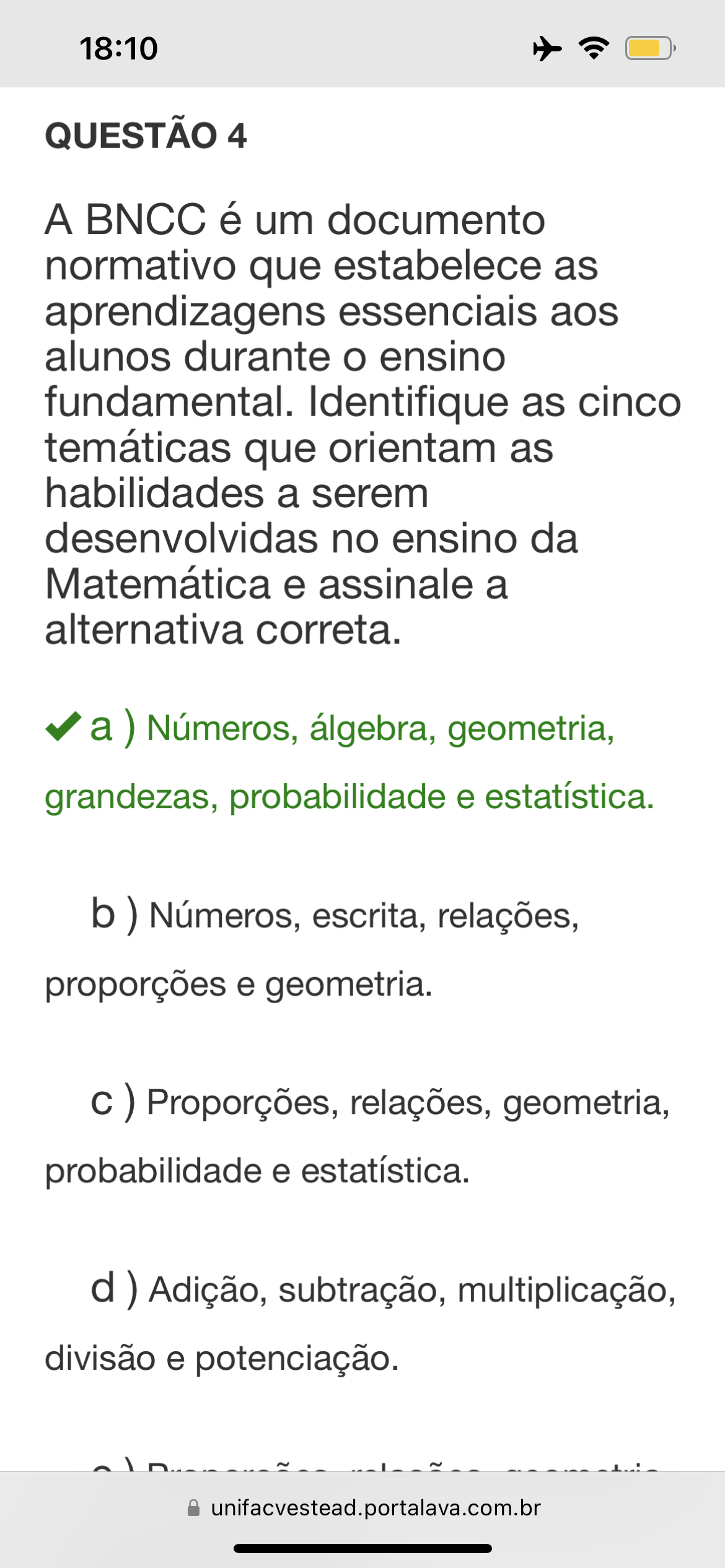 a) Numbers, algebra, geometry, magnitudes, probability and statistics. b) Numbers, writing, relationships, proportions and geometry. c) Proportions, relationships, geometry, probability and statistics. d) Addition, subtraction, multiplication, division and exponentiation.