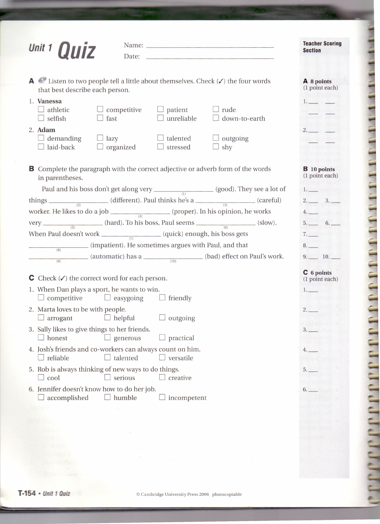 Uni! 1 ãuiz Name: _ Date: A Listen to two people tell a little about themselves. Check (.,I) the four words that best describe each person. 1. Vanessa O athletic O competitive O patient O rude O selfish O fast O unreliable O down -to-earth 2. Adam O demanding O lazy O talented O outgoing O laid-back O organized O stressed O shy B Complete the paragraph with the correct adjective or adverb form of the words in parentheses. Paul and his boss don't get along very .....,..,.,. (gocd). They see a lot of (I) things (different). Paul thinks he's a (careful) 00 ~ worker. He likes to do a job (proper). In his opinion, he works (4) very -;;;-- (hard). To his boss, Paul seems ----,-,,.--- (slow). ~ ~ When Paul doesn't work (quick) enough, his boss gets (7) ______ --;::,.--- (impatient). He sometimes argues with Paul, and that (8) ______ --;::.,--- (automatic) has a (bad) effect on Paul's work. (9) (10) C Check (.,I) the correct word for each person. 1. When Dan plays a sport, he wants to win. O competitive O easygoing O friendly 2. Marta loves to be with people. O arrogant O helpful O outgoing 3. Sally likes to give things to her friends. O honest O generous O practical 4. Iosh's friends and co-workers can always count on him. O reliable O talented O versatile 5. Rob is always thinking of new ways to do things. O cool O serious O creative 6. Iennifer doesn't know how to do her job. O accomplished O humble O incompetent T-154 • 11 - 1a . © Cambridge University Press 2006 photocopiable Teacher Scoring Section A 8 points (1 point each) 1. 2. B 10 points (1 point each) 1. 2. 3. 4. 5. 6. 7. 8. 9. 10. C 6 points (1 point each) 1. 2. 3._ 4. 5._ 6._ o Rewrite these negative sentences. Add a prefix to the adjectives to give the opposite meaning and use the words in parentheses. Example: My co-worker isn't honest. l-\y Co-woy~ey lS t-ot-",lly .J.ls~O\\est- . (totally) 1. My roommate isn't organized. . (extremely) 2. Young people aren't considerate. . (pretty) 3. Our neighbors aren't friendly. . (really) 4. My sister isn't a reliable person. . (incredibly) E Add a comment to describe the things these people do a lot. Choose a phrase from the box and use always and a continuous verbo do things for other people talk about himself o 8 points (2 points each) 1. 2. 3._ 4. E 8 points (2 points each) 1._ 2. 3._ 4. F 10 points (2 points each l. True False It doesn't say. 2. basketball from his mother. O O O 3._ 2. _ ame fiam a reporter. O O O 4. 3. e erou with his time and money. O O O 5._ 4. After : Iagic le the Lakers, he never played basketbali again. O O O Total: 5. agic never ign autograph . O O O outof50 spend toa much money complain about things ,/ say funny things Example: Ieff has a great sense of humor. \-leIs ",lw",ys s"'yl\\B -Pl\\\\\y t-~l\\BS 1. A guy at work is very arrogant. _ 2. Angela loves shopping. 3. Brian isn't very pleasant. 4. My mother's not selfish at ali. F Read the biography of a famous basketball player. Then read the statements and check (,/) true, false, or it doesn't say. Earvin ••Magic" Johnson was bom and raised in Michigan. He comes from a family of ten children. He loved basketball at an early age. In fact, his mother says he slept with the first basketball he received as a present. When he was in high school, a reporter saw [ohnson play basketball. The reporter called him "Magic" because he was so good, and the nickname stayed with [ohnson. Magic played basketball in college and then joined the Los Angeles Lakers - a professsional basketball team. By age 21, he was already becoming famous. In 1991, Magic left the Lakers when he learned he had HIV / AIDS. His honest tatement about his health surprised everyone. After he left the Lakers, he became .el")0 uccessful in business, and he started the Magic [ohnson Foundation. This zanization spends millions of dollars to help children and young people. _ a ic is a great athlete, but more important, he is an extremely proud G!!.:wamd and father. In fact, although he loves to sign autographs for his fans, he them when he is in public with his children - their time together is toa ohim. L _€) Cambridge University Press 2006 photocopiable Unit 1Quiz • T-155