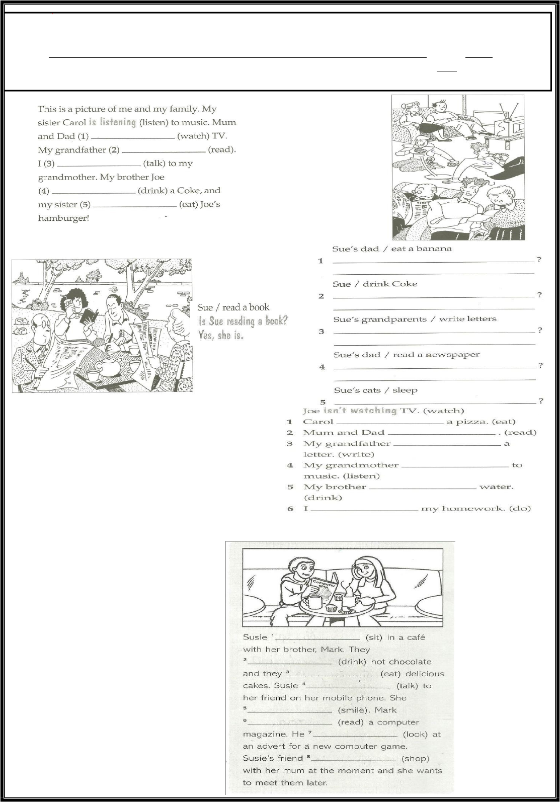 CEPI HELOÍSA DE FÁTIMA VARGAS Student: 1º Ano: Teacher: Thais da Silva Vilimaitis 1º Bimestre (1ª folha) Data: /03/2023. 1- Observe a gravura e complete o texto usando o “present continuous”. 2- Observe a gravura e faça perguntas usando o present continuous”. Responda-as usando “short answers”. 3- Complete as frases com o “present continuous”. Observe a gravura do exercício 1. 4- Complete o texto usando PRESENT CONTINUOUS. 5- Leia o texto do exercício 4 novamente. Corrija as frases. Observe o modelo. a- Susie is talking to her mum. No, she isn’t. She is talking to her friend. b- Mark is reading a book. c- Mark is looking an advert for a new bike. d- Susie’s friend is shopping with her dad. e- Susie and Mark are sitting in a restaurant. 6- Responda em inglês de maneira completa. a- What are they doing? b- What is she doing? c- What is he doing? 7- Escreva as frases a seguir na forma solicitada. a- You are riding a bike. (interrogative) b- Is Mary living in São Paulo? (affirmative) c- She is sleeping. (negative) 8- Quando aprendemos sobre o « present continuous », relembramos os pronomes pessoais do caso « subject ». Qual alternativa completa corretamente as frases a seguir ? A- « My name’s Eddie and am from Chicago. » B- Patty is from Ireland. is from Cork. C- Are Canadian ? No, I’m not. D- Antonio Banderas and Penelope Cruz are famous. are from Spain. E- David Beckham is a football player. is from England. 9- Observe a gravura, leia as frases, relacione os personagens e pinte-os como foram descritos. a- She has got brown hair. She has got a pink T-shirt, a light blue skirt and purple tennis. b- He has got a brown sweater, a grey hat, blue jeans and red shoes. His hair is dark. c- She is wearing an orange skirt, a yellow blouse and black shoes. Her hair is medium and red. d- She’s got blonde hair. She has got a grey dress and white shoes. e- He’s got short fair hair. He’s wearing a black jacket, a red T-shirt, green pants and blue shoes. f- His hair is black. He has got a dark green T-shirt, orange shorts and gray tennis. 10- Complete as frases usando os verbos da caixa no PRESENT CONTINUOUS. 11- Observe o modelo e faça perguntas e respostas de acordo cos as frases do exercício 10. 12- Escreva frases usando PRESENT CONTINUOUS. Observe as figuras. A- B- C- D- 13- Relacione. A- freezing B- sunny C- windy D- snowy ( ) ( ) ( ) ( ) Have a nice week. VW