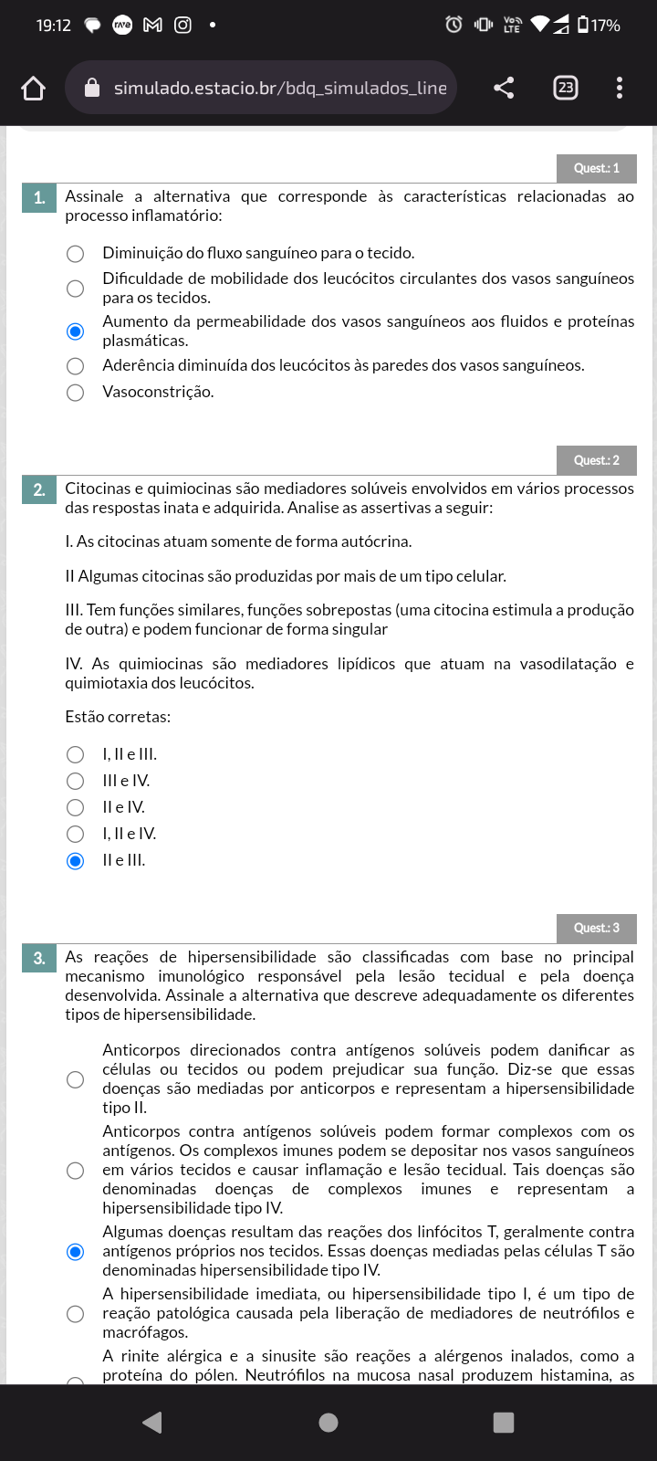 Assinale a alternativa que corresponde às características relacionadas ao processo inflamatório: Diminuição do fluxo sanguíneo para tecido. Dificuldade de mobilidade dos leucócitos circulantes dos vasos sanguíneos para os tecidos. Aumento da permeabilidade dos vasos sanguíneos aos fluidos e proteínas plasmáticas. Aderência diminuída dos leucócitos às paredes dos vasos sanguíneos. Vasoconstrição.