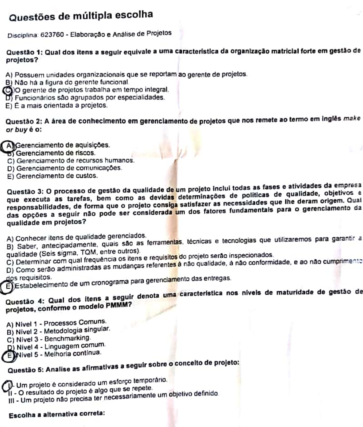 Scanned by CamScanner Scanned by CamScanner Scanned by CamScanner Scanned by CamScanner Scanned by CamScanner Scanned by CamScanner Scanned by CamScanner Scanned by CamScanner UNIP INTERATIVA Código da Prova: 17698635208 Curso: Administração f Série ou Período: 2° Bimestre - 5° Semestre Tipo: Bimestral Aluno: 1 - Questões objetivas - valendo 5,00 pontos li - Questões discursivas - valendo 5,00 pontos Gerada em: 14/06/2017 14:10:11 Questões de múltipla escolha Disciplina: 623760 - Elaboração e Análise de Projetos projeto? Questão 1: Qual dos grupos de processos a seguir do PMBOK é responsável pela definição de um novo IÂ}i)1niciação. '8)' Planejamento. C) Execução. D) Monitoramento. E) Encerramento. Questão 2: Qual é a estrutura organizacional que tem uma configuração hierárquica, possuindo relação de subordinação, em ·que um funcionário responde a outro acima dele, que responde a outro e assim por diante, até que se chegue à última instância? A) Estrutura Matricial Fraca. B) Estrutura Projetizada. Estrutura Matricial Forte. Estrutura Funcional.' Estrutura Matricial Balanceada. Questão 3: O processo de gestão da qualidade de um projeto inclui todas as fases e atividades da empresa que executa as tarefas, bem como as devidas determinações de políticas de quaiidade, objetivos e responsabilidades, de forma que o projeto consiga satisfazer as necessidades que lhe deram origem. Qual das opções a seguir não pode ser considerada um dos fatores fundamentais para o gerenciamento da qualidade em projetos? · . (_/ A) Conhecer itens de qualidade gerenciados. B) Saber, antecipadamente, quais são as ferramentas, técnicas e tecnologias que utilizaremos para garantir a qualidade (Seis sigma, TOM, entre outros). C) Determinar com qual frequência os itens e requisitos do projeto serão inspecionados. D) Como serão administradas as mudanças referentes à não qualidade, à não conformidade, e ao não cumprimento �s requisitos. '� Estabelecimento de um cronograma para gerenciamento das entregas. Questão 4: A área de conhecimento em gerenciamento de projetos que nos remete ao termo em inglês make orbuyé o: / ©Gerenciamento de aquisições. C/ B) Gerenciamento de riscos. C) Gerenciamento de recursos humanos. D) Gerenciamento de comunicações. E) Gerenciamento de custos. Questão 5: O gerenciamento das comunicações do projeto inclui todos os processos e procedimentos essenciais que sejam capazes de assegurar que as informações do projeto sejam geradas, coletadas, distribuídas, armazenadas, recuperadas e organizadas de maneira correta e apropriada. Qual é o processo. que mostra as necessidades de informação e as partes que têm interesse nessas informações?