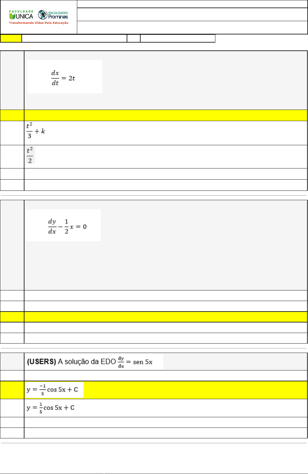 06/02/2023 09:10:31 1/3 REVISÃO DE SIMULADO Nome: FRANCISCO ALMEIDA DA SILVA Disciplina: Cálculo III Respostas corretas são marcadas em amarelo X Respostas marcardas por você. Questão 001 Analise a expressão abaixo: A solução para a equação do primeiro grau dada é X A) t2+k B) C) D) t2-3k E) t2 Questão 002 Analise a expressão abaixo: De acordo com a expressão dada, avalie as afirmativas abaixo: I. A equação dada é diferencial de primeira ordem. II. A solução geral para a equação dada é igual a y(x)=1/4 x2+k. III. A solução geral da expressão dada não pode ser obtida. É correto o que se afirma em X A) II, apenas. B) III, apenas. C) I e II, apenas. D) I e III, apenas. E) I, apenas. Questão 003 A) y=cosâ�¡ x+C B) C) X D) y=cos â�¡5x+C E) y=cosâ�¡ 3x+C 06/02/2023 09:10:31 2/3 Questão 004 Analise a expressão abaixo: A solução geral para a equação é A) x2+4x B) x2+4 X C) x2-4 D) 4x+k E) 4x+1 Questão 005 A solução da equação y'=3x+y é: A) y=Cex - 3x B) y=C C) y= Cex- 3x - 3 D) y=Cx X E) y=Cex - 4x - 8 Questão 006 (UFPR-Adaptada) A opção que representa a solução da equação y'=e x-2y, diferencial de variáveis separáveis é: A) X B) C) D) E) Questão 007 Analise a expressão a seguir: É solução de qual das equações diferenciais abaixo? A) B) C) X D) E) 06/02/2023 09:10:31 3/3 Questão 008 A) y2 = Cx B) y = 2x + C X C) y2= 2x2 + C D) y = x + C E) y2= 3x2 + C