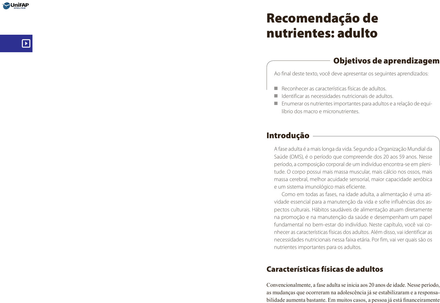 Recomendação de nutrientes: adulto Apresentação A fase adulta caracteriza-se por ser a mais longa, quando comparada com outros ciclos da vida. Segundo a Organização Mundial de Saúde (OMS), é o período que compreendo dos 20 aos 59 anos. Nessa etapa, o estilo de vida moderno, caracterizado por uma vida com pouco tempo disponível para a escolha, aquisição e preparo dos alimentos, associado ao sedentarismo, à prática do tabagismo, ao etilismo e ao estresse, pode levar os adultos a desenvolverem doenças associadas a uma dieta desequilibrada. Dessa forma, há a necessidade de consumir uma alimentação equilibrada em quantidade e qualidade, de forma a garantir a ingestão adequada de todos os nutrientes, tanto para a manutenção do organismo quanto para evitar doenças crônicas. Nesta Unidade de Aprendizagem, você conhecerá as características físicas dos adultos. Além disso, identificará as necessidades nutricionais nessa faixa etária. Por fim, verá quais são os nutrientes importantes para os adultos. Bons estudos. Ao final desta Unidade de Aprendizagem, você deve apresentar os seguintes aprendizados: Reconhecer as características físicas dos adultos.• Identificar as necessidades nutricionais para adultos.• Enumerar os nutrientes importantes para adultos e a relação de equilíbrio dos macro e micronutrientes. • Recomendação de nutrientes: adulto Objetivos de aprendizagem Ao final deste texto, você deve apresentar os seguintes aprendizados: � Reconhecer as características físicas de adultos. � Identificar as necessidades nutricionais de adultos. � Enumerar os nutrientes importantes para adultos e a relação de equi- líbrio dos macro e micronutrientes. Introdução A fase adulta é a mais longa da vida. Segundo a Organização Mundial da Saúde (OMS), é o período que compreende dos 20 aos 59 anos. Nesse período, a composição corporal de um indivíduo encontra-se em pleni- tude. O corpo possui mais massa muscular, mais cálcio nos ossos, mais massa cerebral, melhor acuidade sensorial, maior capacidade aeróbica e um sistema imunológico mais eficiente. Como em todas as fases, na idade adulta, a alimentação é uma ati- vidade essencial para a manutenção da vida e sofre influências dos as- pectos culturais. Hábitos saudáveis de alimentação atuam diretamente na promoção e na manutenção da saúde e desempenham um papel fundamental no bem-estar do indivíduo. Neste capítulo, você vai co- nhecer as características físicas dos adultos. Além disso, vai identificar as necessidades nutricionais nessa faixa etária. Por fim, vai ver quais são os nutrientes importantes para os adultos. Características físicas de adultos Convencionalmente, a fase adulta se inicia aos 20 anos de idade. Nesse período, as mudanças que ocorreram na adolescência já se estabilizaram e a responsa- bilidade aumenta bastante. Em muitos casos, a pessoa já está financeiramente independente dos pais e já ingressou no mercado de trabalho. Na fase adulta, as pessoas tendem a traçar suas metas e objetivos, se casam, têm filhos e planejam o futuro a partir das experiências vividas e das suas expectativas. A vida adulta constitui-se na fase mais ativa do ser humano em sociedade, em que ele integra a população economicamente ativa. Esse período é dividido em três fases: adultez jovem, adultez média e adultez madura. A adultez jovem é marcada pela entrada no mundo adulto, caracterizada pela vitalidade, pela valoração pessoal, pela busca de objetivos, pela definição de estudos e pela carreira. Apesar de ser uma fase de mudanças, pouca estabilidade social e financeira, constitui-se em um período de desafios e recompensas. A adultez média é a fase de maior estabilidade social e profissional. O adulto médio se sente possuído pelo afã de produção e por interesses objetivos, deseja ser eficaz e ter êxito. Ele se mostra mais preocupado com os outros à sua volta, provavelmente para obter mais firmeza e segurança em relação a si próprio. Normalmente, é nessa fase que muitos adultos se casam e constituem sua própria família com a chegada dos filhos. Por sua vez, na adultez madura, fica evidente a necessidade de ressignificar todas as condutas sociais e buscar modos significativos de viver pessoalmente. O desejo de tornar-se útil aos demais talvez seja motivado pela disponibilidade de tempo ou pela busca de qualidade de vida. Essa fase também pode envolver eventos esperados, como os filhos que se mudam de casa, ou eventos ines- perados, como uma separação ou a morte de um familiar ou amigo próximo. A seguir, você vai aprender mais sobre cada uma dessas fases, sendo que a adultez madura representa uma das fases da adultez média. Adultez jovem Caracteriza-se pela busca da valorização pessoal, com o desejo intrínseco da aprovação de terceiros. Trata-se de uma necessidade de avaliação positiva da própria pessoa pelos conhecimentos adquiridos e construídos até essa etapa da vida. Há pessoalidade, mas talvez com traços da onipotência da adolescência. Nessa fase, o medo do desconhecido pode impedir novas aprendizagens e construções individuais. O adulto jovem busca recompensas rápidas e externas de suas aspirações e busca experimentar e demonstrar muita competência. Na subfase adultez jovem plena, o adulto toma consciência da chegada em sua existencialidade adulta e procura se dar significância pessoal. Entretanto, no final da adultez jovem, o indivíduo vivencia situações que lhe atribuem o verdadeiro valor Recomendação de nutrientes: adulto2 de sua existência e compreende, ou pelo menos idealiza, o que constituirá a sua realização. É fundamental compreender que nessa fase o adulto não almeja somente o crescimento em busca da própria realização por meio de fatores econômicos. É imprescindível que a pessoa se dê conta da importância que ela tem como ser humano. Adultez média inicial, plena e madura Apr
