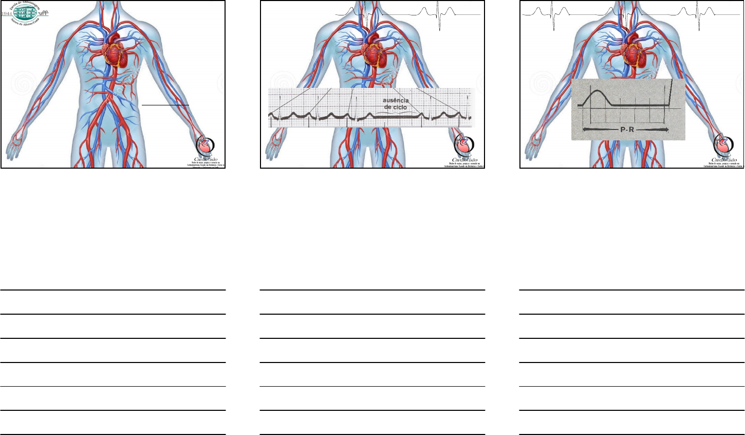 20/12/2017 1 Bloqueios Dalmo MachadoDalmo MachadoDalmo MachadoDalmo Machado RN, MSN, PhD(s) Professor Adjunto dalmomachado.uff@gmail.com 2 R itmo Bloqueios / Bloqueio SA •O bloqueio SA faz com que o marcapasso pare por um ciclo ou mais, retornando em seguida •Ondas P idênticas antes e depois do bloqueio 3 R itmo Bloqueios / Bloqueio AV •BAV 1º Grau –Intervalo P-R > 0,20 seg 20/12/2017 2 4 R itmo Bloqueios / Bloqueio AV •BAV 2º Grau –Mobitz I: Aumento progressivo de intervalo P-R até que P não conduza a um QRS Fenômeno Wenckebach 5 R itmo Bloqueios / Bloqueio AV •BAV 2º Grau –Mobitz II: São necessárias mais de uma onda P (2 ou 3) para conduzir a um QRS BAV 2º GRAU MOBITZ II 2:1 BAV 2º GRAU MOBITZ II 3:1 6 R itmo Bloqueios / Bloqueio AV •BAV 3º Grau –A freqüência atrial e ventricular são independentes –Se o QRS tem aspecto normal é denominado ritmo idionodal –Se o QRS tem aspecto largo e bizarreo é denominado ritmo idioventricular –Denominado BAV-T (total) 20/12/2017 3 7 R itmo Bloqueios / Bloqueio de Ramo •Um ventrículo se despolariza pouco antes do outro fazendo com que os dois QRS se fundam •Intervalo R-R´ > 0,12 seg se despolariza pouco antes do outro fazendo com que os dois QRS se fundam BRD V1 e V2 BRE V5 e V6 R itmo Bloqueios / Bloqueio de Ramo Direito •Causas –Isquemia do sistema de condução por doença coronária –Defeitos congênitos do septo membranoso –Cardiomiopatias –Doença de Chagas –Inflamação / infecção do músculo cardíaco –Sequelas de cirurgias cardíacas –Lesões valvulares aórticas –Lesão tricúspide –Hipertensão arterial 8 R itmo Bloqueios / Bloqueio de Ramo Direito •BRD 1º Grau –Pequeno grau de alentecimento no ramo direito do FH –Pequeno entalhe na porção terminal da onda S em V1 –Onda S acentuada em V5 e V6 9 20/12/2017 4 R itmo Bloqueios / Bloqueio de Ramo Direito •BRD 2º Grau –Alentecimento moderado da condução pelo ramo direito –Onda R´ secundária em V1 > a primeira onda r –Onda S proeminente com alargamento terminal em V5 e V6 10 R itmo Bloqueios / Bloqueio de Ramo Direito •BRD 3º Grau –Complexo rsR´com ondas R alargada e entalhgada em V1 –QRS > 0,12 seg –Onda S alargda em V5, V6 e DI –Onda T ao contrário do QRS –Onda T invertida e R´em V1 11 R itmo Bloqueios / Bloqueio de Ramo Esquerdo •Causas –Hipertensão arterial –Doença coronariana –Doenças oro-valvulares –Doença de Lev Lenègre 12