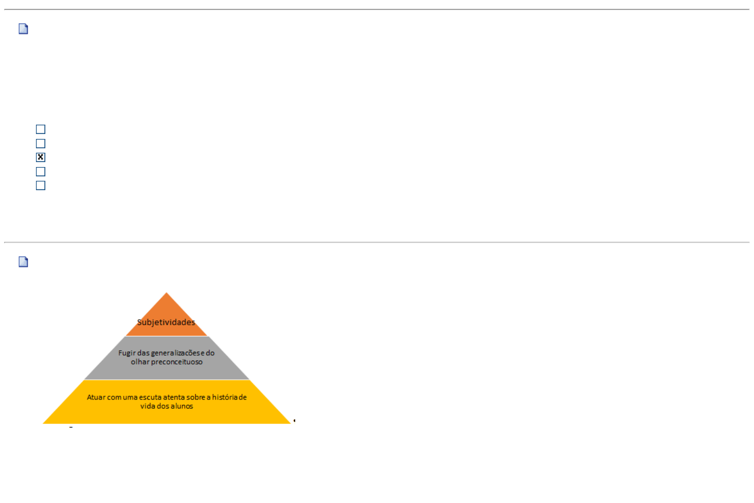 1a Questão (Ref.: 202008696658) Partindo de nossas conversas sobre a utilização das tecnologias na sala de aula da EJA, avalie as asserções abaixo: I. O professor precisa diagnosticar a forma com que os alunos utilizam e se apropriam das novas tecnologias. Porque II. Pode fortalecer os mecanismos de inclusão social e educacional. As asserções I e II são proposições falsas, a número I não possui relação com a número II. As asserções I e II não são proposições verdadeiras. As asserções I e II são proposições verdadeiras, e a II justifica a número I. A número II é uma proposição falsa, I e II são proposições verdadeiras. Não existem relações entre as asserções I e II. 2a Questão (Ref.: 202008695622) Observe o esquema abaixo: I. Essa ilustração reforça a valorização da diversidade. II. A diversidade não pode ser pautada na subjetividade. III. A escuta é algo primordial da EJA, ouvir e entender os diferentes lugares. javascript:alert('C%C3%B3digo da quest%C3%A3o: 6057557\n\nStatus da quest%C3%A3o: Liberada para Uso.'); javascript:alert('C%C3%B3digo da quest%C3%A3o: 6056521\n\nStatus da quest%C3%A3o: Liberada para Uso.'); IV. Generalizar é sempre importante. Podemos dizer que as opções corretas são: IV e III II e IV I e III I e II II e III 3a Questão (Ref.: 202010454806) Nas décadas de 40 e 50 do século XX houve determinantes políticos e pedagógicos de âmbitos Internacionais e Nacionais que apontaram para a necessidade social do ensino da EJA. Neste sentido, temos no cenário Internacional a atuação da UNESCO que apoia a primeira política pública nacional oferecida a população brasileira não escolarizada, iniciada em 1947. Assinale a alternativa que apresenta, corretamente, esta política pública. FUNABEM. MOBRAL. Brasil leitor. CEAA. Pátria Alfabetizadora. 4a Questão (Ref.: 202010454805) A nova concepção da EJA nos finais da década de 50 e início da década de 60, deram um salto qualitativo em relação às primeiras Campanhas de erradicação do analfabetismo lançadas pelo Governo. A afirmativa acima se refere especificamente: A importância do repasse dos conteúdos e da formação profissional. A importância do novo modelo agronômico econômico. A importância do SESI e do SENAI. A importância do MOBRAL. A importância de Paulo Freire javascript:alert('C%C3%B3digo da quest%C3%A3o: 7815705\n\nStatus da quest%C3%A3o: Liberada para Uso.'); javascript:alert('C%C3%B3digo da quest%C3%A3o: 7815704\n\nStatus da quest%C3%A3o: Liberada para Uso.'); 5a Questão (Ref.: 202006800432) Em "A Pedagogia da Esperança: um reencontro com a Pedagogia do Oprimido", publicado em 1992 Freire afirma que: Diante de novos métodos, a educação bancária foi, definitivamente, extinta. A pós-modernidade é conservadora e é dever da educação manter e reproduzir esse conservadorismo É possível educar de forma mecânica. Educação e política não se misturam, pois uma é a antítese da outra. Uma defesa da tolerância não se confunde com a conivência. 6a Questão (Ref.: 202006788473) Uma nova perspectiva de avaliação exige do educador a concepção de que os estudantes são: I. Sujeitos do seu próprio desenvolvimento dentro do contexto de sua realidade social e política; II. Sujeitos que devem ser sempre avaliados pela pedagogia do exame; III. Seres autônomos, intelectual e moralmente, capazes e livres para tomar suas próprias decisões. Estão corretas as afirmativas: Apenas III Apenas II Apenas I I, II e III Apenas I e III 7a Questão (Ref.: 202006872370) Considerando a trajetória histórica da EJA em nosso país, assinale a alternativa que possui maior relação com o contexto nacional da ditadura civil militar. javascript:alert('C%C3%B3digo da quest%C3%A3o: 4161331\n\nStatus da quest%C3%A3o: Liberada para Uso.'); javascript:alert('C%C3%B3digo da quest%C3%A3o: 4149372\n\nStatus da quest%C3%A3o: Liberada para Uso.'); javascript:alert('C%C3%B3digo da quest%C3%A3o: 4233269\n\nStatus da quest%C3%A3o: Liberada para Uso.'); Com a LDB 9394/96, a nomenclatura Ensino Supletivo passa para a EJA e reduziu-se a idade para a realização dos exames em relação à Lei 5692/71. A Constituição Federal de 1988 ampliou o direito de acesso à educação fundamental para todos os cidadãos, independente da idade. Durante o período militar foram realizadas grandes campanhas nacionais e com a Lei 5379, de 15 de dezembro de 1967 foi criado o MOBRAL, as primeiras da história para alfabetizar adultos. A educação de jovens e adultos foi reconhecida e recebeu um tratamento particular, pela primeira vez, quando o Plano Nacional de Educação, previsto pela Constituição Federal de 1988. Projetos como o de Paulo Freire mudam a metodologia do ensino de adultos, mas foram abandonados por projetos, que foram chamados de projetos de formação de cidadania como objetivo central do EJA, como o MOBRAL. 8a Questão (Ref.: 202006869411) A Constituição Federal e a Lei de Diretrizes e Bases da Educação Nacional oferecem subsídios para a elaboração das normas para o sistema de ensino do Distrito Federal, expressas na Resolução n.º 1/2012. Com base nessa resolução e em suas alterações, julgue o item que está correto a seguir. A educação de jovens e adultos (EJA) é uma modalidade da Educação básica. EJA é parte do ensino básico do campo, região com distorção grave idade-série; EJA é uma modalidade de Educação profissional. O EJA inclui os projetos de alunos que ficam reprovados e saem das turmas regulares para turmas de projeto. EJA são um conjunto de modalidades inseridas no comando da secretaria de educação que pode escolher. 9a Questão (Ref.: 202006788423) De acordo com as Diretrizes Curriculares Nacionais para a educação de jovens e adultos, essa modalidade da educação básica deve desempenhar diversas funções, das quais é possível destacar: I. Reparadora, que reconhece a igualdade antológica de todo ser humano 