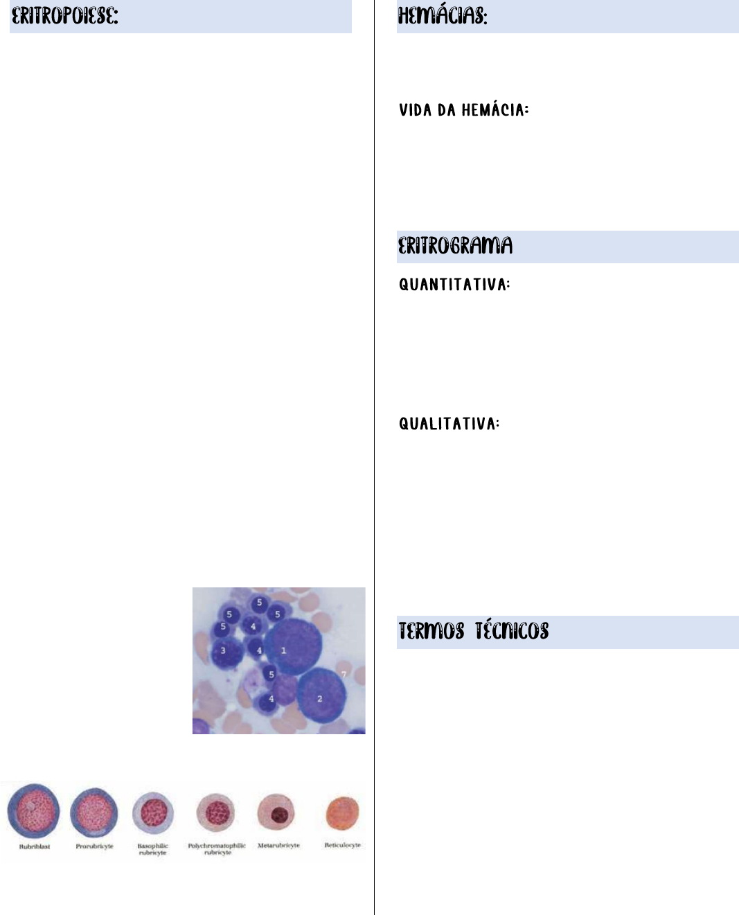 Hematologia Paola Henning • Produção de hemácias acontece na medula óssea • Estimulada pela liberação de eritropoietina pelo rim e medula óssea e por interleucinas e intensificada por outras substâncias como tiroxina, GH, corticoides. Rubriblasto: mais imaturo. (célula grande, citoplasma basofílico, núcleo arredondado formado de cromatinana, nucléolos e anéis nucleares bem evidentes) Pré- rubricitos: semelhante a anterior, porém não apresentam nucléolo e nem anel nuclear. Rubrícitos basofílicos: (células menores e com cromatina mais condensada). Rubrícitos policromáticos: (nesta fase ocorre a maior parte da síntese de hemoglobina e o citoplasma é mais acinzentado). Metarrubrícito: (fase de multiplicação e maturação). Na fase de maturação possuem núcleo picnótico e citoplasma semelhante ao do eritrócito maduro, porém um pouco mais azulado. Reticulócito: ainda apresenta na sua estrutura agregados de organelas (ribossomos, mitocôndrias, complexo de golgi) Eritrócitos maduros: hemácias maduras Função: Transporte de 02 e C02 ligados a hemoglobina • Sua destruição ocorre no baco - hemocaterese (destruição de hemácias envelhecidas) • Vida útil média de 110 dias • He: Hemácias • Ht%: Hematócrito • Hb: Concentração de Hemoglobina • Presença de células jovens • VCM: Volume corpuscular (globular) médio • HCM: Hemoglobina corpuscular (globular) média - peso da hemoglobina dentro das hemácias • CHCM: Concentração de hemoglobina corpuscular (globular) • Anemia x Policitemia: poucas hemácias x muitas hemácias • Hipocrômica x hipercrômica x normocrômica: pouco corada x bem corada x cor normal • Microcítica x Macrocítica x Normocítica: célula pequena x célula grande x célula normal • Anisocitose: tamanhos diferentes • Poiquilocitose: muita alteração de tamanho • Policromasia: variação de coloração • Acantócitos: apresentam espículas de tamanho irregular e maiores o Causas: alterações relacionadas ao colesterol e fosfolipídios nas membranas dos eritrócitos. Observados em animais com enfermidades hepáticas e hemangiosarcoma. Também associados com anormalidades lipídicas induzidas por disfunções renais • Equinócitos: apresentam espículas de tamanho uniforme o Causas: Artefato, drogas, doença renal, envenenamento por serpentes, queimaduras graves em cavalos e por picadas de abelhas • Ecentrócitos: hemoglobina concentrada em um dos polos, o outro polo pálido. o Causas: Esta alteração de deve a oxidação da membrana celular do eritrócito. • Queratócitos: cornos. • Esquizócitos: são fragmentos de eritrócitos que surgem devido à deterioração mecânica na circulação por anormalidades microvasculares. o Causas: observados em animais com quadro de coagulação intravascular disseminada • Esferócitos: eritrócitos em forma esférica- o Causas: animais com anemia hemolítica imunomediadas. • Codócitos: apresentam uma área central de coloração aumentada no meio da área de palidez do citoplasma. Corpúsculo de Heinz: oxidação da hemoglobina - Corpúsculos de Heinz podem ser vistos em hemácias de gatos saudáveis. Corpúsculo de Howell Jolly: restos de fragmentos nucleares que não foram totalmente eliminados no processo da eritropoiese Granulação basofílica: restos citoplasmáticos – reticulócitos Corpúsculo de Lentz (inclusões da Cinomose): inclusão eosinofílica que pode ser observada no citoplasma de hemácias e leucócitos.