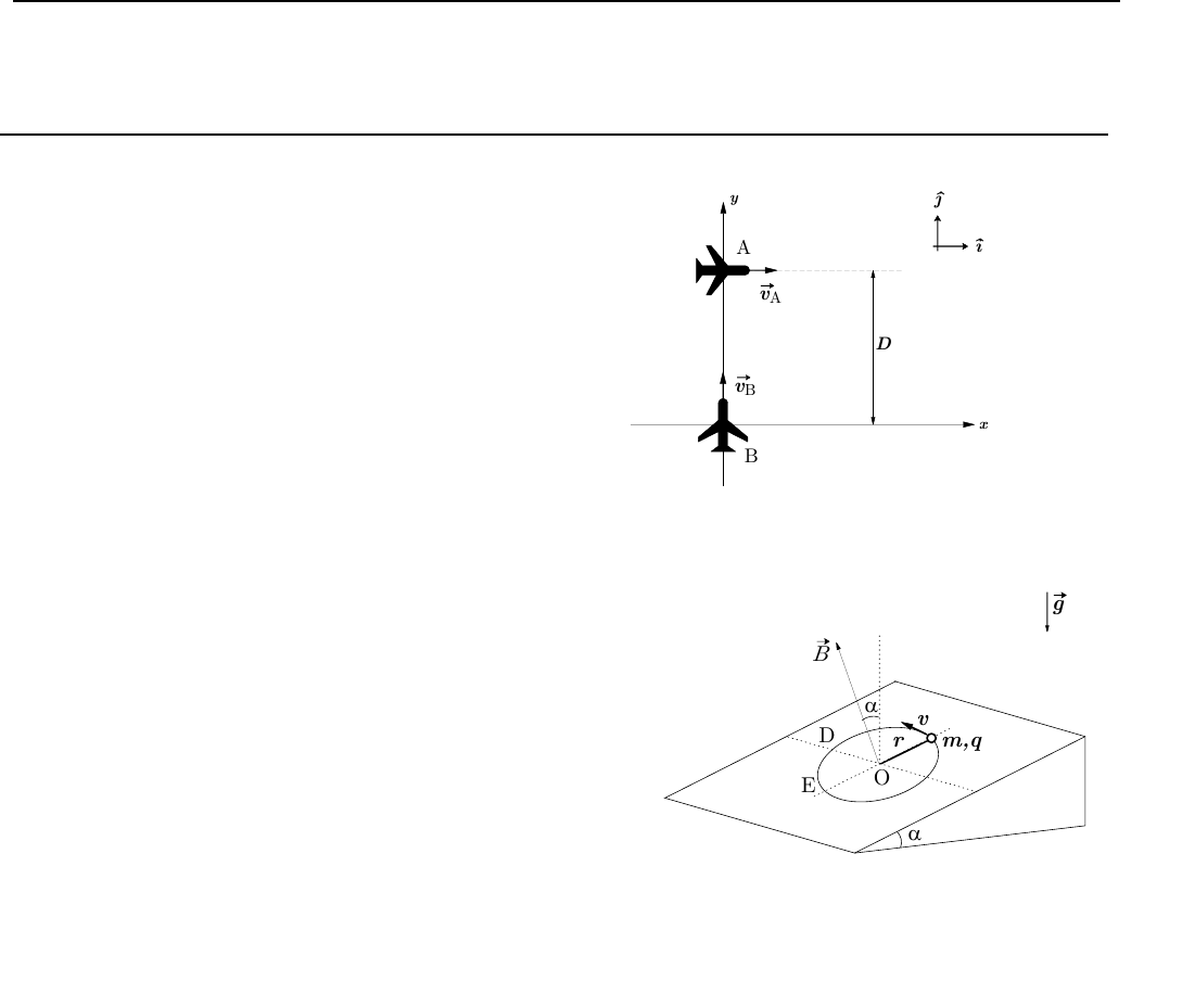 FÍSICA Quando necessário, considere as seguintes constantes: Aceleração local da gravidade g = 10 m/s2. Densidade da água 1,0 g/cm3. Calor de vaporização da água 2400 kJ/kg. Velocidade da luz no vácuo c = 3,0×108 m/s. Constante universal da gravitação G. Constante de Planck h. Questão 1. Dois aviões de combate, A e B, viajam a uma mesma altitude com velocidades constantes ~vA=(100 m/s)̂i e ~vB=(200 m/s)ĵ , respectivamente. A figura ilustra as posições dos aviões no instante t=0 s, que estão separadas por uma distância D=100 m. Devido ao funcionamento de sua turbina, o avião A emite um som de frequência carac- teŕıstica de 1000 Hz. A velocidade do som na região onde se encontram os aviões é de 300 m/s. Com base nessas informações, calcule: (a) a distância mı́nima entre os dois aviões ao longo do movimento; (b) a frequência percebida no instante t=0 s, pelo piloto do avião B, devido ao som da turbina do avião A. D y A x B vB vA i ĵ ^ Questão 2. Uma pequena esfera de massa m e carga +q está conectada por um fio inextenśıvel preso num ponto O e se move num ćırculo de raio r sobre um plano liso de inclinação α com a horizontal. Na região existe um campo magnético ~B uniforme e constante, perpendicular ao plano inclinado como ilustra a figura. Se a esfera possui uma velocidade ~v no ponto mais alto da trajetória, determine a tração no fio quando a esfera passa pelas posições D e E indicadas na figura. Considere o sentido de ~v indicado na figura. E g v a a m,qD O B r Questão 3. Considere dois corpos celestes esféricos e uniformes, de raios R1 e R2, massas m1 e m2, respectivamente, cujos centros encontram-se inicialmente em repouso, a uma distância r0. Devido à interação gravitacional mútua, os corpos iniciam um movimento de aproximação, que dura até o choque entre eles. Determine as velocidades finais dos corpos na iminência da colisão em função de G, r0, seus raios e suas massas. Questão 4. Um maratonista de 80 kg corre meia hora, em local protegido do Sol, mantendo veloci- dade constante de 20 km/h. O trabalho exigido pelo exerćıcio, por unidade de massa e distância, é de 0,60 kcal/(kg.km). Desconsiderando o efeito de ganho ou perda de calor por radiação de corpo negro, faça o que se pede, levando em conta que 1,0 cal = 4,2 J. (a) Calcule o trabalho total dispendido, em kJ, no exerćıcio. (b) Define-se a eficiência do exerćıcio como a razão entre o trabalho realizado e o custo metabólico total do exerćıcio, que é a energia total consumida pelo organismo. Considerando que a eficiência da corrida descrita é de 60%, calcule o volume de água que precisa ser evaporado para manter constante a temperatura do corpo do atleta. 2 Questão 5. A figura mostra uma barra AB de compri- mento L, articulada na extremidade A e presa a uma parede por um cabo BC. Na extremidade B da barra, suspende-se uma massa m por uma corda. O ângulo entre o cabo BC e a barra é dado por θ1, e o ângulo entre a barra e a corda que suspende a carga é dado por θ2, como mostra a figura. A barra, o cabo e a corda têm massas despreźıveis. Deter- mine, em termos das grandezas f́ısica envolvidas: bla bla bbla (a) o ângulo φ entre a barra AB e a força ~F , exercida pela articulação sobre a barra; (b) a intensidade da força ~F . L g F mA Bq1 q2f C Questão 6. Um fio tem uma de suas extremidades presa ao teto e suspende um bloco de densidade ρ=10ρa, em que ρa representa a densidade da água. Na configuração descrita, v0 é a velocidade de propagação de ondas mecânicas no fio. Em seguida, o bloco é mergulhado gradativamente em um recipiente contendo água, como mostra a figura, até ficar completamente submerso. Em nenhum momento o bloco toca as laterais e o fundo do recipiente. Denote por f a fração do bloco submersa em água. g m (a) Calcule a expressão da velocidade de propagação v das ondas mecânicas no fio em função de f e v0. (b) Esboce um gráfico que descreva o comportamento de (v/v0) 2 em função de f . Questão 7. Dois feixes de comprimento de onda λ, paralelos e de intensidade I0, incidem com inclinação θ = 60o com a vertical sobre dois espelhos horizontais, conforme ilustra a figura. O espelho superior encontra-se fixo enquanto o inferior, de massa m, está ligado a uma mola de constante elástica k e realiza um movimento oscilatório de pequena amplitude. O espelho inferior é liberado para oscilar em t=0 µs, a partir do repouso e da posição na qual a mola está relaxada. Os feixes são refletidos pelos espelhos e analisados em um detector, que registra a intensidade da onda resultante da superposição dos feixes. Os resultados coletados são mostrados no gráfico a seguir. Com base nas informações fornecidas, determine o maior valor posśıvel de λ. I0 k g m I0 em iss or detector q In te n si d ad e 4I0 0 tempo (ms)1 3 5 3 Questão 8. Um anel circular de raio R e densidade li- near de carga elétrica λ está localizado no plano yz com o seu centro na origem do sistema de coordenadas O, como mostra a figura. Uma part́ıcula de massa m e carga q é projetada a partir do ponto P (− √ 3R, 0, 0) em direção ao ponto O, com velocidade inicial v. Qual o menor valor de v para que a part́ıcula não retorne ao ponto P? y x z R O P Questão 9. Uma espira circular condutora de raio R, feita de um fio fino de resistividade elétrica ρ e massa espećıfica ρm, cuja secção transversal tem diâmetro d, está caindo, com velocidade v variável, sob a ação da gravidade, em uma região de campo magnético não uniforme. A com- ponente vertical do campo magnético obedece a relação Bz=B0(1 + kz), em que B0 e k são constantes f́ısicas de unidade adequadas e z é a coordenada vertical. A espira mantém-se sempre paralela ao plano xy, como mostra a figura. Desprezando os efeitos da resistência do ar no mo- vimento de queda da espira, faça o que se pede nos itens a seguir. z y x d R B (a) Calcu