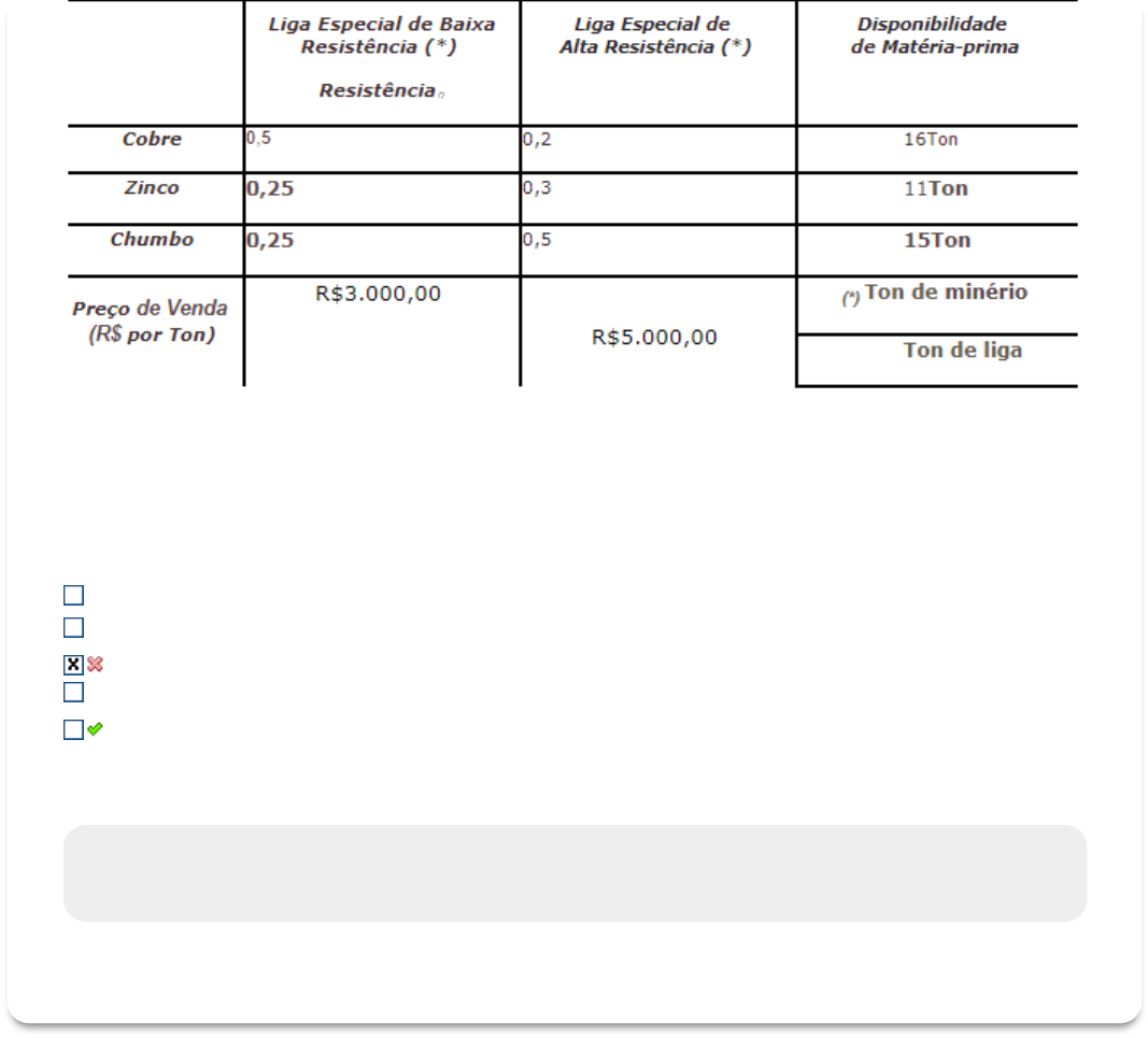 23/05/2023, 08:50 UNIFANOR: Alunos https://simulado.unifanor.com.br/alunos/ 8/8 A variável de decisão para a modelagem deste problema é xi, que indica a quantidade em toneladas produzidas da liga especial de baixa resistência (i = 1) e da especial de alta resistência (i = 2). Assim, para a solução ótima deste problema, a produção de ligas especiais de alta resistência pela metalúrgica deve ser de: Fonte: Adaptado de Goldbarg e Luna (2005, p. 36) 31,4 45,4 100,4 11,4 1,4 Respondido em 13/03/2023 09:56:21 Explicação: A resposta certa é: 1,4