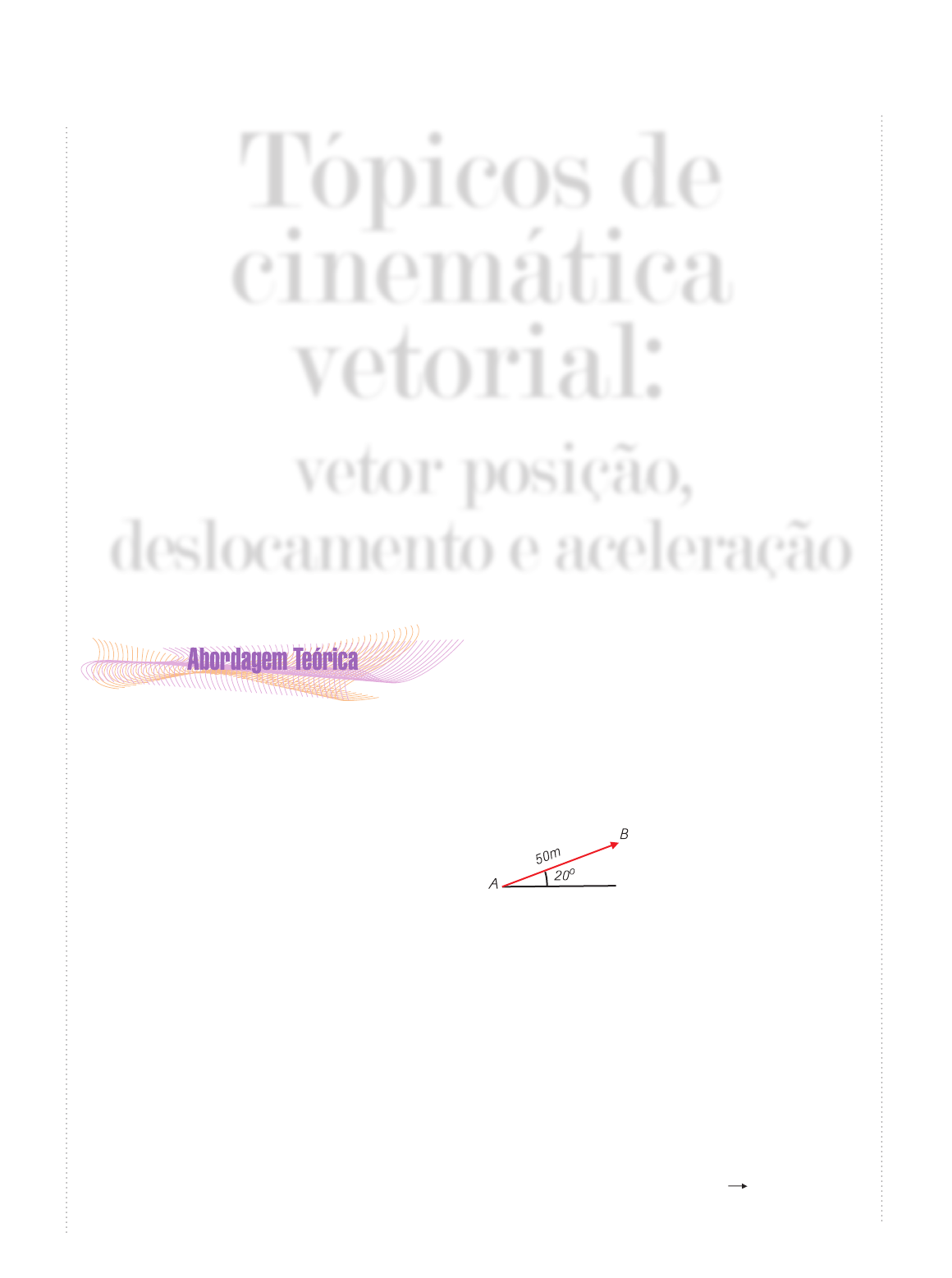 Tópicos de cinemática vetorial: vetor posição, deslocamento e aceleração Algumas grandezas físicas, para que fiquem completamente definidas, necessitam, além de um número e de uma unidade de medida, informações referentes a direção e sentido. Essas grandezas são chamadas de vetoriais e são representadas por entes matemáticos conhecidos por vetores. Teremos neste tópico uma rápida introdução ao estudo dos vetores. Grandezas escalares Certas grandezas físicas como comprimento, massa, tempo, temperatura, área, volume e outras, ficam perfeitamente definidas por um número (inten- sidade ou módulo) e uma unidade de medida. Essas grandezas são denominadas grandezas escalares. Quando, por exemplo, dizemos que o compri- mento de nossa rua é de 35m, conseguimos transmitir uma ideia completa a quem nos ouve; nada mais há o que indagar, pois foram fornecidos um número, que é o módulo ou intensidade da grandeza comprimento (35) e uma unidade de medida (metro). Grandezas vetoriais Quando alguém se desloca de uma posição para outra, não basta dizer que percorreu, por exemplo, 50m. Para que a ideia fique completa, há necessidade de se especificar além do módulo (50) e da unidade de comprimento (m) também a direção e o sentido em que o deslocamento se realizou. Quando um corpo sofre um deslocamento de uma posição A para uma posição B, essa mudança de posição é definida pelo segmento orientado AB, que une a posição inicial A à posição final B, como mostra a figura a seguir: Módulo: AB — = 50m Direção: 20° com a horizontal Sentido: de A para B As grandezas que, para ficarem completamen- te caracterizadas, necessitam que especifiquemos módulo, direção e sentido são chamadas grandezas vetoriais (velocidade, aceleração, força etc.). Para representá-las usamos um ente matemático chama- do vetor. Vetor: conceito e notação Dois segmentos orientados que têm módulos, direções e sentidos iguais são chamados equipolen- tes. Ao conjunto dos infinitos segmentos equipolen- tes a um dado segmento orientado AB chamamos vetor AB e representamos por AB, como ilustrado na figura: 1 Chamando de → v este conjunto infinito, pode-se escrever que o vetor v é o conjunto de todos os seg- mentos XY, tais que XY seja equipolente ao segmento AB; ou seja: → v = → AB = {XY/XY e qAB} Dessa forma, um mesmo → v determina infinitos segmentos orientados, chamados representantes de → v e todos equipolentes entre si. Na prática, no entan- to, embora lidando em realidade com representantes de vetores, usa-se indiscriminadamente o nome vetor para cada um desses representantes. O → v é caracterizado pelos mesmos módulo, di- reção e sentido dos infinitos segmentos orientados equipolentes entre si e por ele representados. Operações com vetores Multiplicação por um número ou escalar Ao se multiplicar um vetor → a por um escalar (número) n, obtém-se um vetor → na de módulo igual ao produto dos módulos, de direção igual à de → a e de sentido ou igual (se n>0), ou contrário (se n<0) ao de → a ; ou seja: Soma de vetores Há dois processos gráficos para somarmos vetores: a Regra do Paralelogramo e a Regra do Polígono. Regra do Paralelogramo Seja a soma dos vetores abaixo: b 1.º passo: Considerar dois outros representantes dos vetores dados que tenham origem comum. Pela extremidade de cada um traçar uma paralela ao outro, de modo a formar um paralelogramo. O vetor soma está na diagonal que passa na origem comum, que é também a origem do vetor soma, como ilustrado na figura abaixo: 2.º passo: Para calcular o módulo S do vetor soma, basta aplicar a lei dos cossenos ao triângulo da direita na figura acima, observando que, nesse triângulo, o lado tracejado tem medida igual ao mó- dulo de → a, que vale a = 3, pois o quadrilátero é um paralelogramo e, como tal, são iguais os lados opos- tos; ainda, por serem os ângulos e suplementares, tem-se –cos = cos . Daí: S2= a2+b2 – 2ab. cos S2= a2+b2 + 2ab. cos Substituindo os valores dos módulos dos vetores da figura acima, e admitindo ainda ser = 120°, vem: S2=32 + 42 + 2 (3)(4) cos 120° S2=9 + 16 + 2 (3)(4)(-1/2) = 25 – 12 = 13 S = 13 3,61 Regra do Polígono A vantagem dessa regra sobre a do paralelogra- mo é a potencialidade de somar simultaneamente vários vetores (Para mais de dois vetores, a regra do paralelogramo impõe que sejam somados dois primeiramente; o vetor soma obtido deve ser somado com um dos demais, e assim sucessivamente). A regra consiste em desenhar um representante do 1.º vetor e, pela extremidade deste, desenhar um representante do próximo vetor a somar, e assim por diante. O vetor soma (ou vetor resultante) é obtido ligando-se a origem do primeiro dos representantes com a extremidade do último. O vetor resultante, as- sim, completará uma poligonal fechada, “fechando” o polígono, o que deu nome à regra (regra do polígono). Retornando ainda à figura, vê-se que, no caso de dois vetores, as duas regras se equivalem (observando o triângulo da esquerda, o lado tracejado pode ser visto como representante de → b. Veja agora como aplicar a regra a vários veto- res: 2 Pela extremidade de cada vetor, trace o seguin- te. Para obter a resultante, ligue a primeira origem com a última extremidade. Não há fórmula para calcular o módulo do vetor resultante. Diferença de vetores Para subtrair dois vetores, soma-se o vetor minuendo ao vetor subtraendo multiplicado por –1. Note o exemplo, em que se deseja encontrar o vetor → D = → a – → b : Somando os vetores → a e – → b pela regra do pa- ralelogramo, obtém-se o representante em preto do vetor → D. Ocorre, entretanto, que em vermelho tem-se outro representante do mesmo vetor, em consequ- ência da congruência dos triângulos retângulos da figura. Isso nos permite enunciar a seguinte regra prática para subtrair dois vetores: Considerar dois outros representantes dos • vetores d