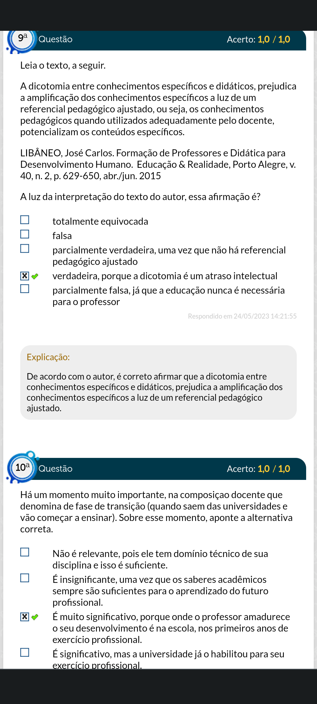 Leia o texto, a seguir. A dicotomia entre conhecimentos específicos e didáticos, prejudica a amplificação dos conhecimentos específicos a luz de um referencial pedagógico ajustado, ou seja, os conhecimentos pedagógicos quando utilizados adequadamente pelo docente, potencializam os conteúdos específicos. José Carlos. Formação de Professores e Didática para Desenvolvimento Humano. Educação & Realidade, Porto Alegre, V. 40, n. 2, p. 629-650, abr./jun. 2015 A luz da interpretação do texto do autor, essa afirmação é? totalmente equivocada falsa parcialmente verdadeira, uma vez que não há referencial pedagógico ajustado verdadeira, porque a dicotomia é um atraso intelectual parcialmente falsa, já que a educação nunca é necessária para o professor