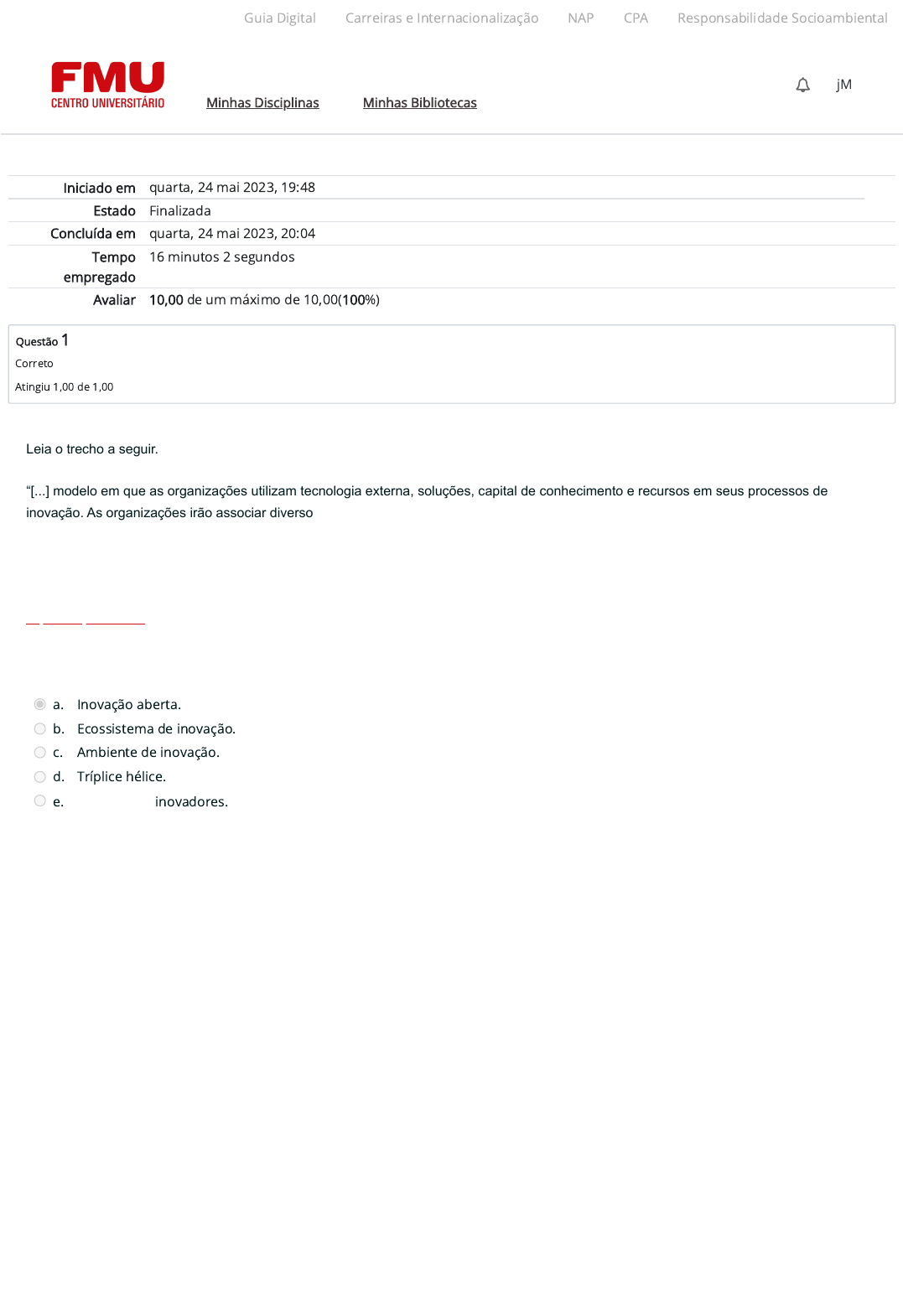 24/05/2023, 20:04 Atividade 4 (A4): Revisão da tentativa https://ambienteacademico.com.br/mod/quiz/review.php?attempt=2296635&cmid=783873 1/6 Iniciado em quarta, 24 mai 2023, 19:48 Estado Finalizada Concluída em quarta, 24 mai 2023, 20:04 Tempo empregado 16 minutos 2 segundos Avaliar 10,00 de um máximo de 10,00(100%) Questão 1 Correto Atingiu 1,00 de 1,00 Leia o trecho a seguir. “[...] modelo em que as organizações utilizam tecnologia externa, soluções, capital de conhecimento e recursos em seus processos de inovação. As organizações irão associar diversos atores em um ecossistema para desenvolver conjuntamente novas plataformas e aplicações, melhorar as operações básicas ou expandir para novos mercados. Este conceito permite que as empresas olhem além de suas paredes para trazer ideias de forma mais rápida e também economizar tempo e dinheiro [...]”. LAMOUNIER, F. Inovação aberta. StartSe, 27 set. 2017. Disponível em: https://bit.ly/35FE1nW. Acesso em: 20 dez. 2019. Assinale a alternativa que indica o conceito de inovação descrito no trecho supracitado. a. Inovação aberta. b. Ecossistema de inovação. c. Ambiente de inovação. d. Tríplice hélice. e. Stakeholders inovadores. Guia Digital Carreiras e Internacionalização NAP CPA Responsabilidade Socioambiental Minhas Disciplinas Minhas Bibliotecas jM https://bit.ly/35FE1nW https://codely-fmu-content.s3.amazonaws.com/Moodle/GuiaDigital/Guia+digital/index.html https://carreiras.fmu.br/ https://codely-fmu-content.s3.amazonaws.com/Moodle/NAP/inicial/nap/fmu/index.html https://codely-fmu-content.s3.amazonaws.com/Moodle/CPA/landing_CPA/index.html https://portal.fmu.br/sustentabilidade https://ambienteacademico.com.br/ https://ambienteacademico.com.br/ https://ambienteacademico.com.br/course/view.php?id=236 24/05/2023, 20:04 Atividade 4 (A4): Revisão da tentativa https://ambienteacademico.com.br/mod/quiz/review.php?attempt=2296635&cmid=783873 2/6 Questão 2 Correto Atingiu 1,00 de 1,00 Questão 3 Correto Atingiu 1,00 de 1,00 Para sobreviver e destacar-se no mercado, a busca pelo diferencial é essencial, e isso vale para todos os nichos produtivos. Um caso famoso foi sobre o Cirque du Soleil. Na época da sua criação, existia um grande domínio do circo pertencente aos Ringling Brothers, que seguia a linha mais tradicional de espetáculos circenses. O Cirque du Soleil mudou a compra dos ingressos, a chegada no local do evento, o ambiente do espetáculo e aboliu o uso de animais, por exemplo. Kim e Mauborgne (2015, p. 4) afirmam que: “O Cirque Du Soleil não concorreu com o Ringling Brothers and Barnum & Bailey’s Circus para chegar ao topo. Em vez disso, criou um novo circo, tornando irrelevante a concorrência”. KIM, W. C; MAUBORGNE, R. A estratégia do oceano azul – Como criar novos mercados e tornar a concorrência irrelevante. Rio de Janeiro: Elsevier, 2005. O caso exposto no enunciado ilustra uma estratégia de inovação focada na dimensão. Assinale a alternativa que indica qual. a. Presença. b. Marca. c. Experiência do cliente. d. Cadeia de fornecedores. e. Plataforma. Ao longo da história, o Brasil já teve vários grandes inventores famosos. Um dos mais geniais e reconhecidos mundialmente é Santos Dumont. Um dos seus aviões, o Demoiselle, na época o menor do mundo, embrião dos atuais ultraleves, tem domínio público, ou seja, pode ser livremente utilizável por qualquer pessoa. Dumont acreditava que assim incentivaria o desenvolvimento da aviação nacional. Dentre outras invenções do aeronauta, destacam-se: o dirigível e o relógio de pulso. Assinale a alternativa que classifica corretamente essas duas invenções. a. Dirigível - patente de invenção; relógio de pulso - modelo de utilidade b. Dirigível - desenho industrial; relógio de pulso - modelo de utilidade c. Dirigível - patente de invenção; relógio de pulso - patente de invenção d. Dirigível - modelo de utilidade; relógio de pulso - patente de invenção e. Dirigível - modelo de utilidade; relógio de pulso - modelo de utilidade Guia Digital Carreiras e Internacionalização NAP CPA Responsabilidade Socioambiental Minhas Disciplinas Minhas Bibliotecas jM https://codely-fmu-content.s3.amazonaws.com/Moodle/GuiaDigital/Guia+digital/index.html https://carreiras.fmu.br/ https://codely-fmu-content.s3.amazonaws.com/Moodle/NAP/inicial/nap/fmu/index.html https://codely-fmu-content.s3.amazonaws.com/Moodle/CPA/landing_CPA/index.html https://portal.fmu.br/sustentabilidade https://ambienteacademico.com.br/ https://ambienteacademico.com.br/ https://ambienteacademico.com.br/course/view.php?id=236 24/05/2023, 20:04 Atividade 4 (A4): Revisão da tentativa https://ambienteacademico.com.br/mod/quiz/review.php?attempt=2296635&cmid=783873 3/6 Questão 4 Correto Atingiu 1,00 de 1,00 Questão 5 Correto Atingiu 1,00 de 1,00 Questão 6 Correto Atingiu 1,00 de 1,00 Equipe da Agência Espacial Brasileira (AEB), a Thales Alenia Space (TAS) e a Opto S&DA firmaram uma parceria de transferência de tecnologias críticas para capacitar engenheiros brasileiros a projetar e desenvolver instrumentos ópticos de alta resolução para os satélites de observação da Terra. Foram contempladas diversas áreas, como propulsão, potência elétrica, controle térmico, estruturas e eletrônica embarcada. BRASIL. Agência Espacial Brasileira. Parceria da AEB promove transferência tecnológica de instrumentos ópticos para satélites, 4 set. 2019. Disponível em: http://www.aeb.gov.br/parceria-da-aeb-promove-transferencia-tecnologica-de-instrumentos-oticos-para-satelites/. Acesso em: 20 dez. 2019. Assinale a alternativa que aponta uma das justificativas do uso da transferência tecnológica. a. As empresas buscam sempre terceirizar o desenvolvimento tecnológico. b. As empresas precisam proteger seus segredos industriais. c. As empresas desejam incentivar a �lantropia na sua região. d. As empresas usam apenas a inovação aberta como metodologia